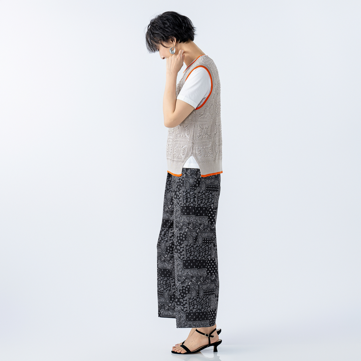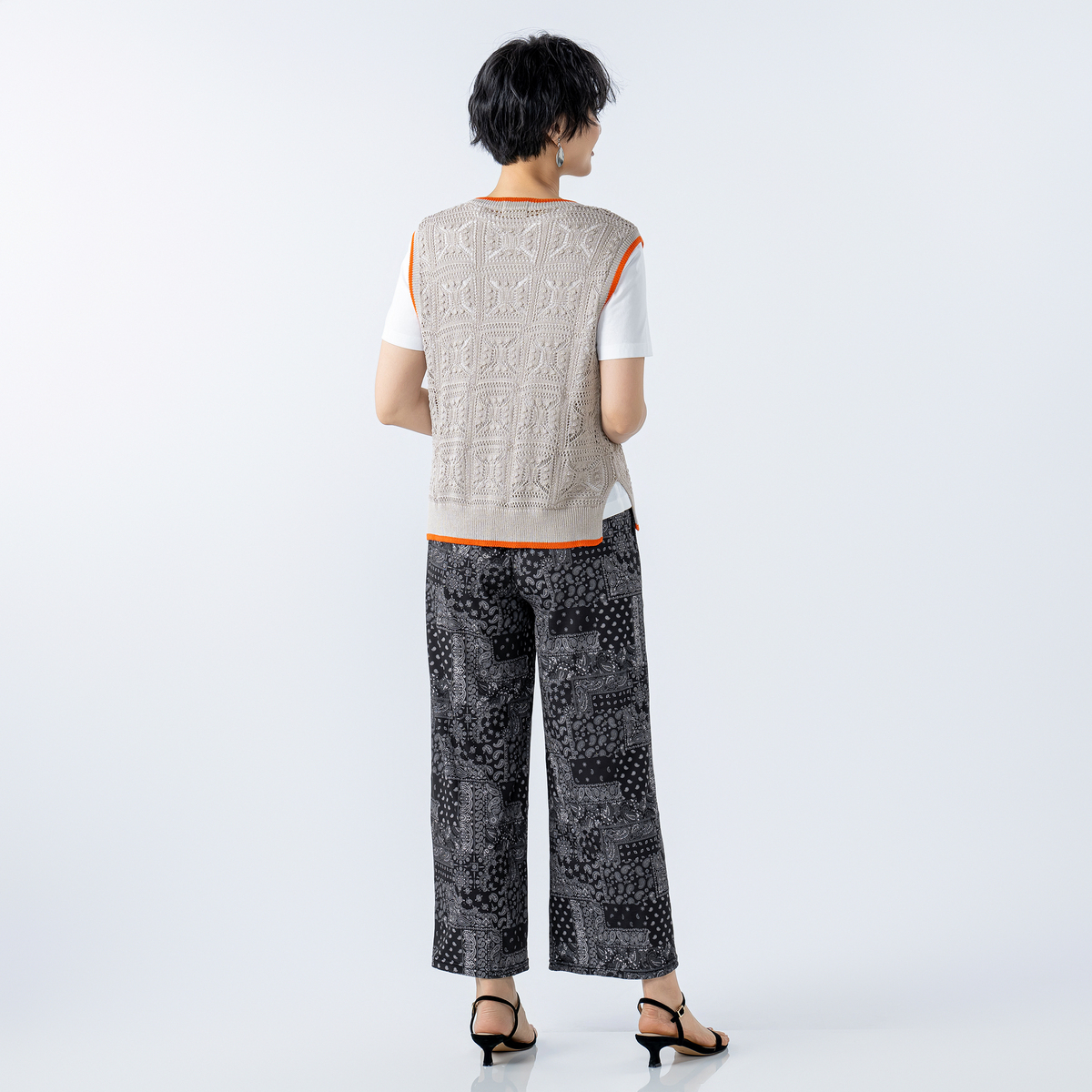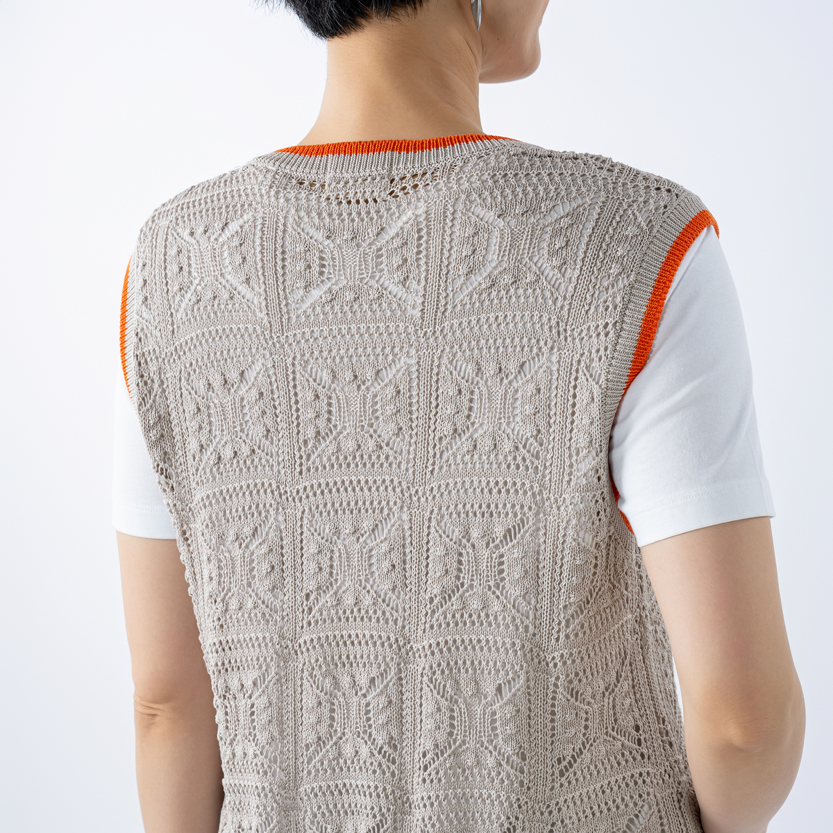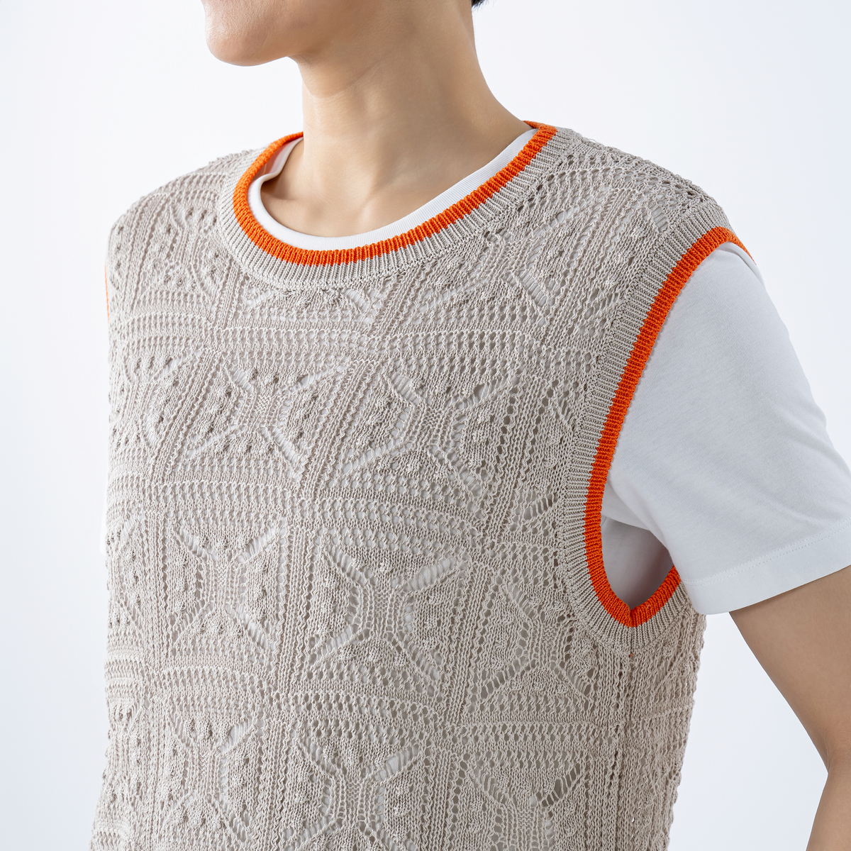 クロシェモチーフの編み柄の立体感と透け感が、レイヤードを印象的に仕上げてくれるサマーベスト。シンプルな装いに重ねるだけで、雰囲気のあるスタイルに。透け感を活かしながらも、肌が出すぎない絶妙なバランス設計。衿元、袖口、裾に配色ラインを効かせ、メリハリのある印象をプラスしています