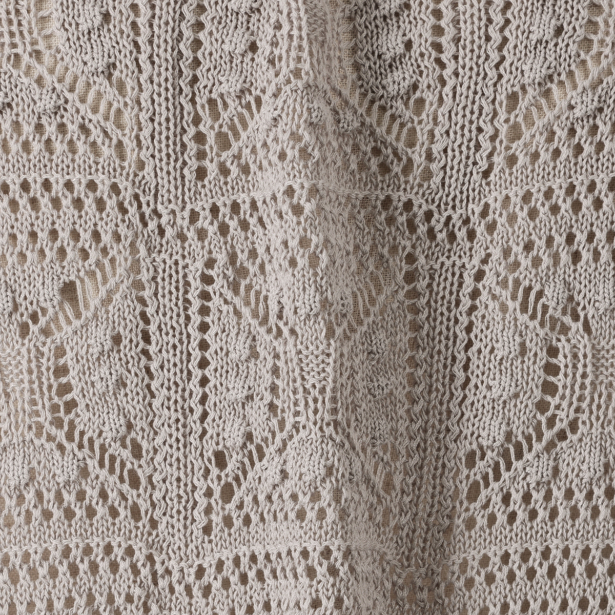 シンプルなTシャツやシャツワンピースに重ねるだけで、編み柄の表情が引き立ちいつもの装いがぐっと立体的に。ノースリーブワンピースや半袖トップスに合わせても重たく見えにくく、軽やかさをキープ。季節の変わり目には、長袖インナーと合わせてロングシーズン活躍します
