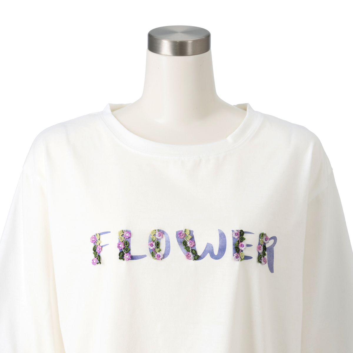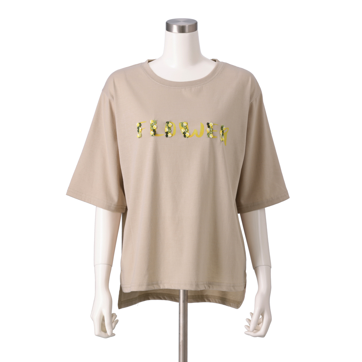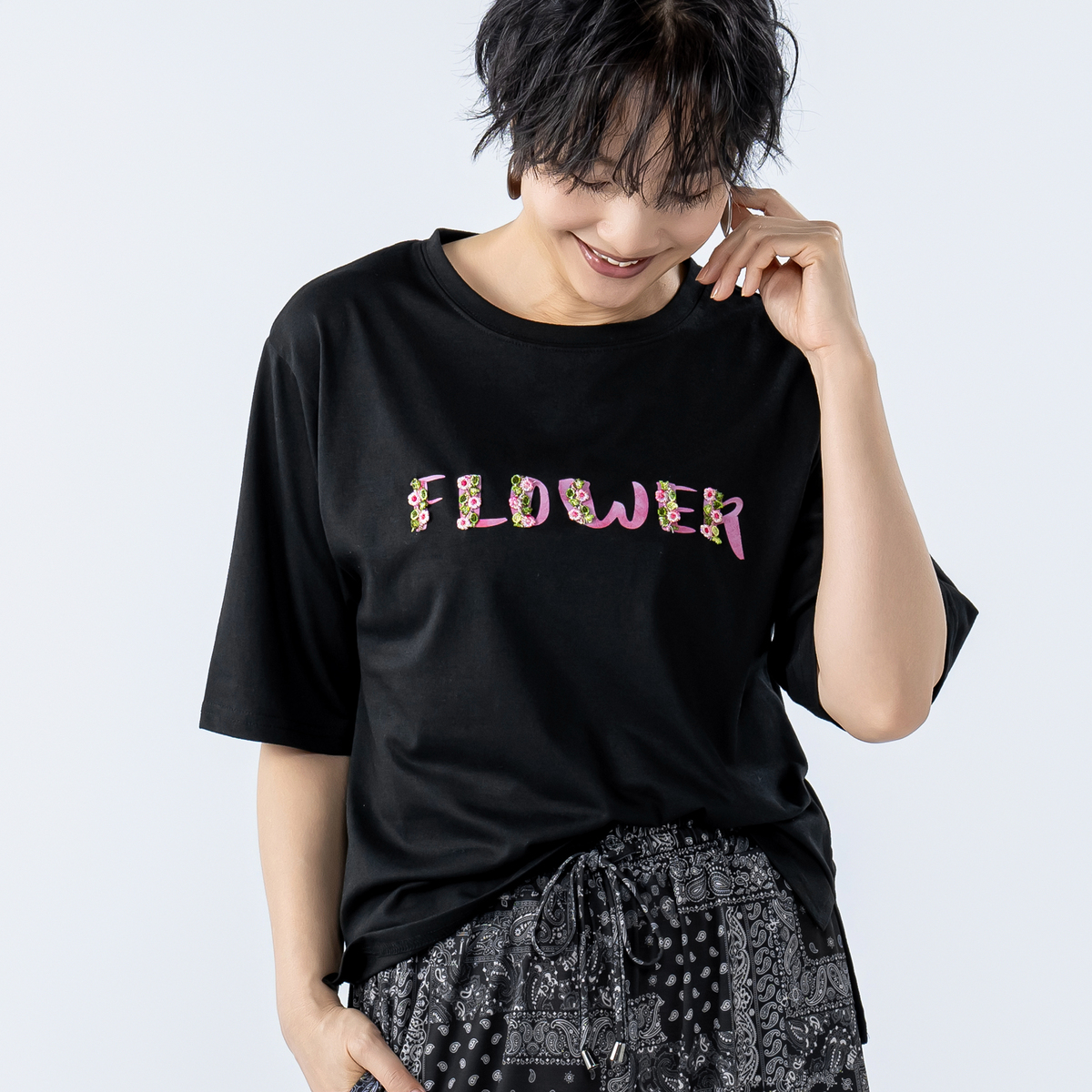 カジュアル過ぎない大人にピッタリのプルオーバー。ロゴ部分はプリントだけで完結させず、花モチーフの刺繍テープを重ねることによって、立体感と表情をプラスしています
