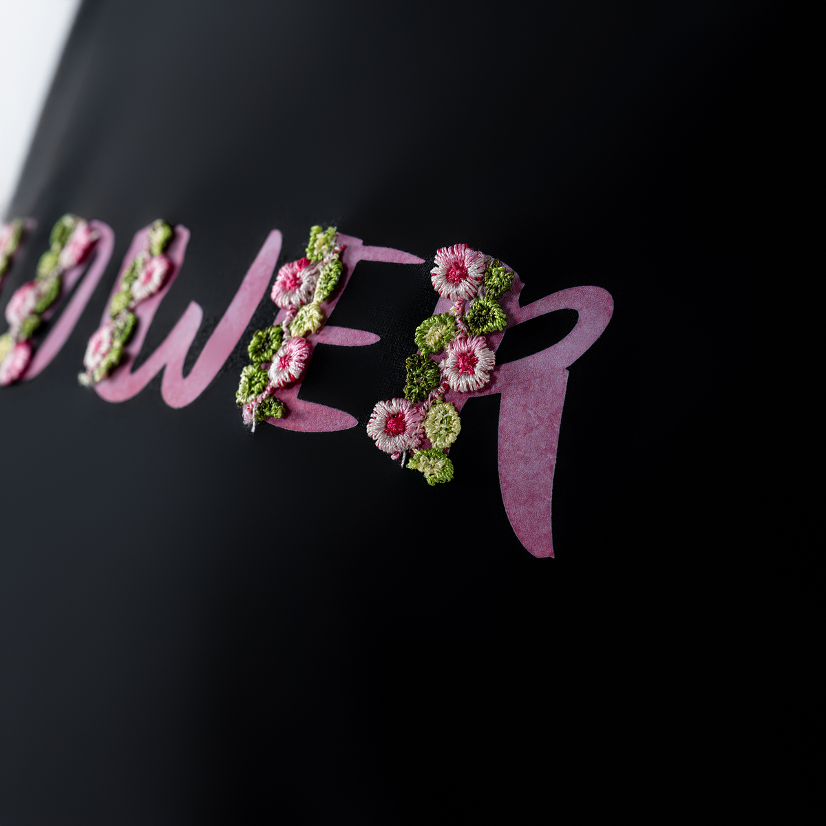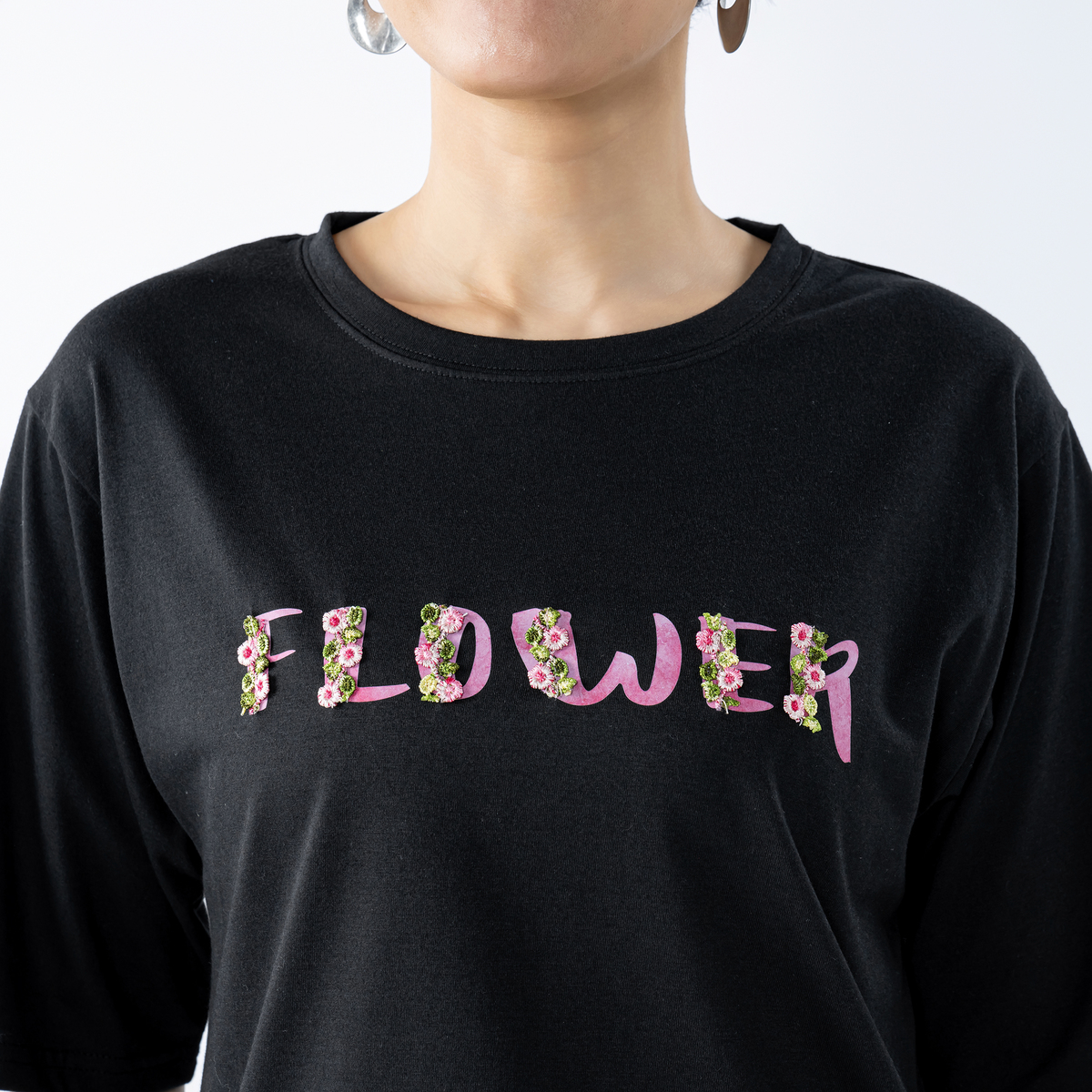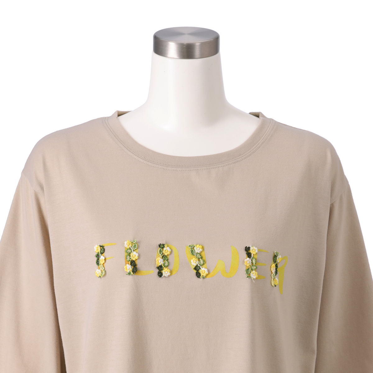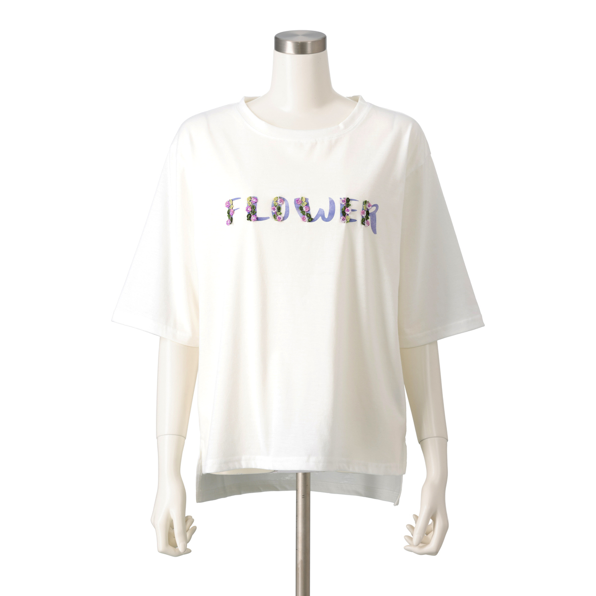 カジュアル過ぎない大人にピッタリのプルオーバー。ロゴ部分はプリントだけで完結させず、花モチーフの刺繍テープを重ねることによって、立体感と表情をプラスしています