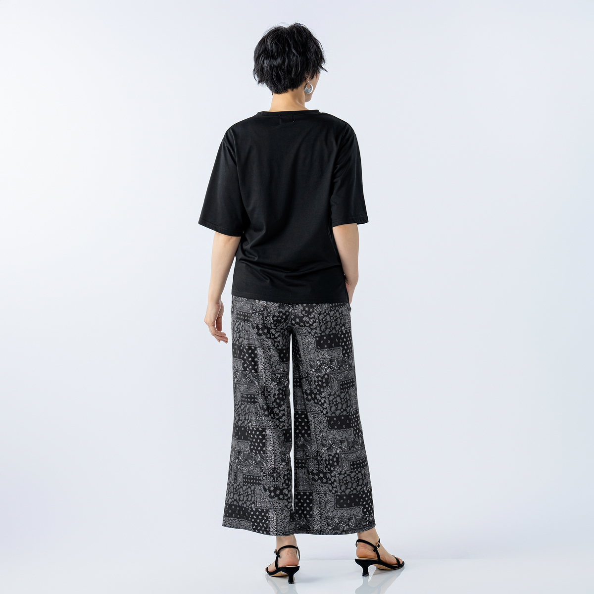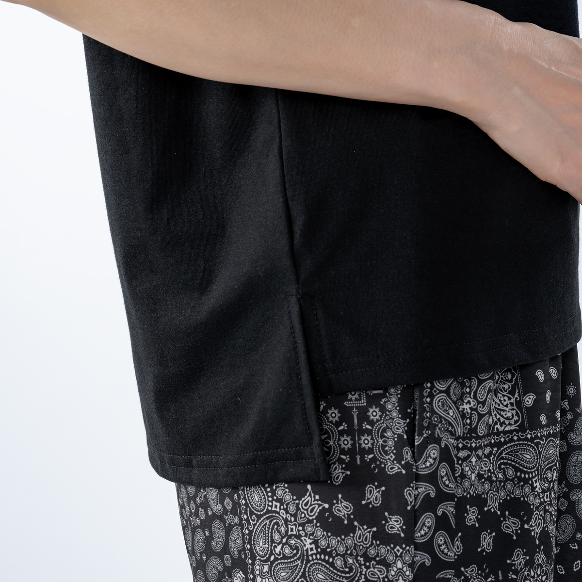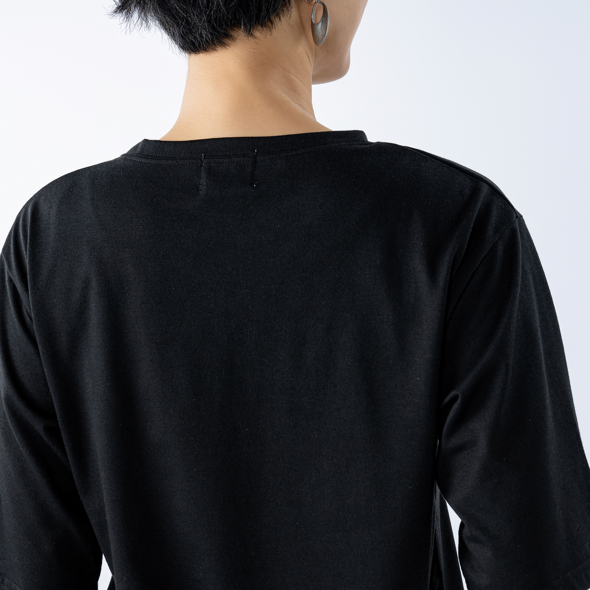 ほどよいゆとりがある身体のラインを拾いにくいシルエット。袖丈は肘に掛かる五分袖で腕周りを自然にカバー。前後差のある裾デザインで、インでもアウトでもバランスよく着用していただけます