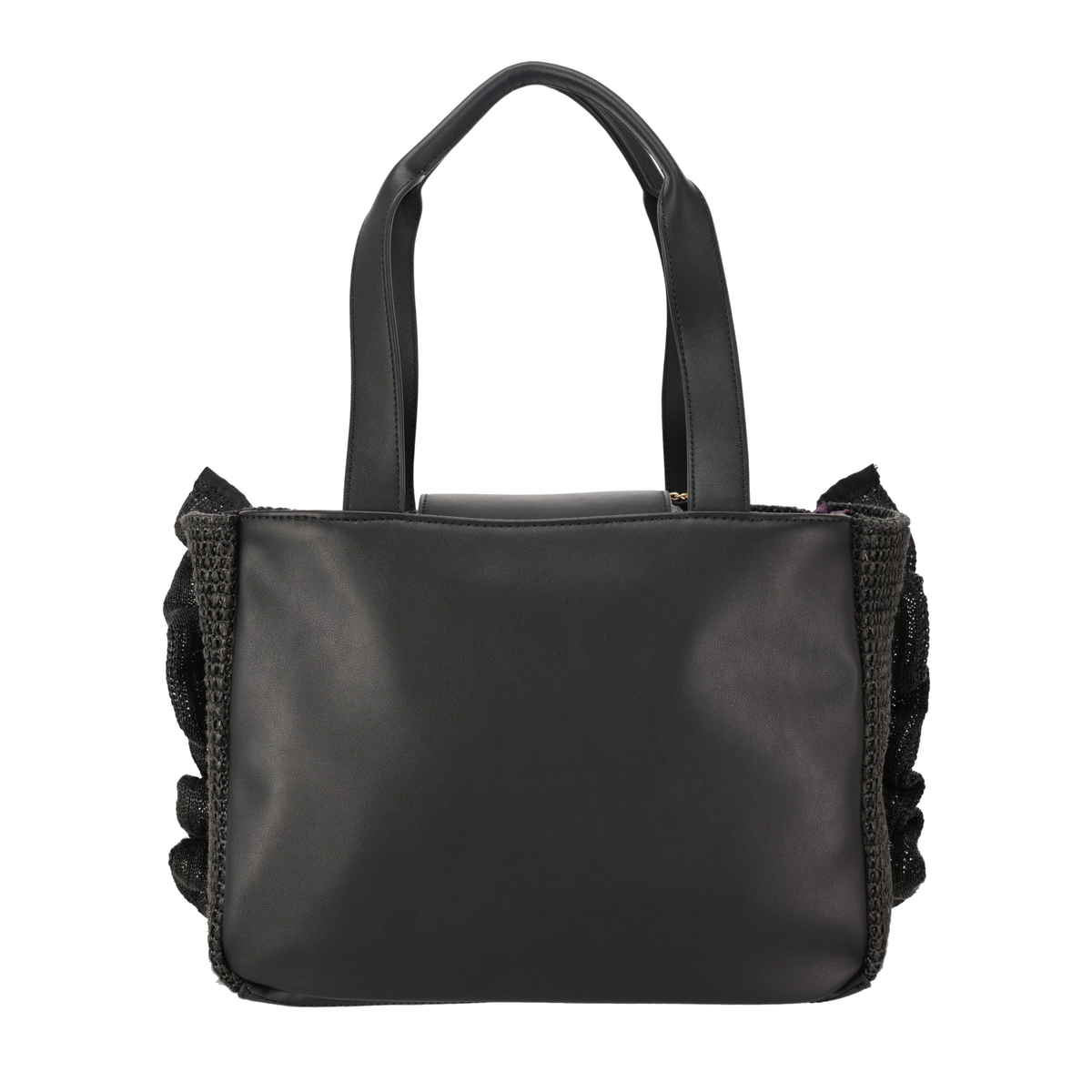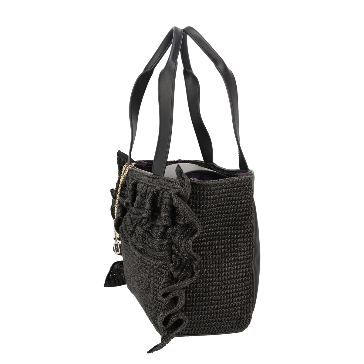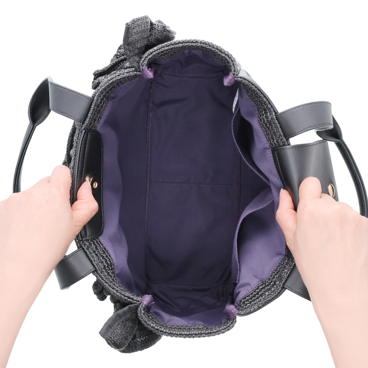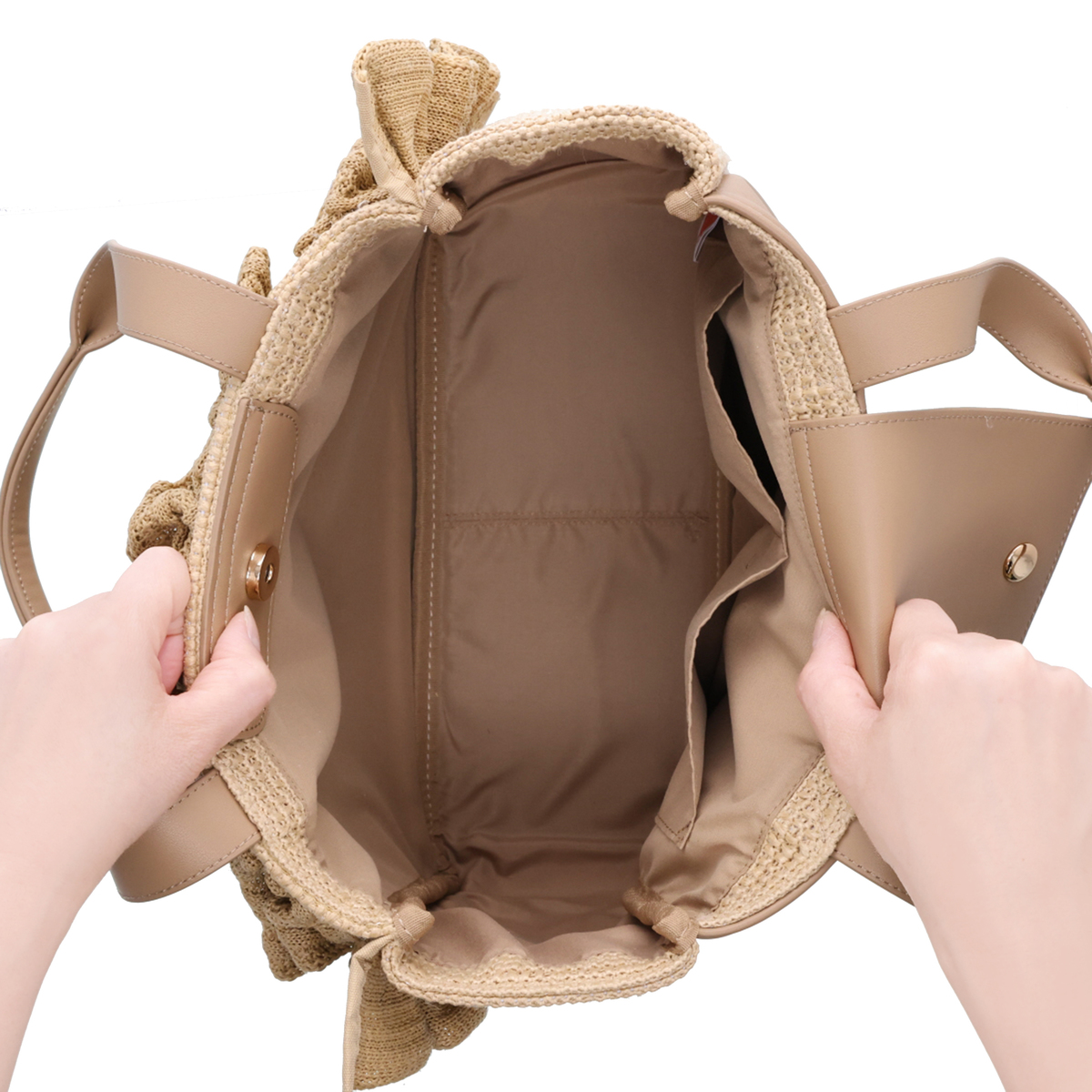 [サイズ(約)] 縦22×横28×マチ11cm ハンドル立ち上がり:22cm [重量(約)]※付属品含む 400g [素材] 表地:合成繊維 フリル部分:合成繊維 皮革部分:合成皮革 裏地:ポリエステル100% [仕様] 付属(取り外し可):チャームチェーン×1 開閉:マグネット式 底ビョウ:無 [ポケット] <内側> オープンポケット×2 <外側> 無 [注意事項] ※お洗濯、及び、ドライクリーニングはお控えください ※摩擦により色移りすることがあります。特に雨や汗等で濡れた状態で使用すると色移りすることがありますのでご注意下さい ※この商品は長時間日光に当たり続けると色あせの恐れがありますので、ご注意下さい ※デリケートな素材を使用していますので、爪やアクセサリーなどの引っ掛かりによりキズがつきやすくなっております。縫目や生地を強く引っ張らないように注意して下さい ※チャームは摩擦や引っかかることにより、色落ちや変色のおそれがありますので、ご了承ください 【中国製】