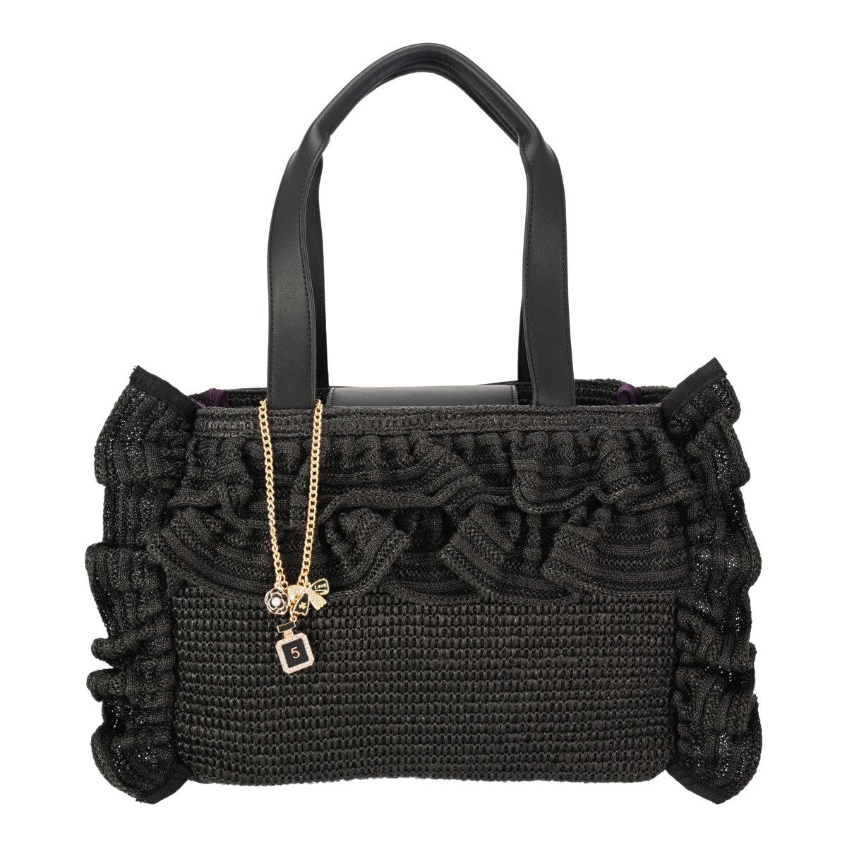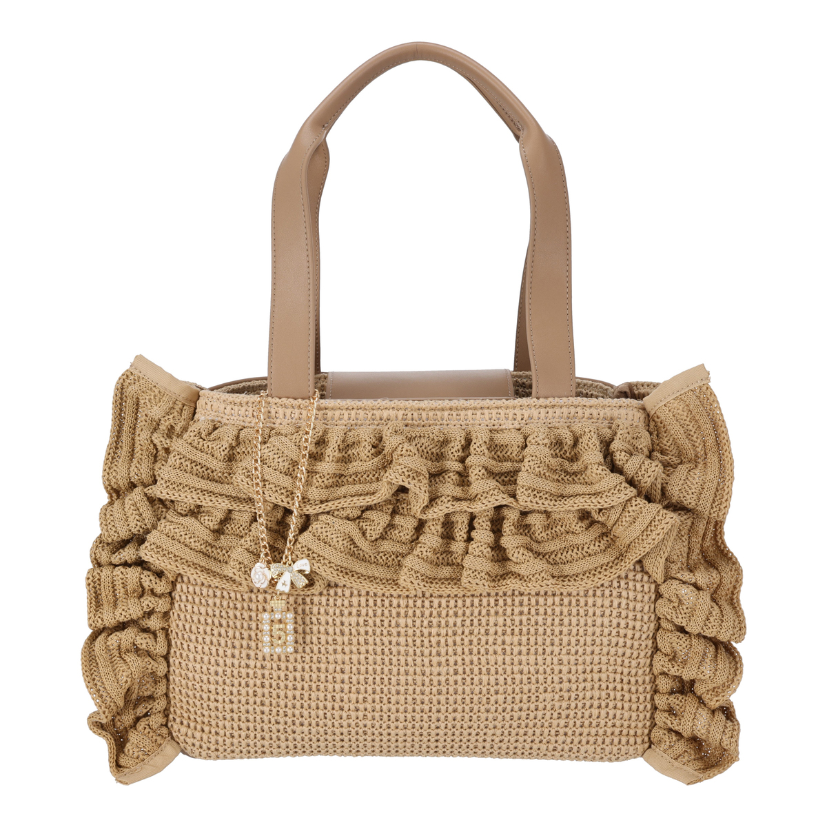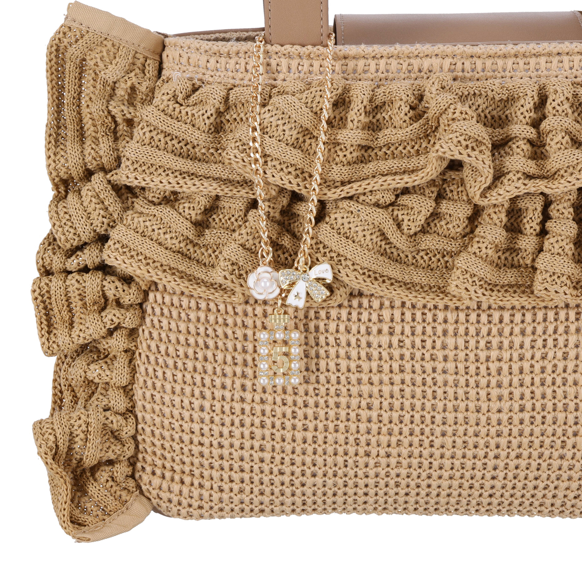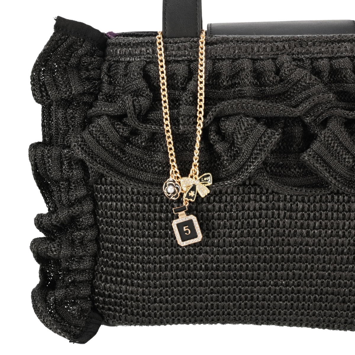 口まわりのフリルで&LOVEらしさを表現したバッグ。フリルは全体に均等に入れることで甘さを抑え、上品な印象にまとめています。フロントには香水瓶やリボン、カメリアのチャームを添え、持つだけで気分が上がる遊び心を効かせています