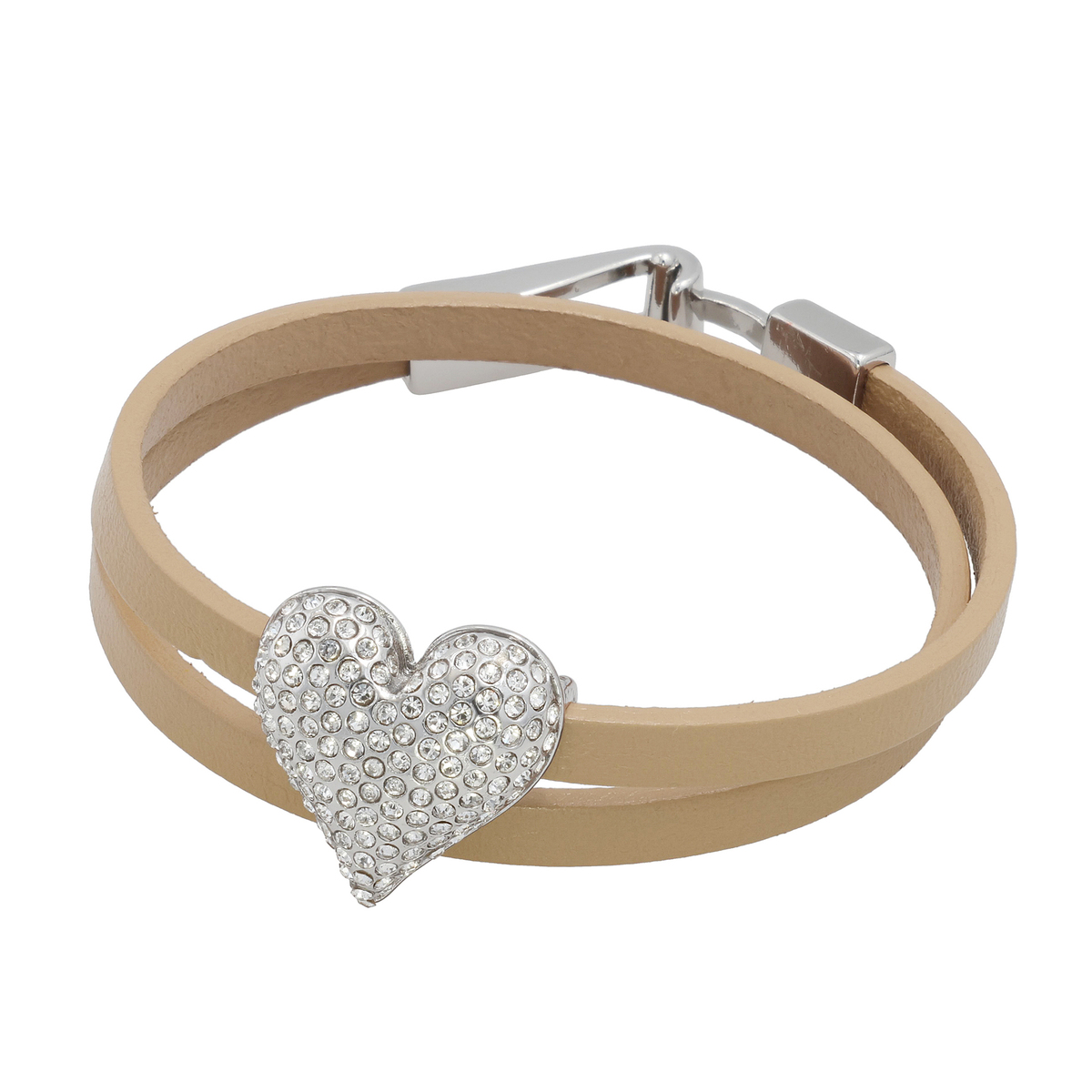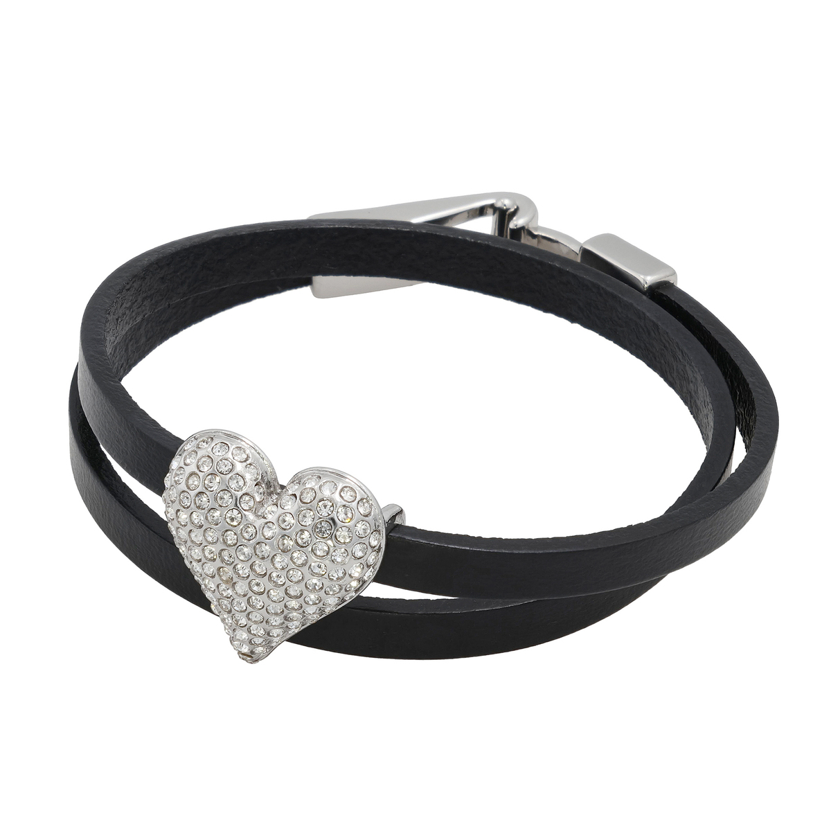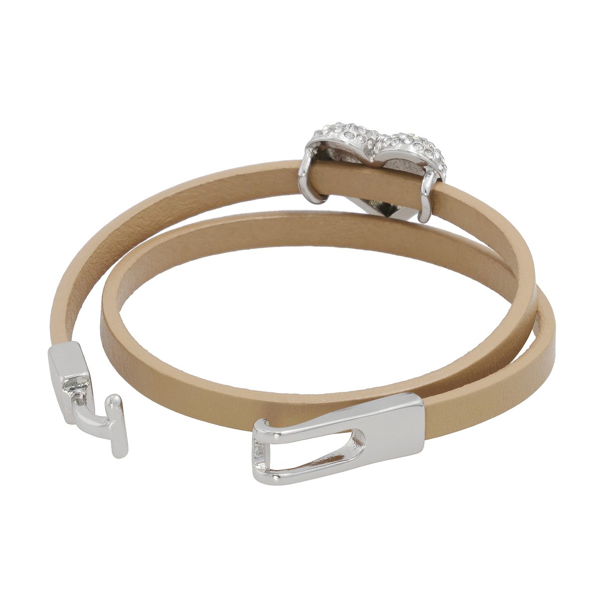 ハートモチーフを主役にしたブレスレット。ラインストーンを敷き詰めたハートが手元で映え、二重巻き仕様で重ね付けしているような印象に。ベルト部分には牛革を使用し、シックな質感と輝きのコントラストを楽しめます。フック式金具で着脱もスムーズです