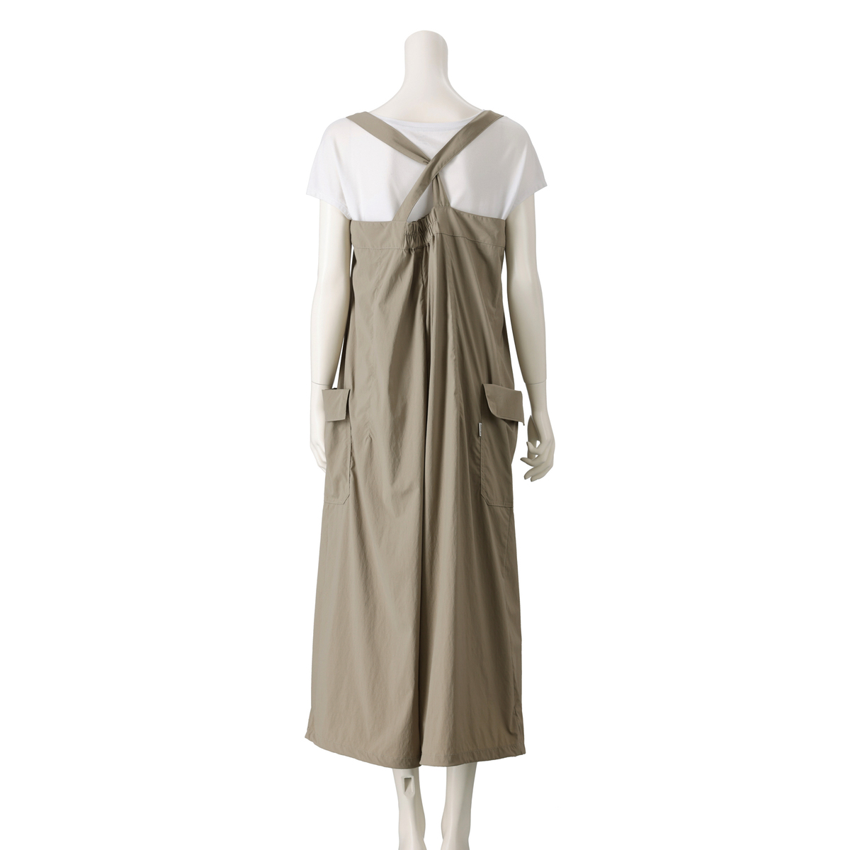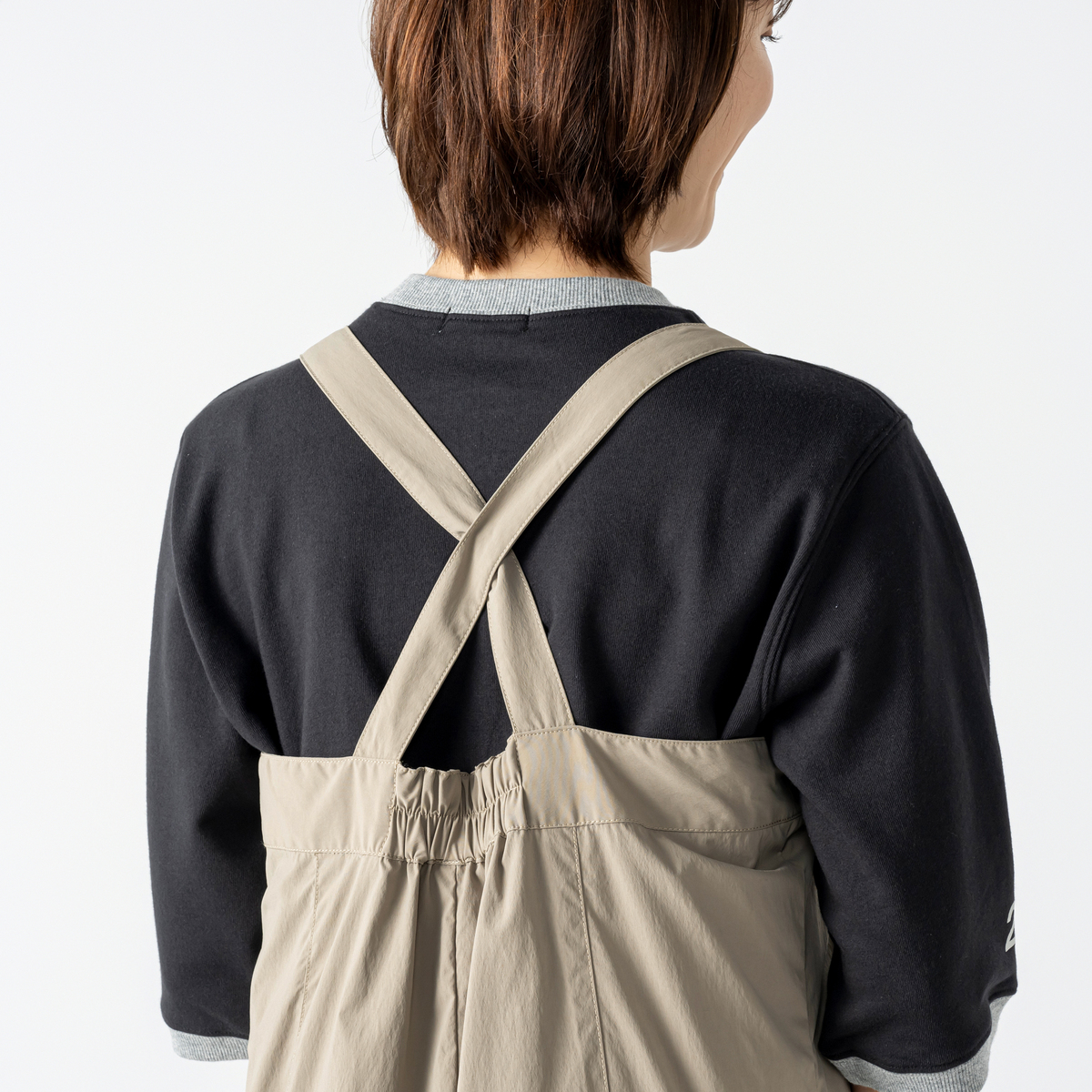 肩ストラップは後ろでクロスし、アジャスターで全体の丈を調整可能。両側に大きな折り返し付のパッチポケットを付け、立体的なカジュアル感をプラス。手も入れやすく仕上げました