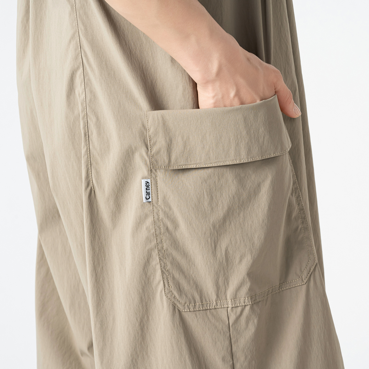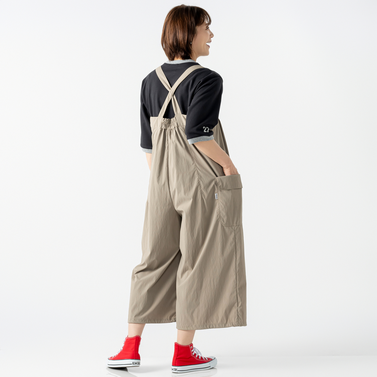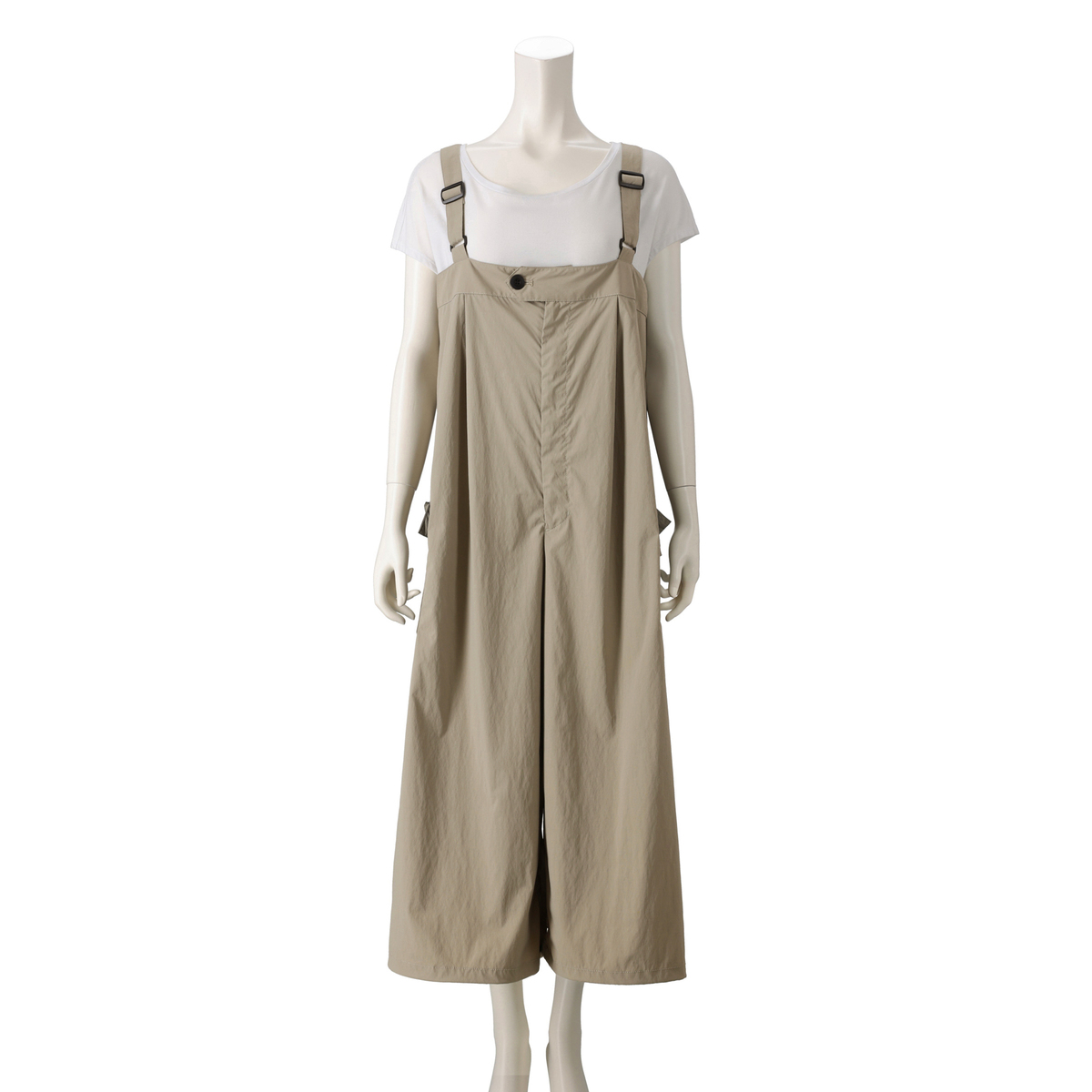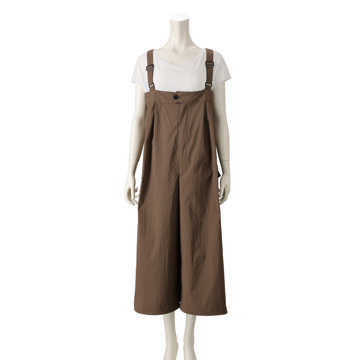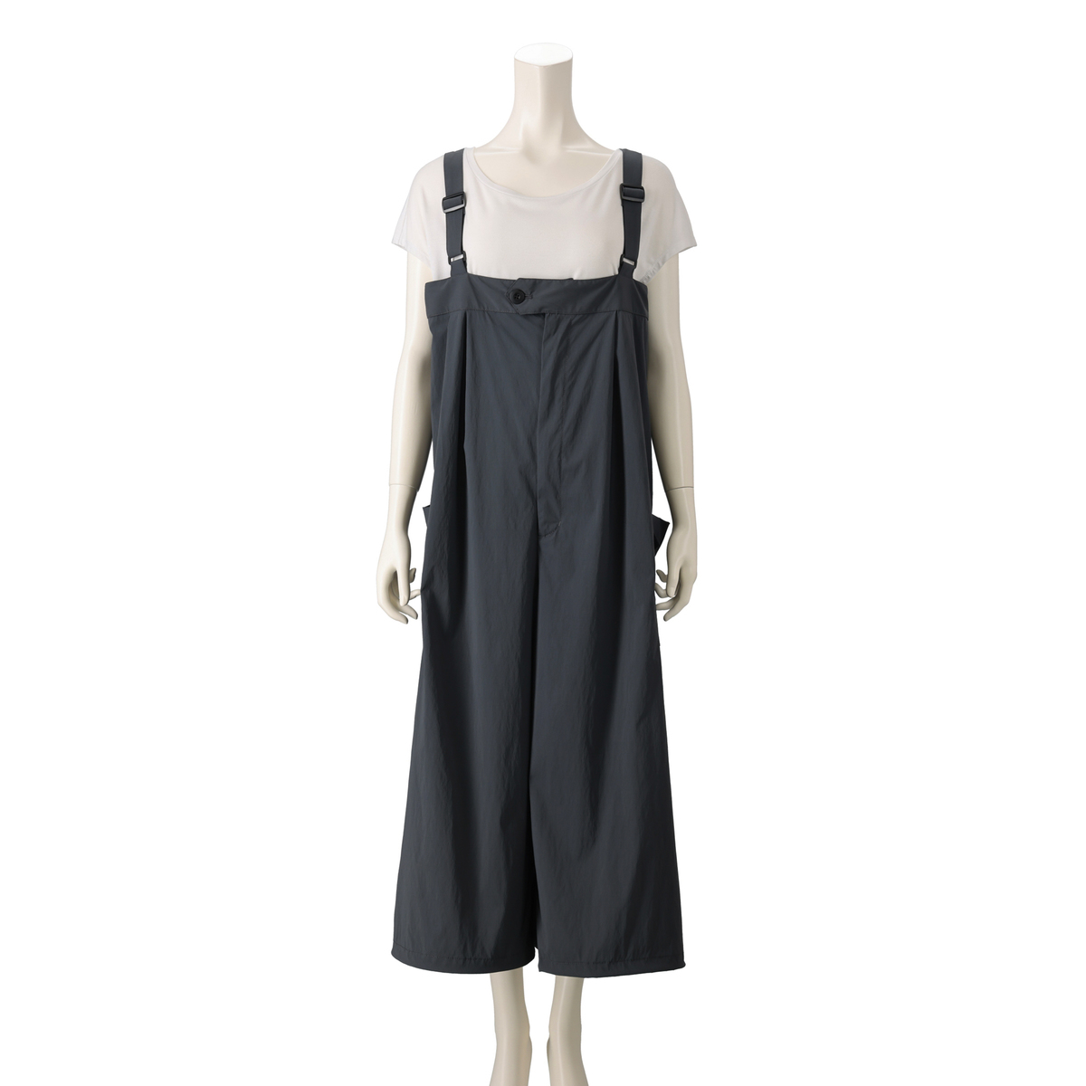 軽やかなナイロンストレッチ素材で仕立てたオーバーオール風スカーチョ。前には左右二本のタック、後ろには長めのダーツを入れ、ふんわりとしたシルエットに。前中心のファスナー仕様で着脱もスムーズです