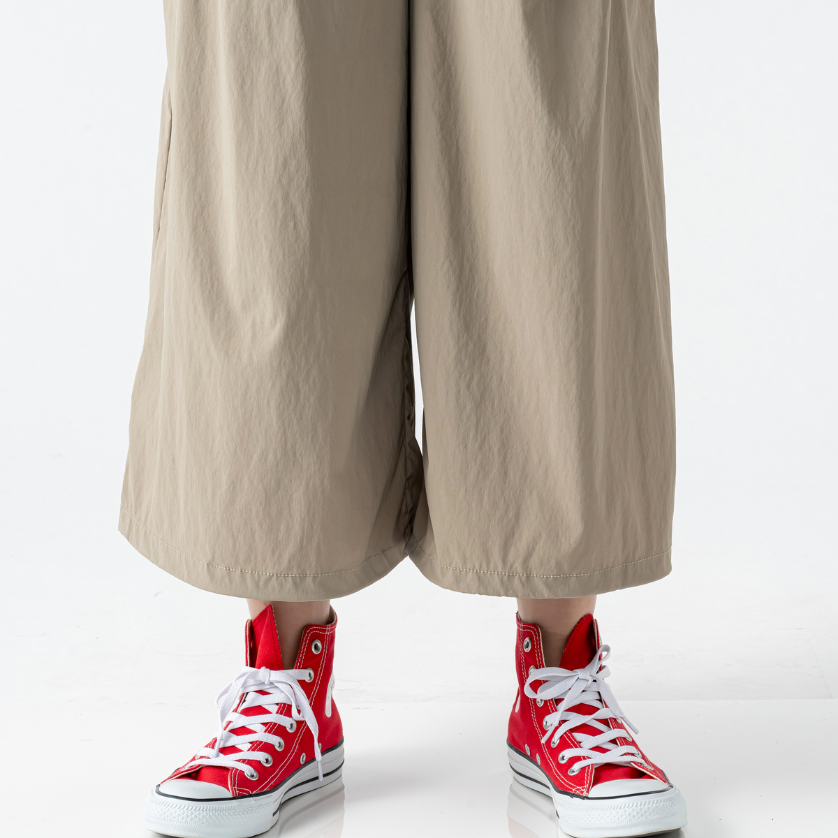 裾のドローストリングスで、バルーンシルエットにもアレンジ可能。さらにぎゅっと絞ることで、たくし上げて水遊びを楽しむにも便利な仕様です。脇側のタブでゴムの飛び出しも防ぎます