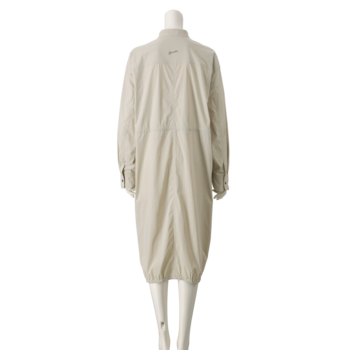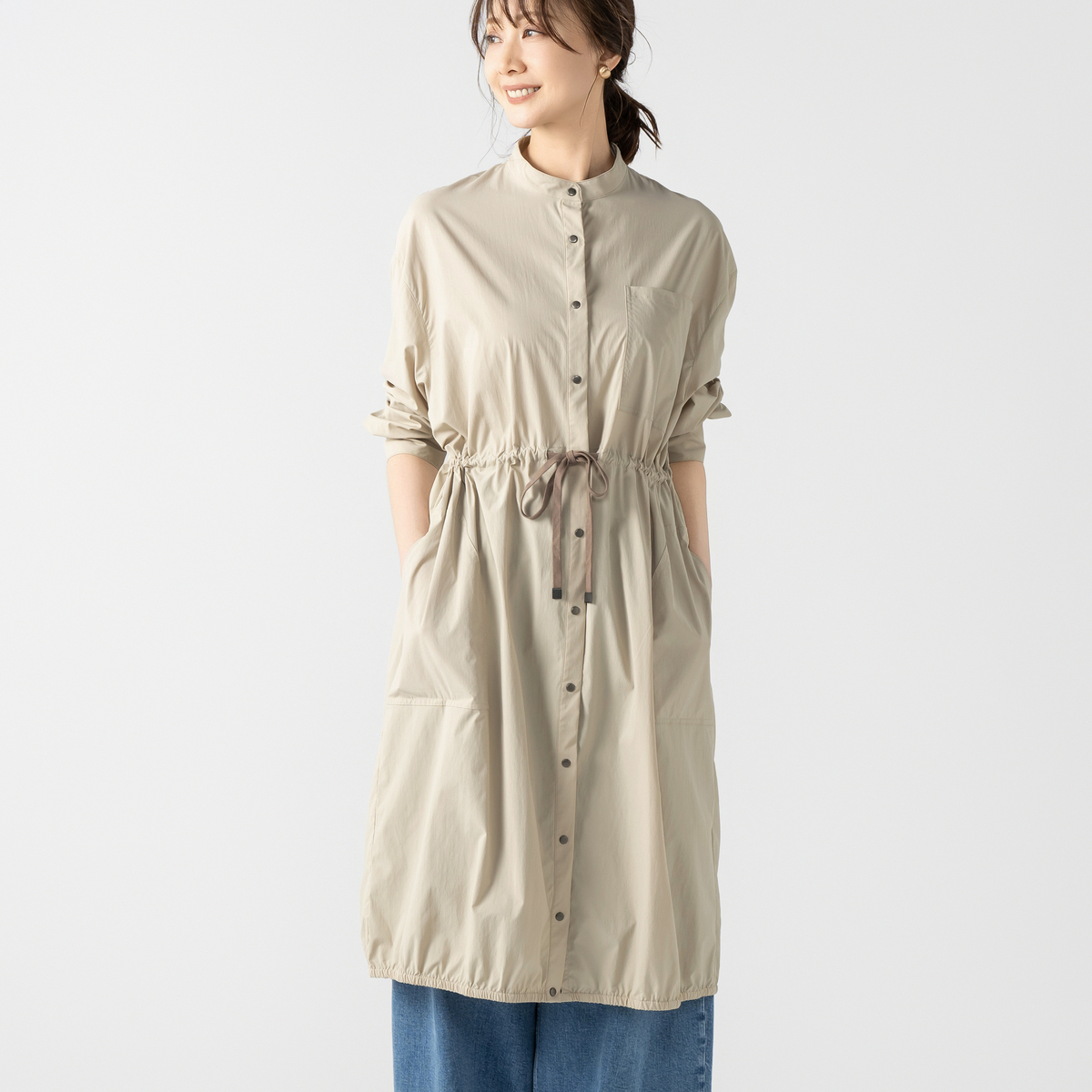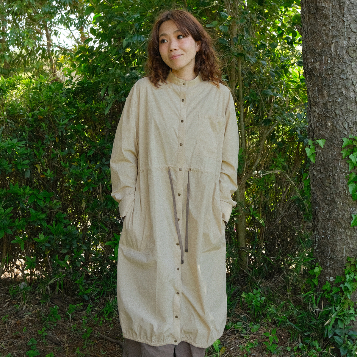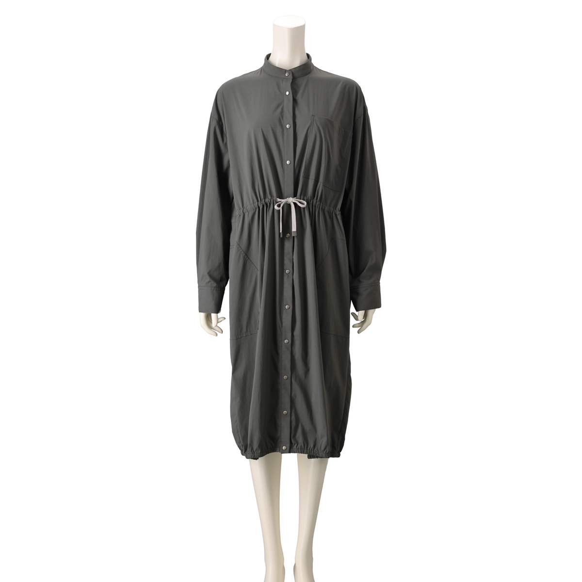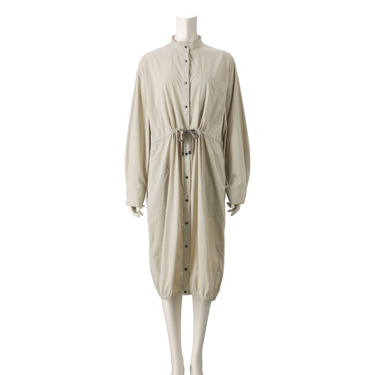 ミディ丈で着やすいバルーンシルエットのワンピース。裾に細い平ゴムを入れ、ウエストは微配色の紐を通したドローストリング仕様で印象調整が可能。スタンドカラーとカフス付き長袖のシャツディテールを、軽く落ちの良いナイロンストレッチ素材で仕立て、キックバックのある質感が適度なボリューム感を支えます