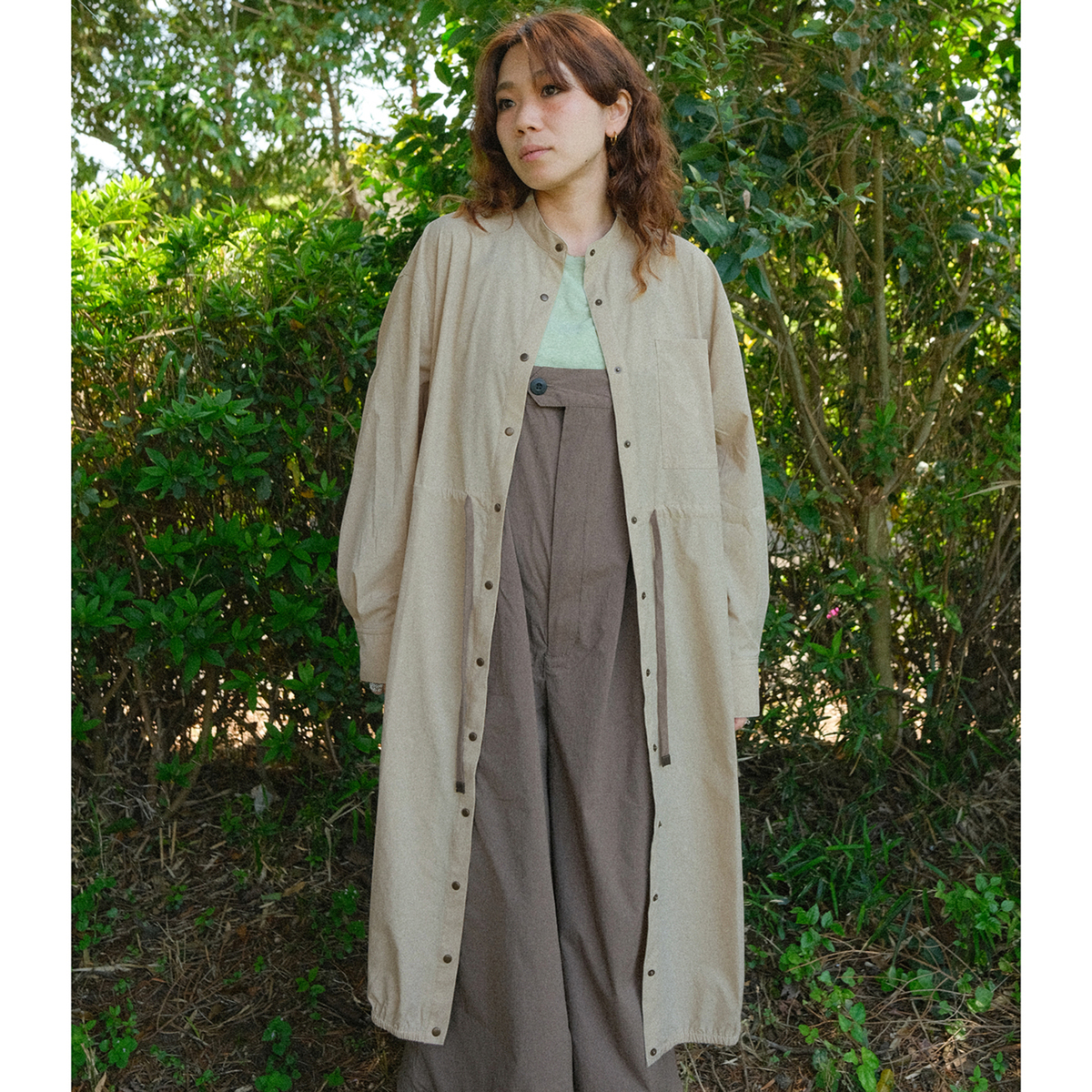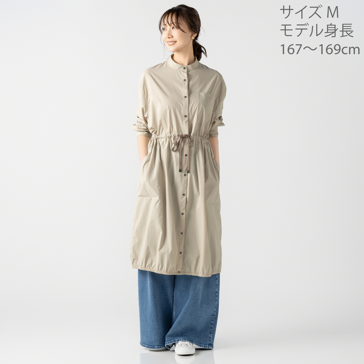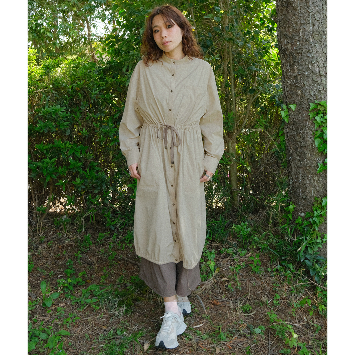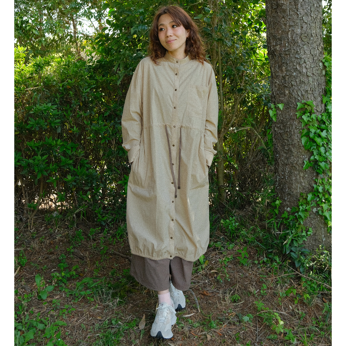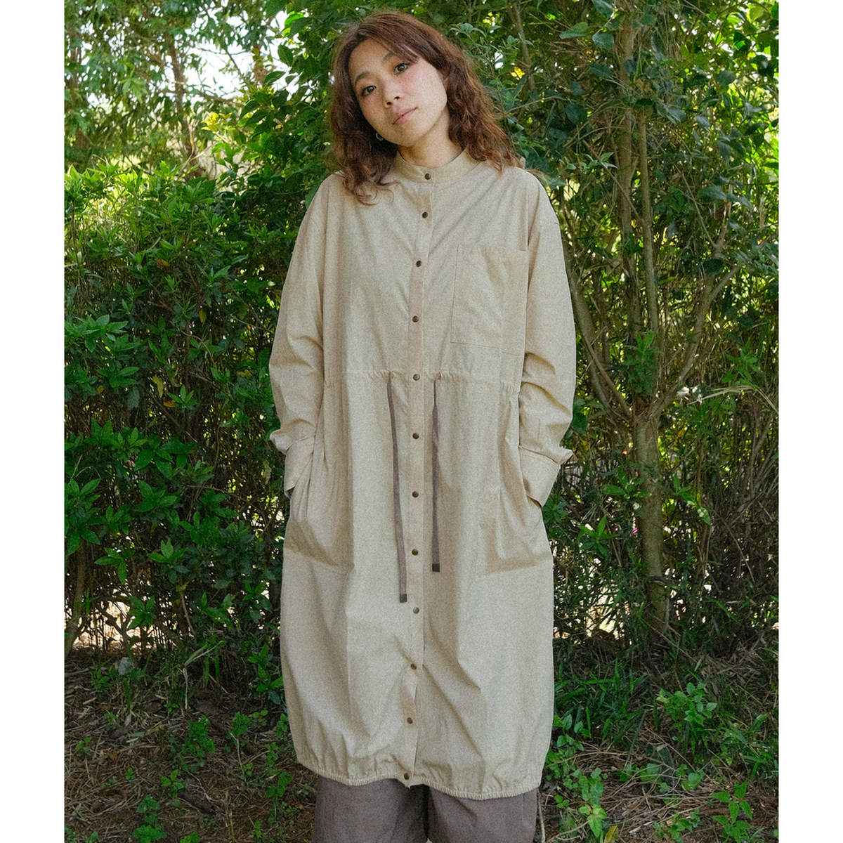 ミディ丈で着やすいバルーンシルエットのワンピース。裾に細い平ゴムを入れ、ウエストは微配色の紐を通したドローストリング仕様で印象調整が可能。スタンドカラーとカフス付き長袖のシャツディテールを、軽く落ちの良いナイロンストレッチ素材で仕立て、キックバックのある質感が適度なボリューム感を支えます