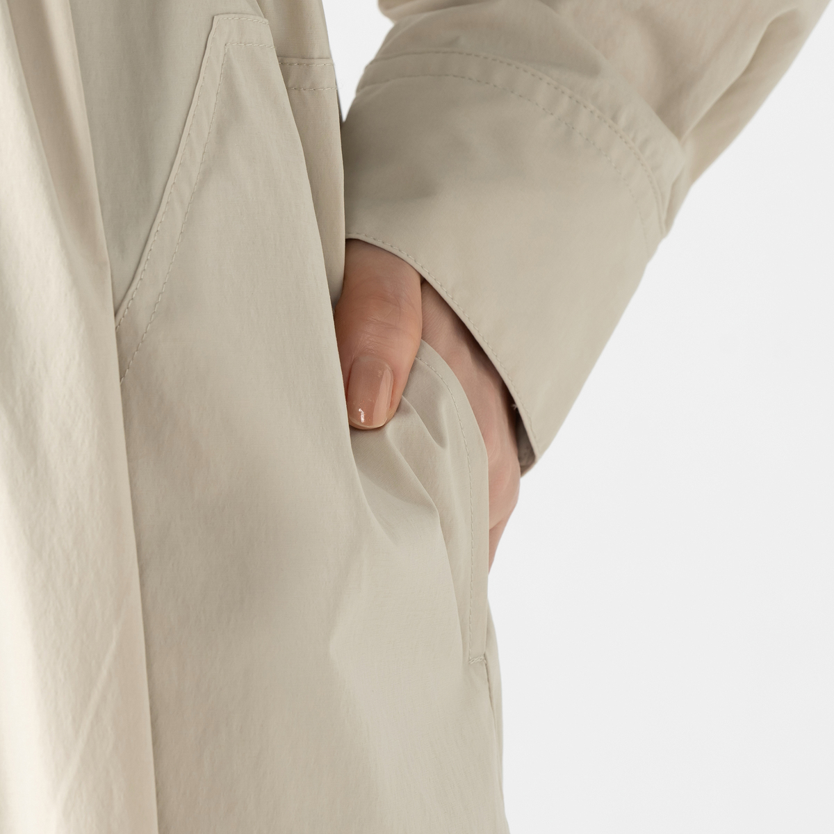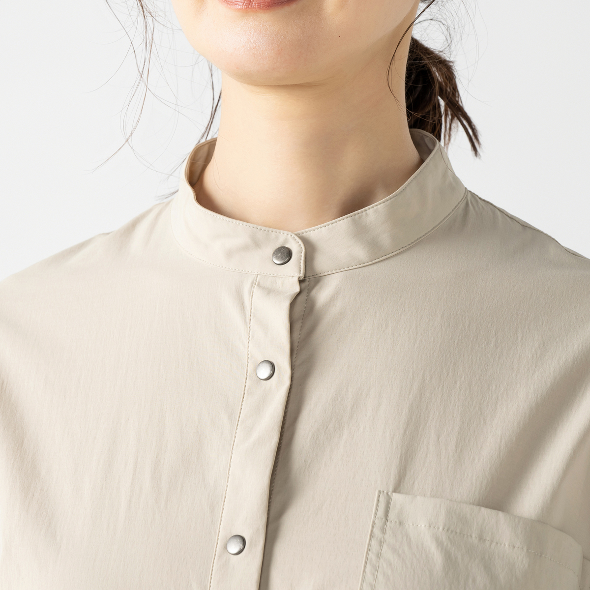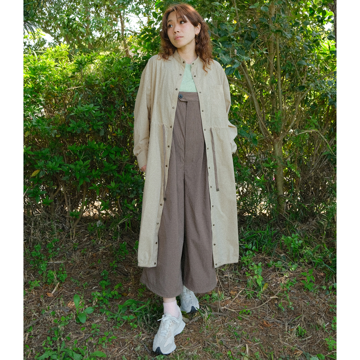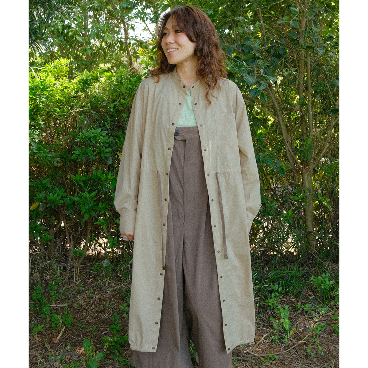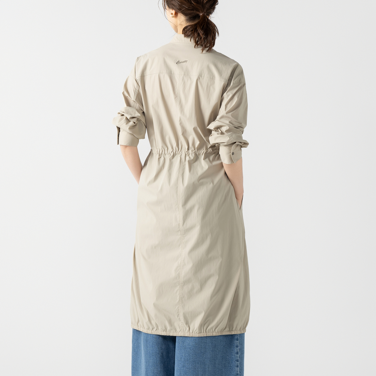 ミディ丈で着やすいバルーンシルエットのワンピース。裾に細い平ゴムを入れ、ウエストは微配色の紐を通したドローストリング仕様で印象調整が可能。スタンドカラーとカフス付き長袖のシャツディテールを、軽く落ちの良いナイロンストレッチ素材で仕立て、キックバックのある質感が適度なボリューム感を支えます