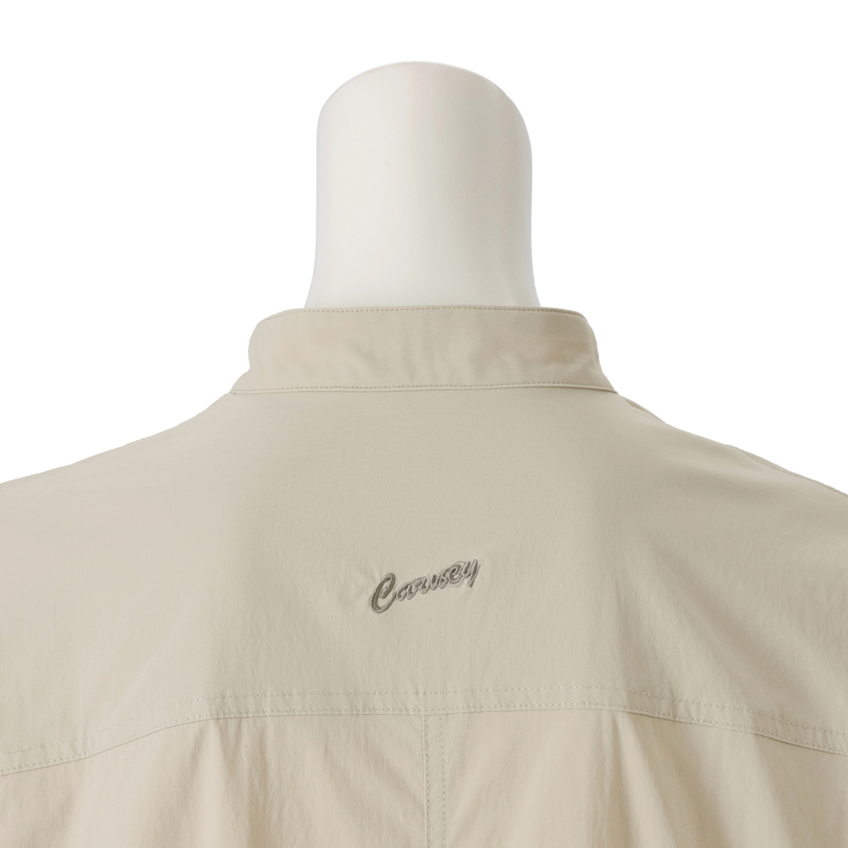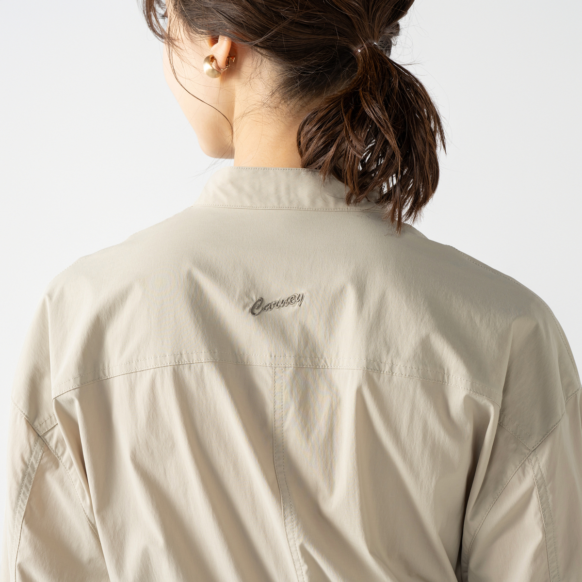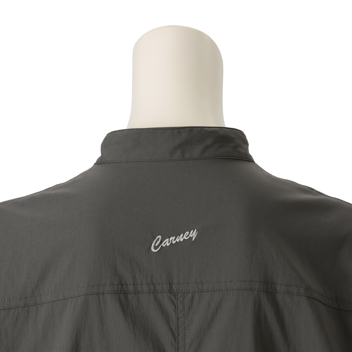 左胸と両脇にポケットを配した仕様で、前を留めずコート感覚でも着用可能。小さなドットボタンで開閉しやすく、ブラックニッケルメッキの金具や背中のロゴ刺繍がすっきりとした印象を添えます