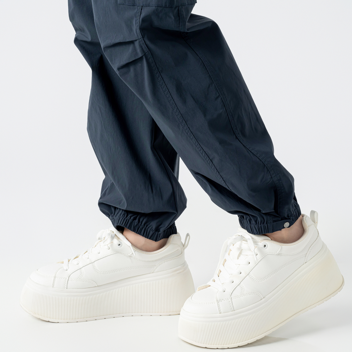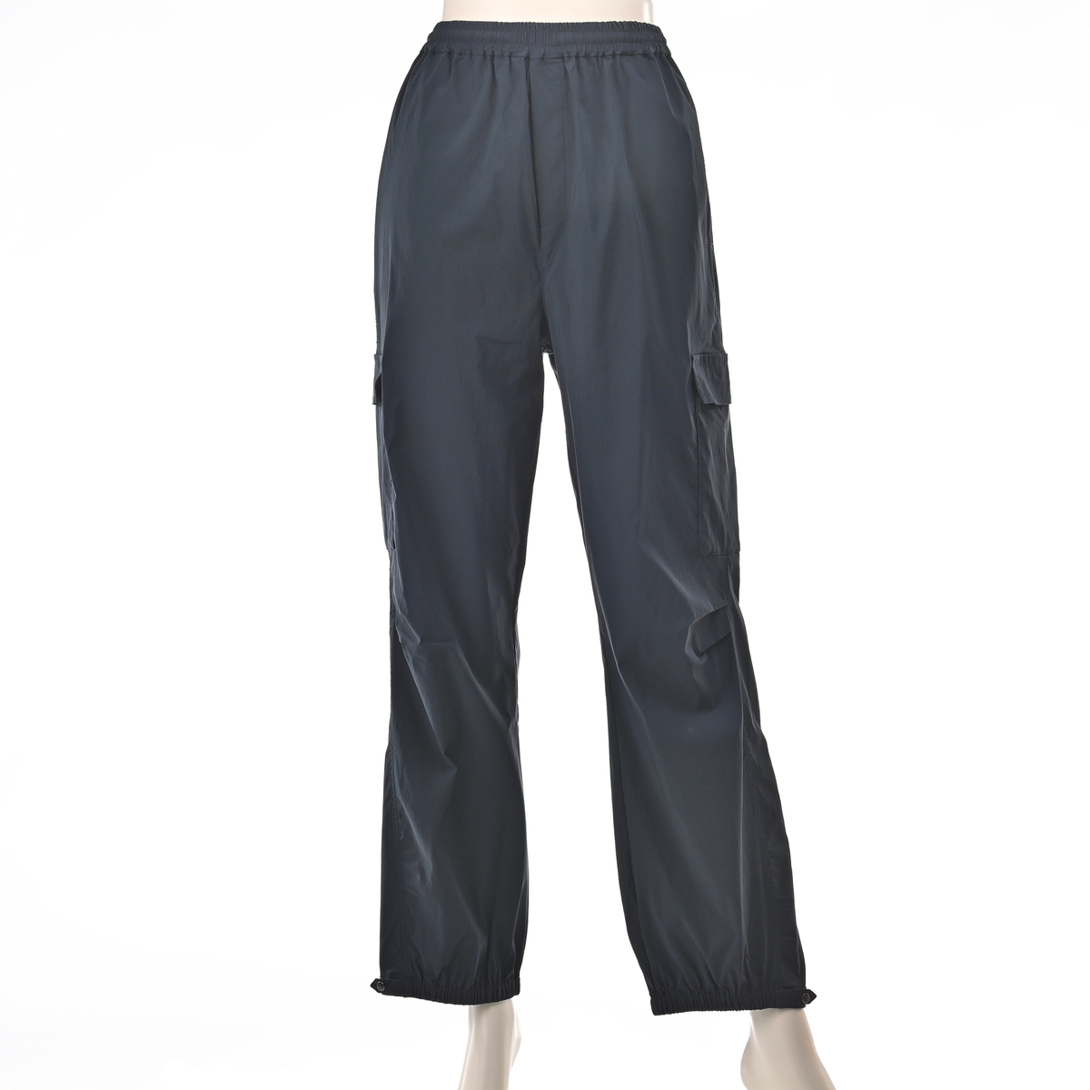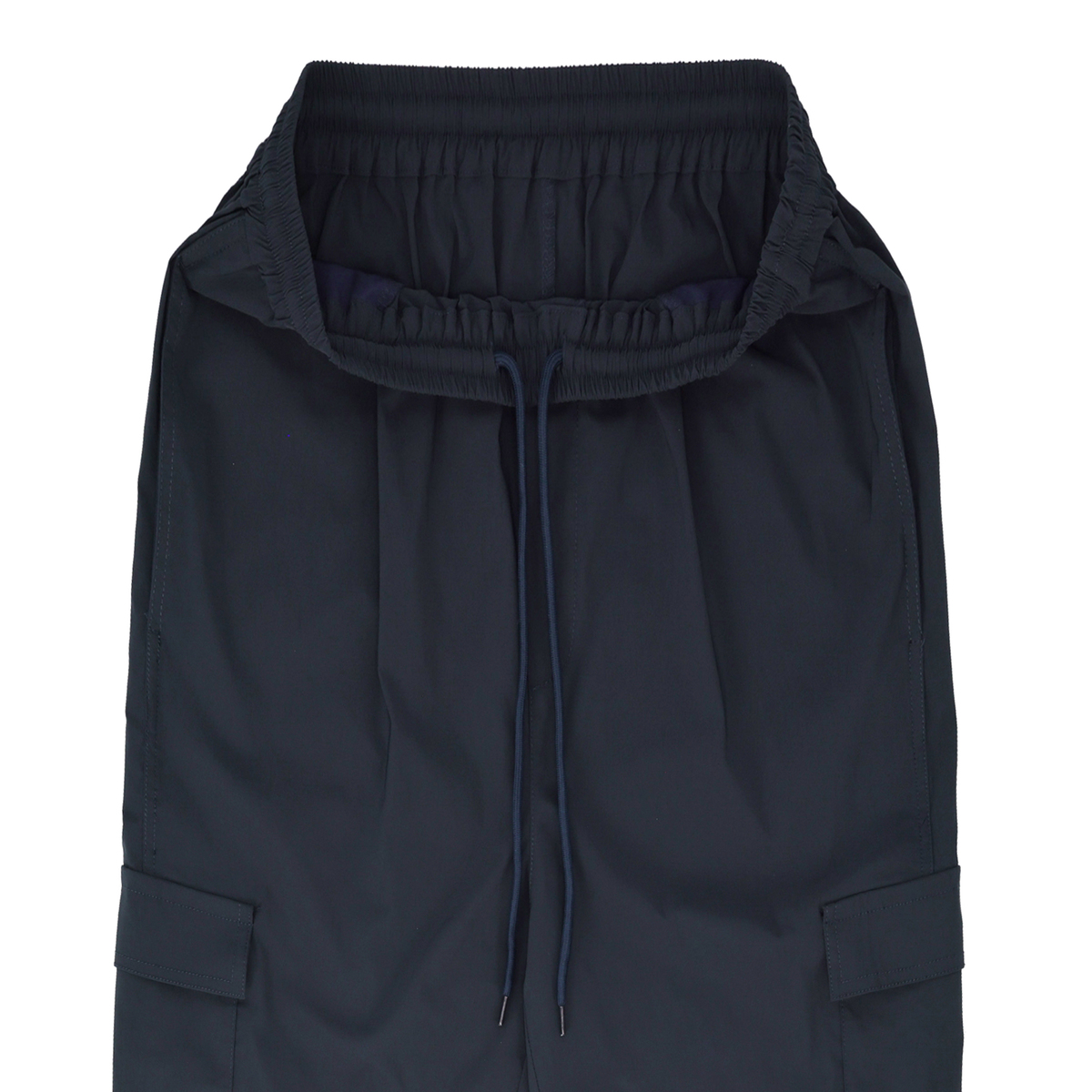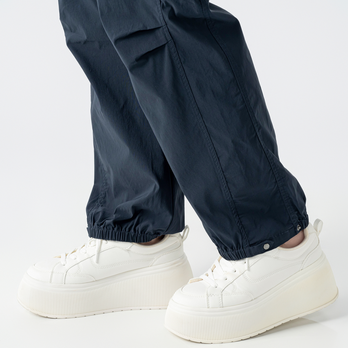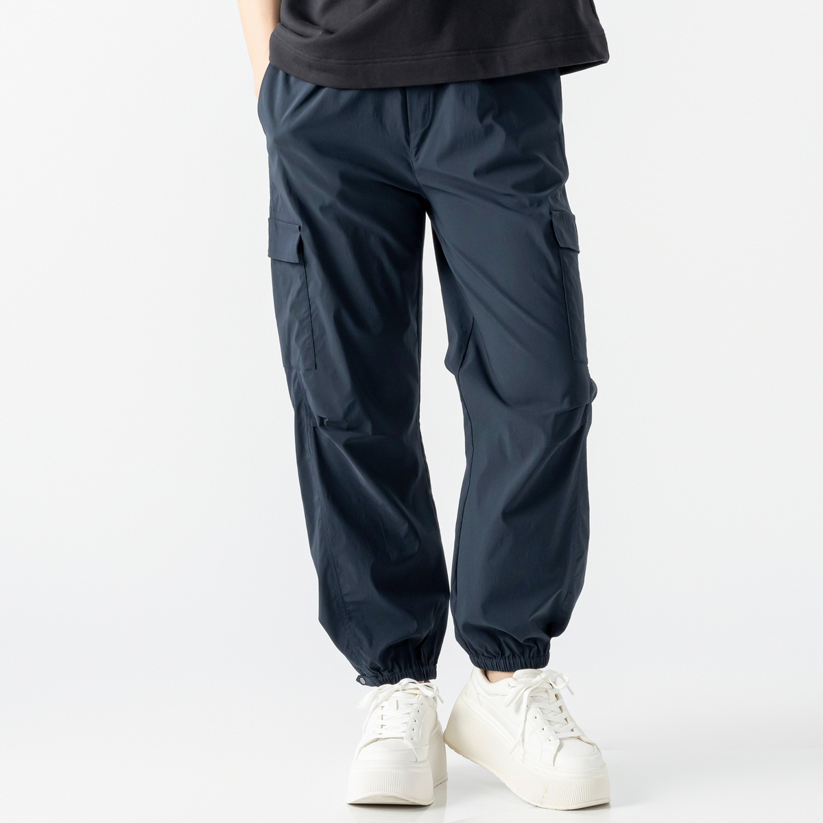 裾はサイドのタブで太さを2段階に調整できる仕様。切替部分以外はゴム入りです