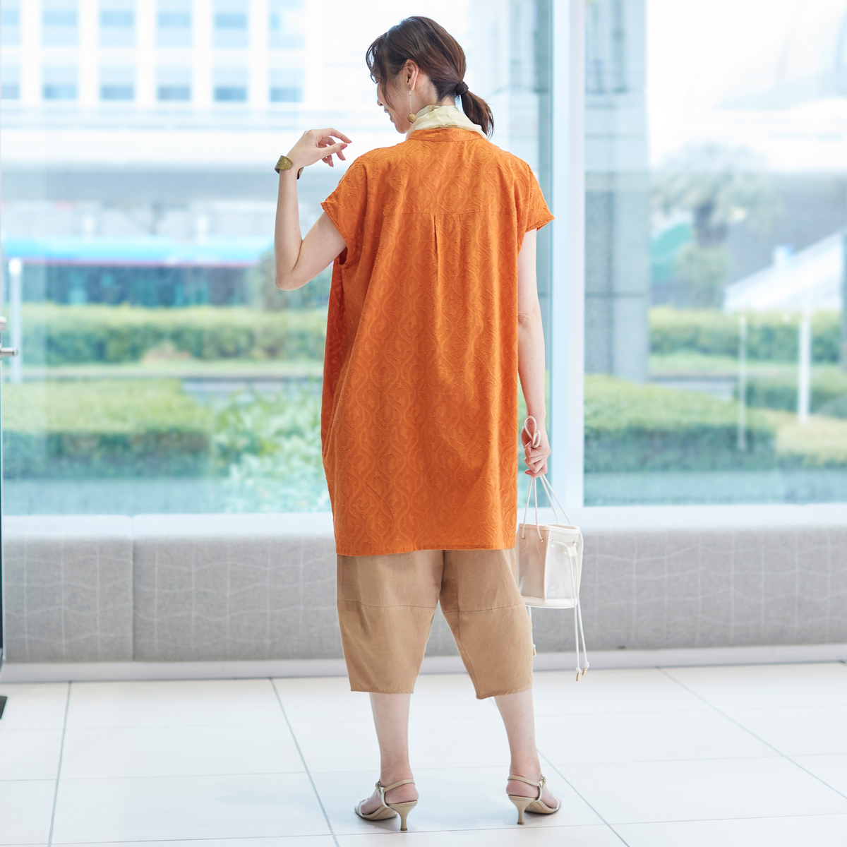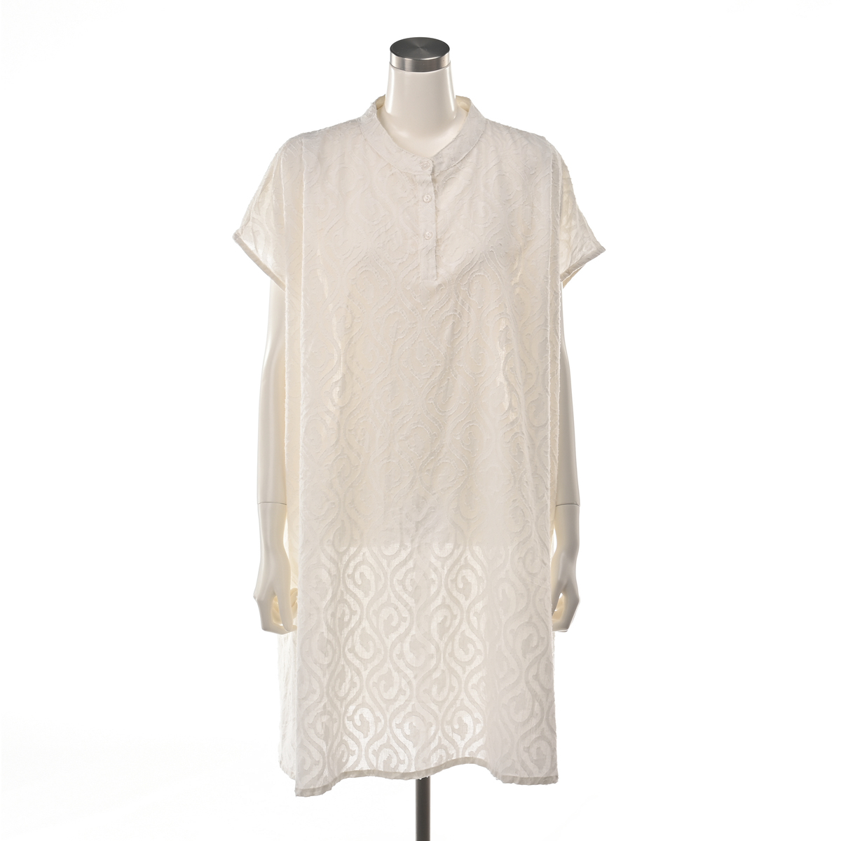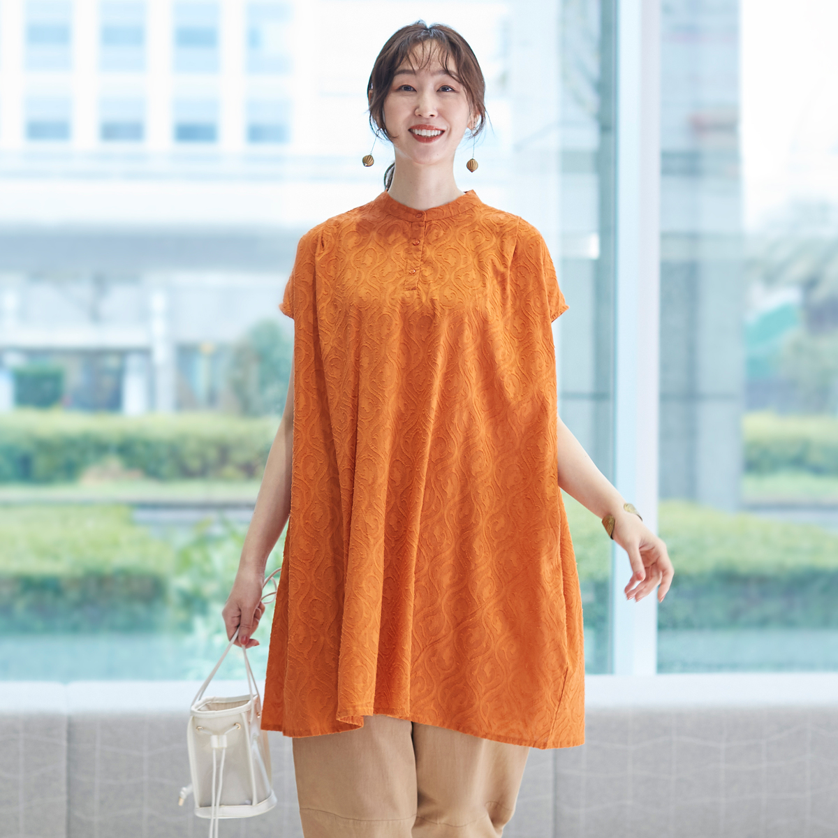 インド綿を使用した、表面感のあるカットジャガード素材のチュニックブラウス。風通しが良く快適で軽やかな着心地です。リラックス感のあるフォルムで体型を選びにくく、キャプスリーブが腕周りをすっきり演出。インナーとのレイヤードもしやすく、ご家庭でのお洗濯が可能です(洗濯ネット、中性洗剤使用)