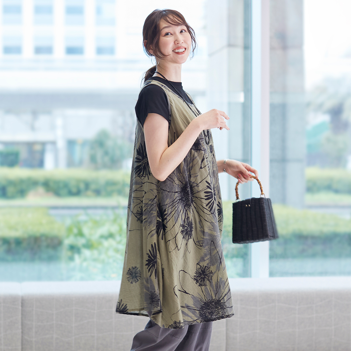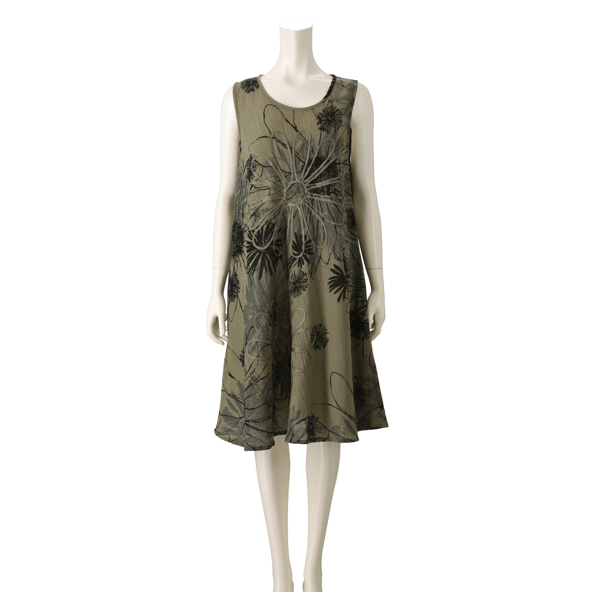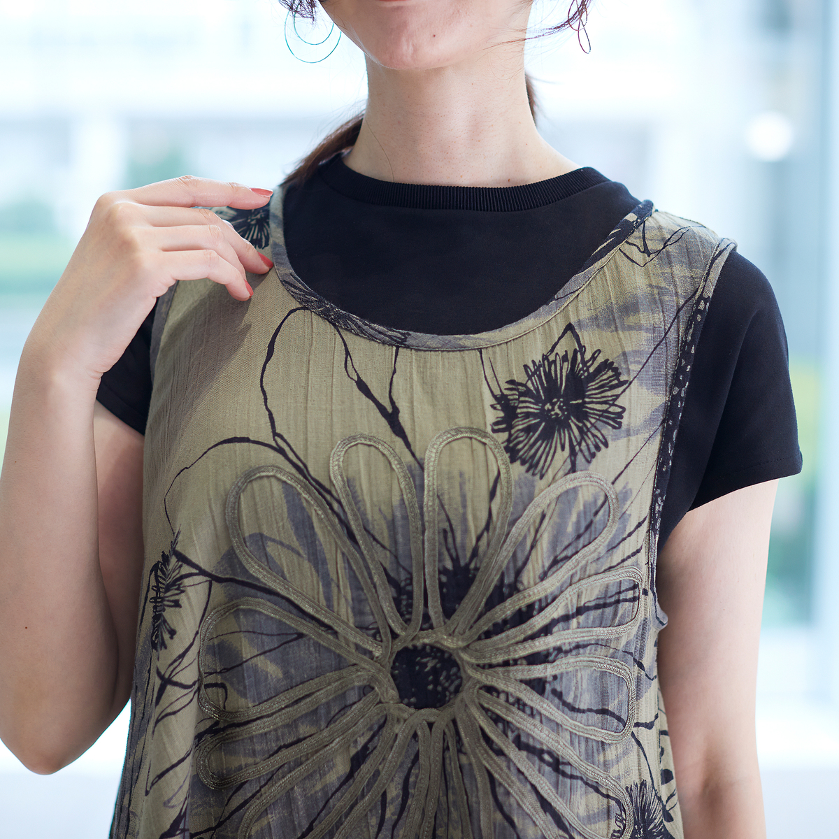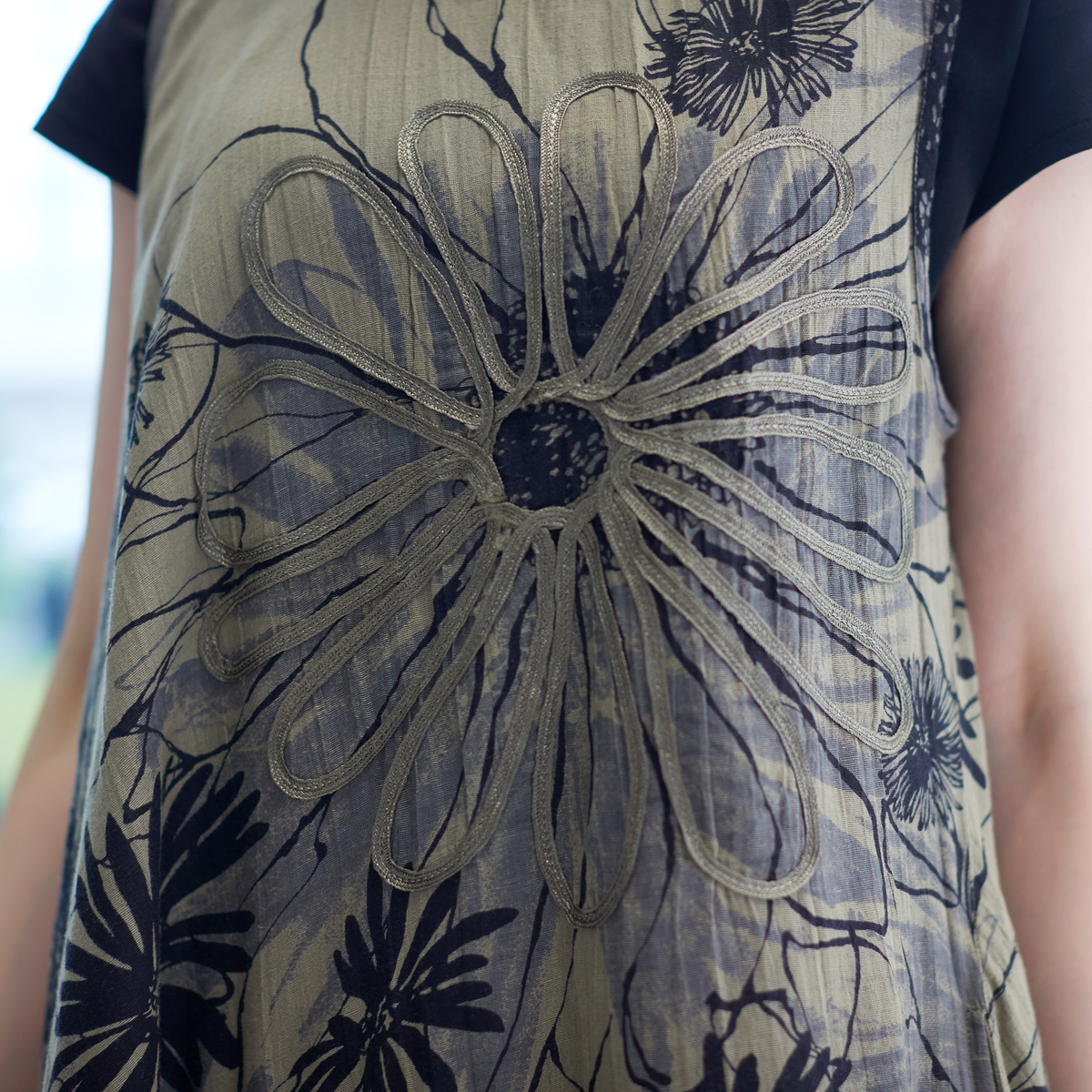 ランダムに大胆に施された花柄が目を引くチュニックワンピース。手描き風の個性的なプリントに、立体感あるコード刺繍を施したオリジナリティあるアイテムです