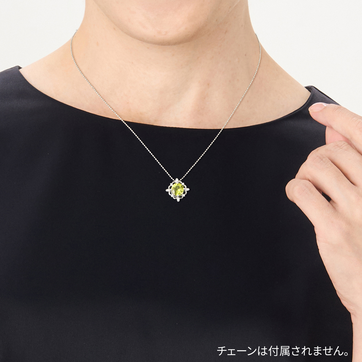 美しいオリーブグリーンと、しっとりとした艶が魅力の宝石。プラチナに爽やかなペリドット色合いが際立つデザインです