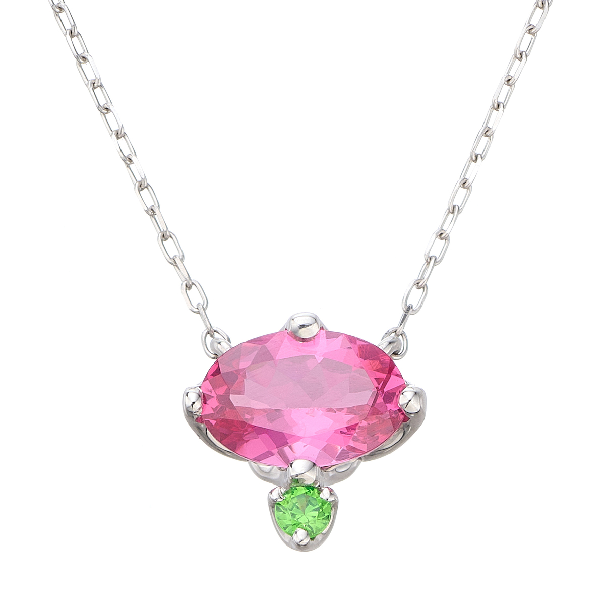 艶やかなピンクスピネルが目を引くペンダント。日独宝石研究所でタンザニア産と判定されたピンクスピネルに、冴えたグリーンのデマントイドガーネットを添え、草花を思わせるのびやかな表情に仕上げました。プラチナの澄んだ輝きが色のコントラストを際立て、装いを印象的に彩ります