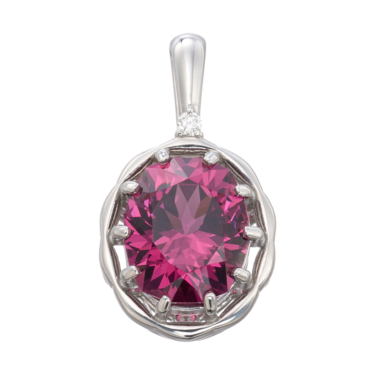 草花をイメージした洗練されたデザイン。バチカンにはさりげなくダイヤモンドが煌めき、ロードライトガーネットの美しい色合いを引き立てています