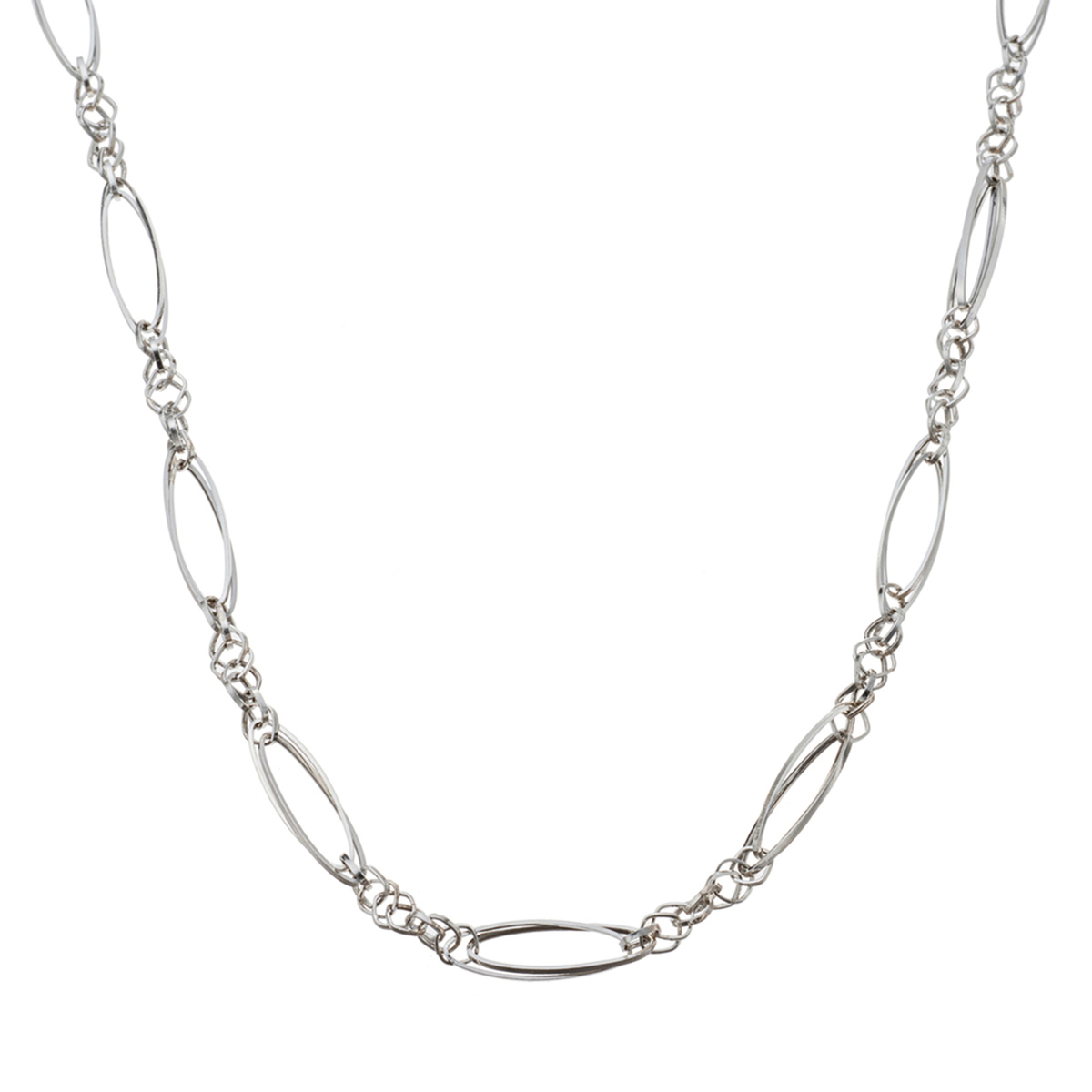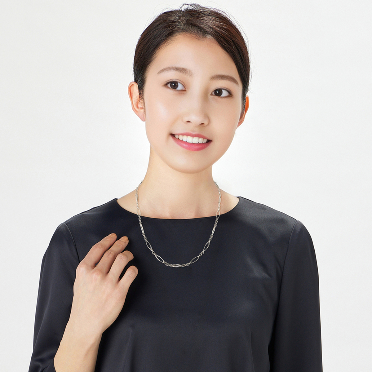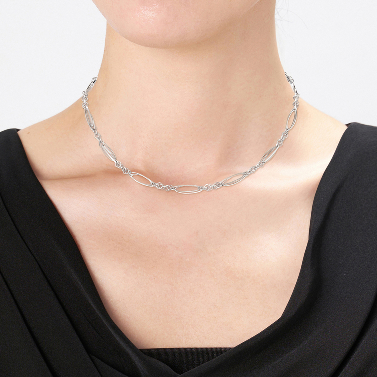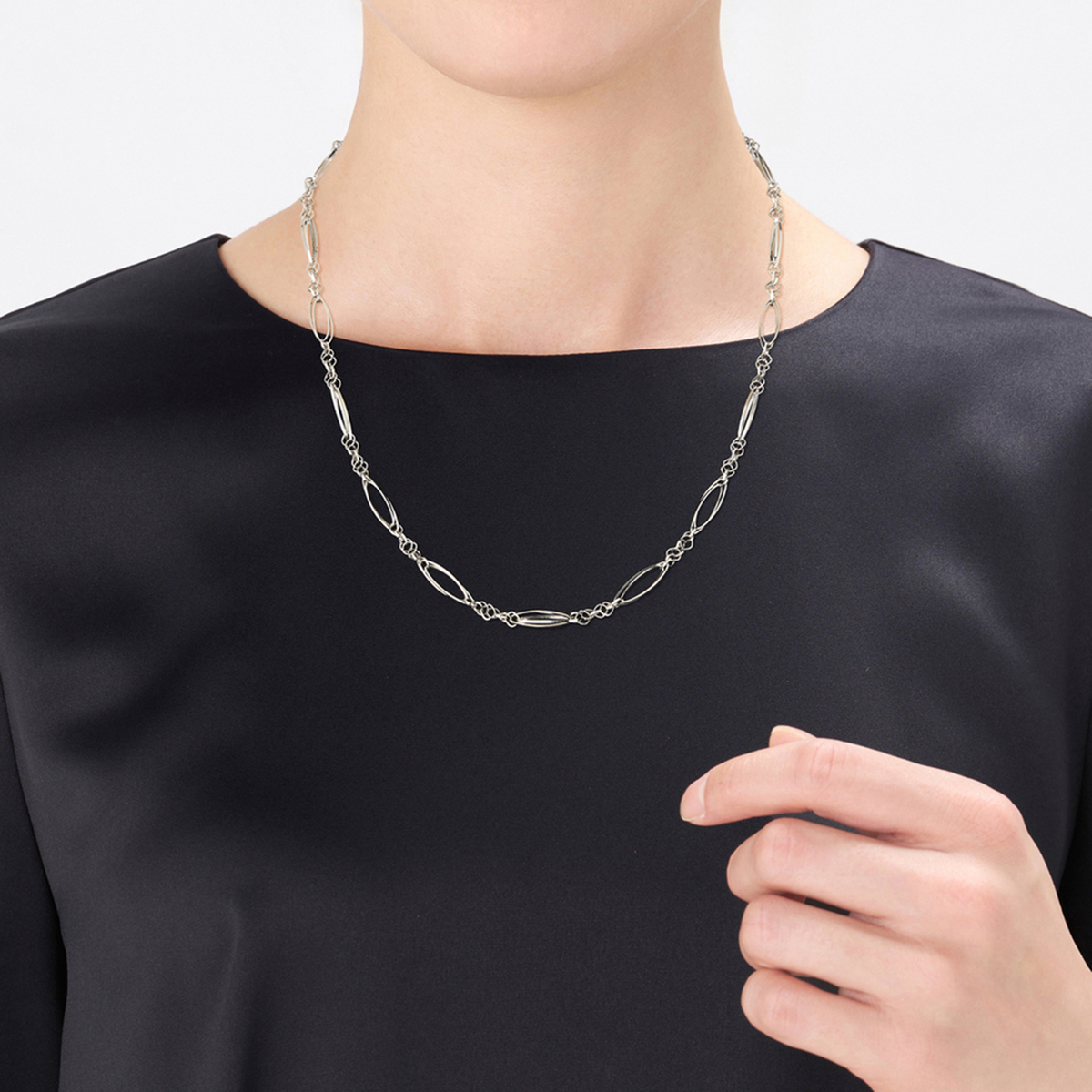 マーキス型とスクエア型のパーツをリズミカルに組合せたネックレス。マーキスパーツをダブルに重ね、スクエアパーツの組み方を工夫することで、立体的に仕上げました。ほどよいボリューム感がありつつも気品のあるデザインで、純プラチナの艶やかな輝きとともにお楽しみいただけます
