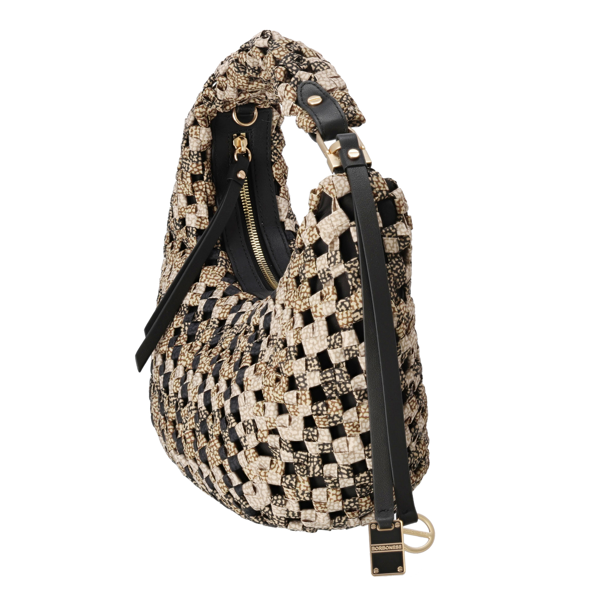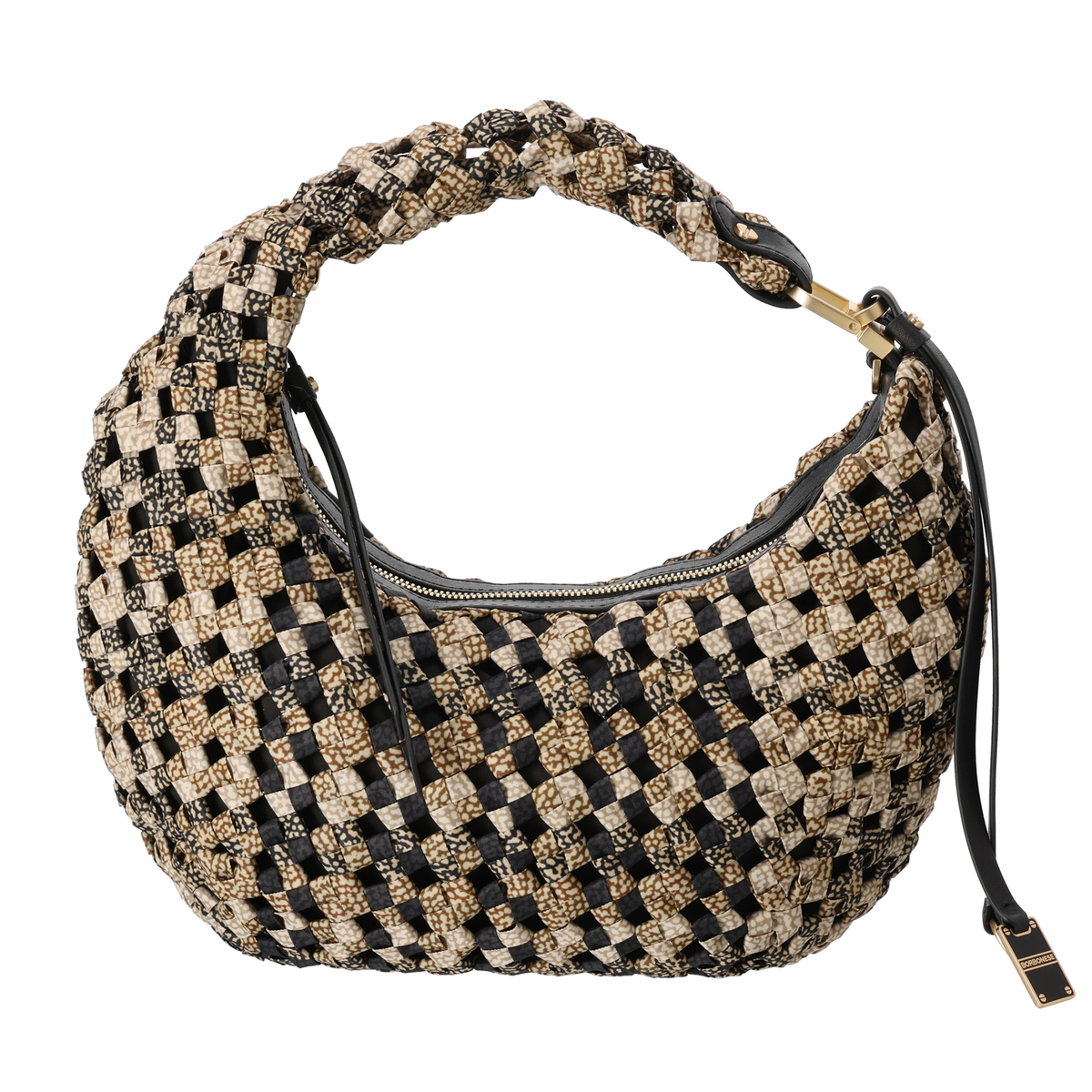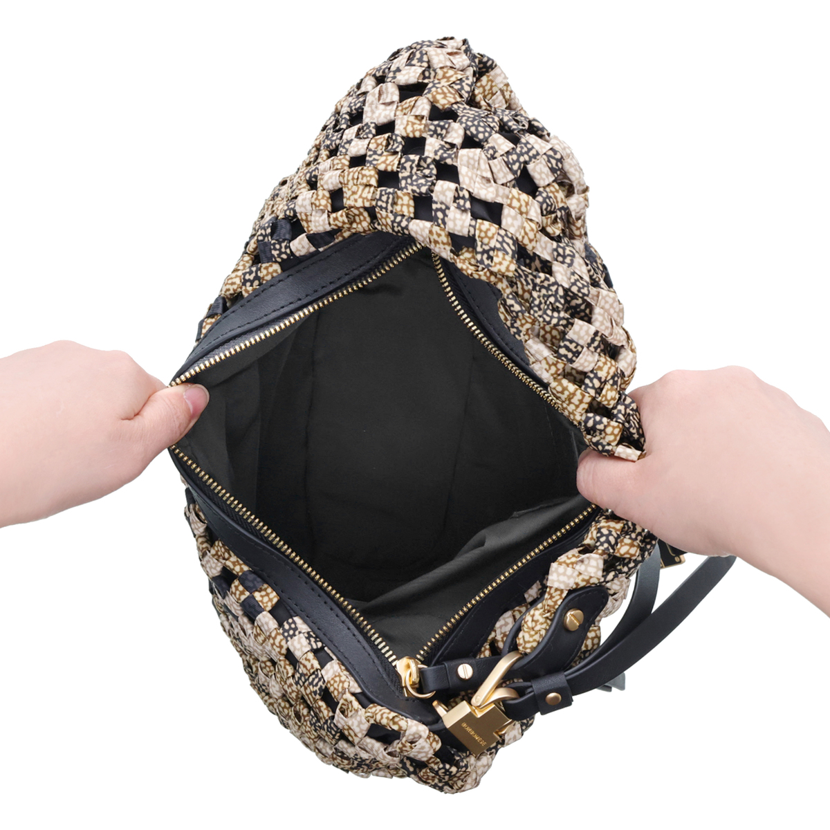 ウズラ柄や無地カラーを編み込んだおしゃれな本体と、レザーのファスナートリミングやスライダーが高級感をプラス。ファスナーも大きく開くので中身が取り出しやすく、裏地も付いています
