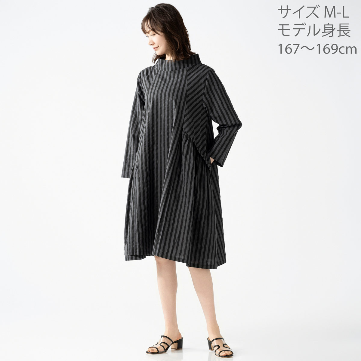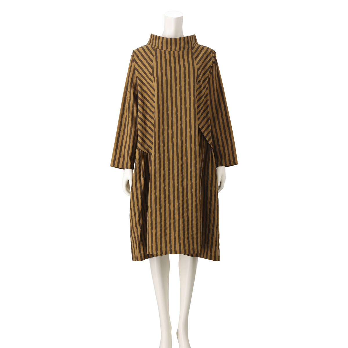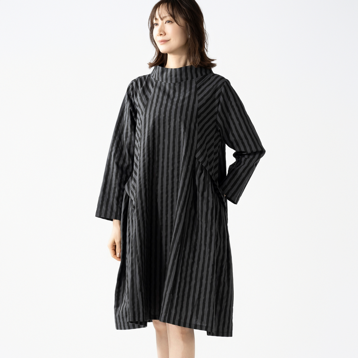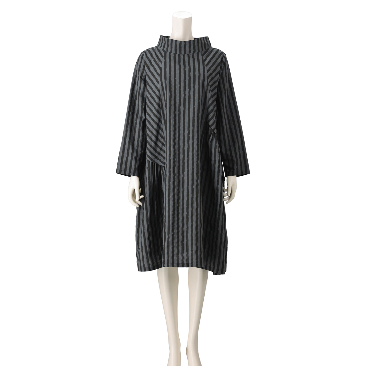 変則的なストライプ柄が表情に動きを添えるワンピース。襟元はボトルネックにすることで首周りがすっきり見えます。両サイドに太めのタックを入れた大胆で愛らしいデザインで、両サイドには実用的なポケットを付けました