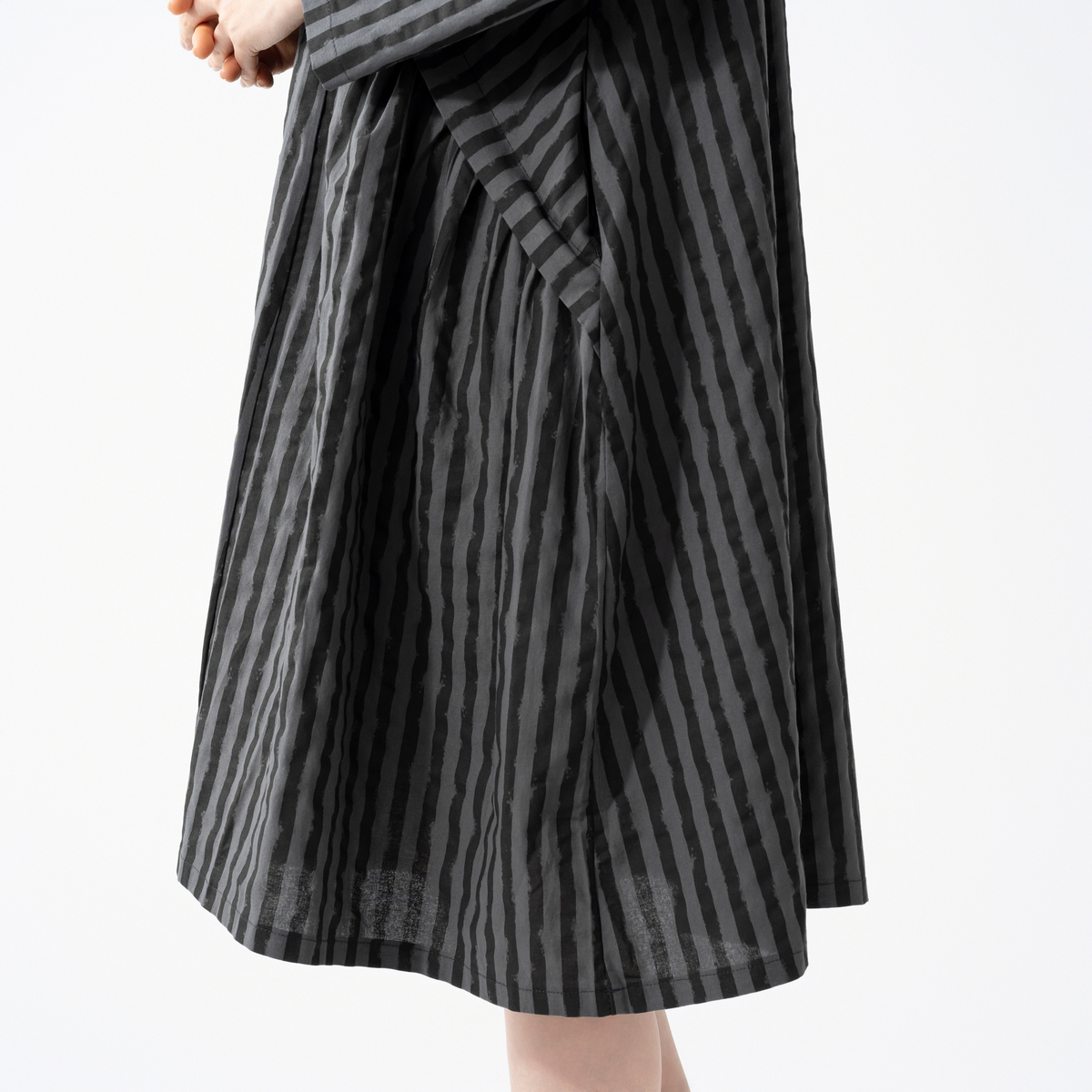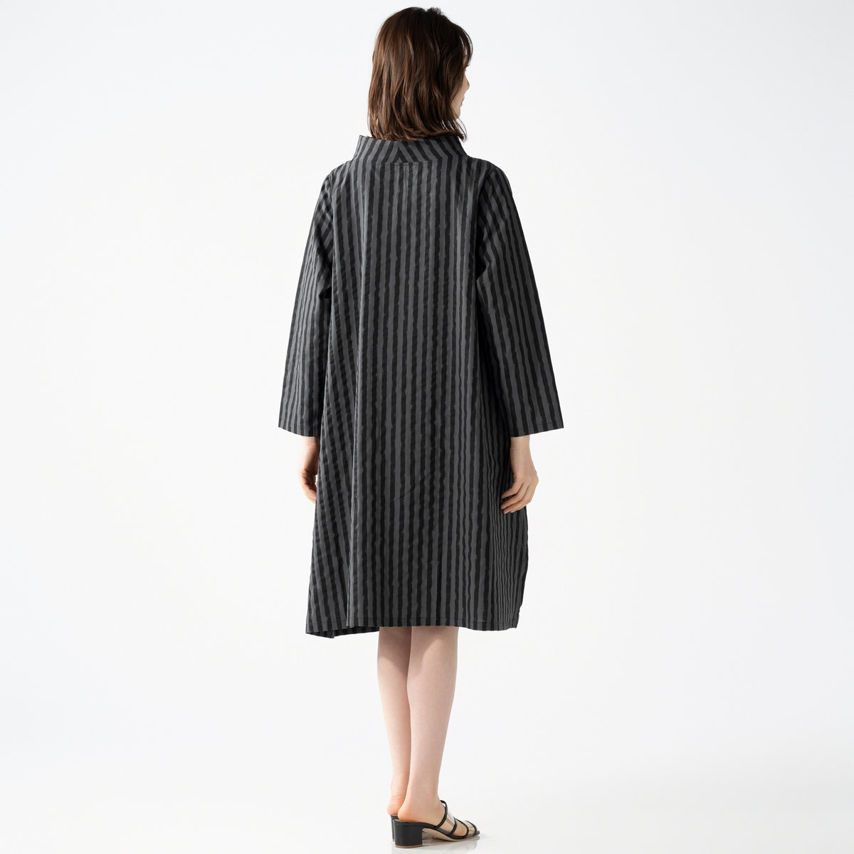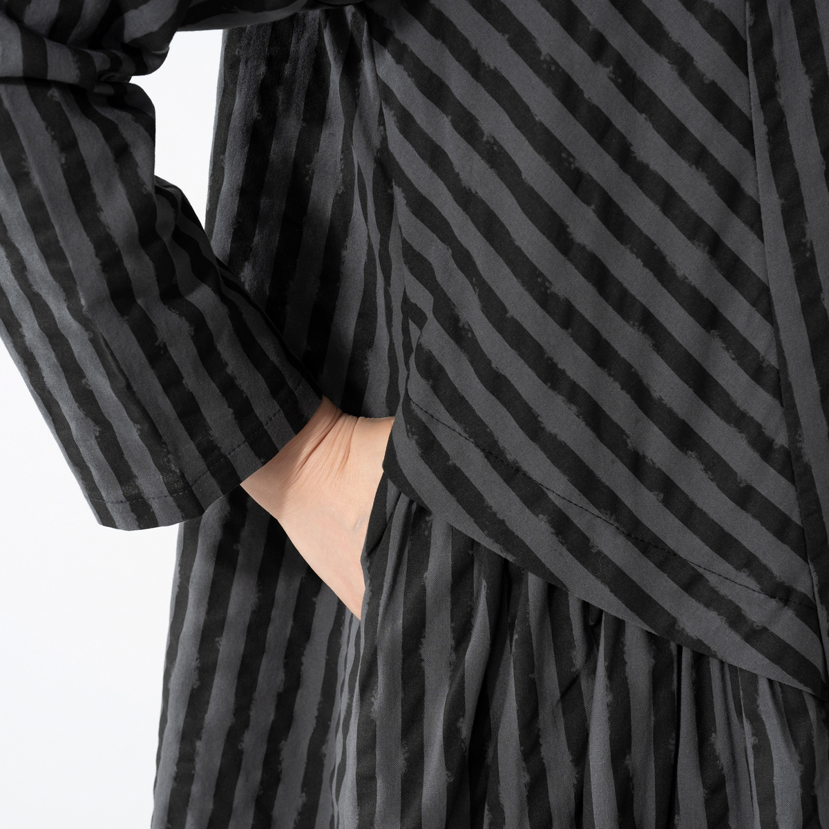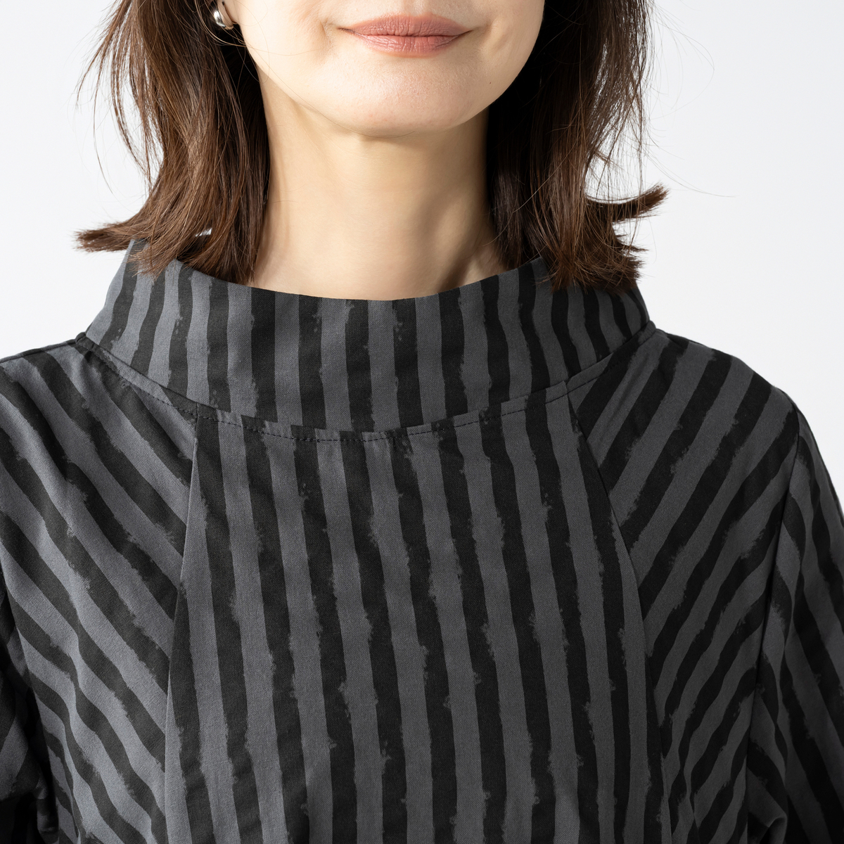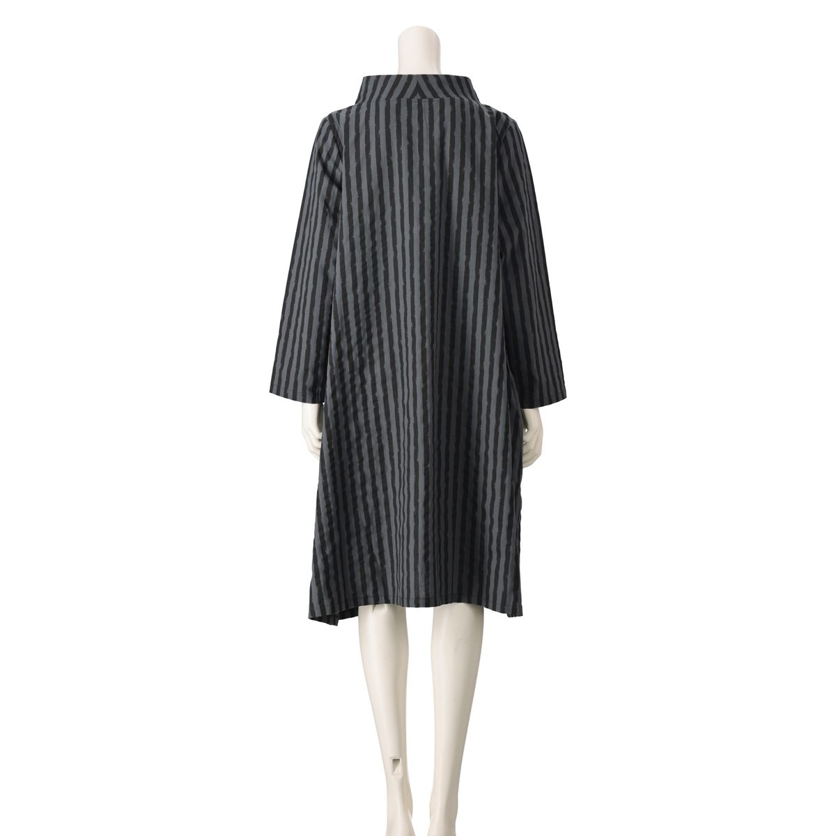 変則的なストライプ柄が表情に動きを添えるワンピース。襟元はボトルネックにすることで首周りがすっきり見えます。両サイドに太めのタックを入れた大胆で愛らしいデザインで、両サイドには実用的なポケットを付けました