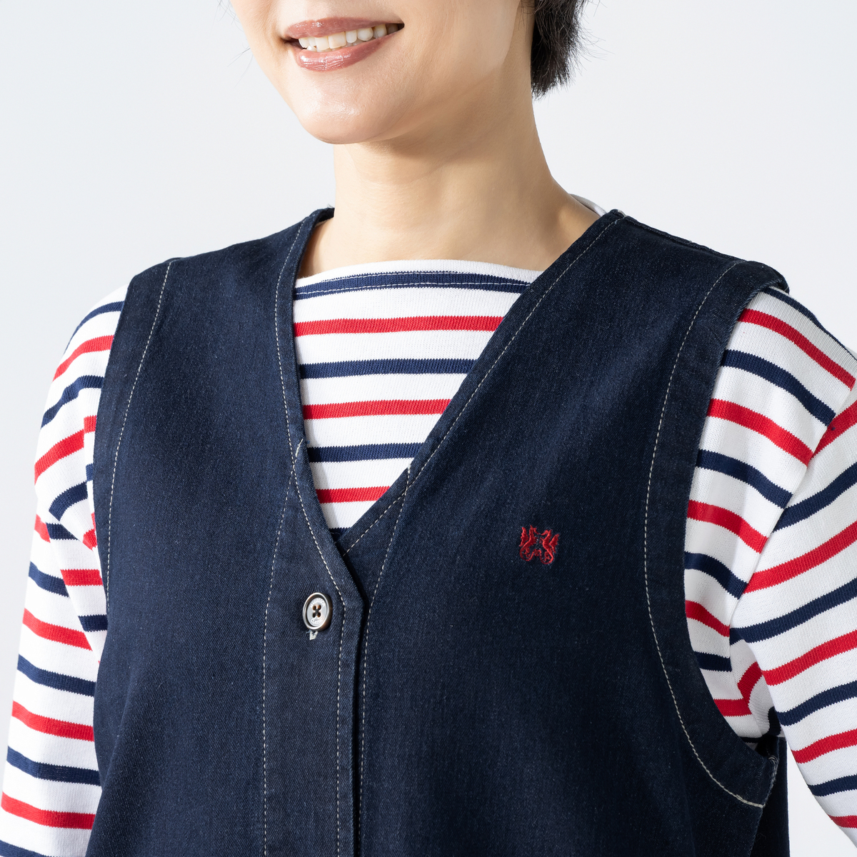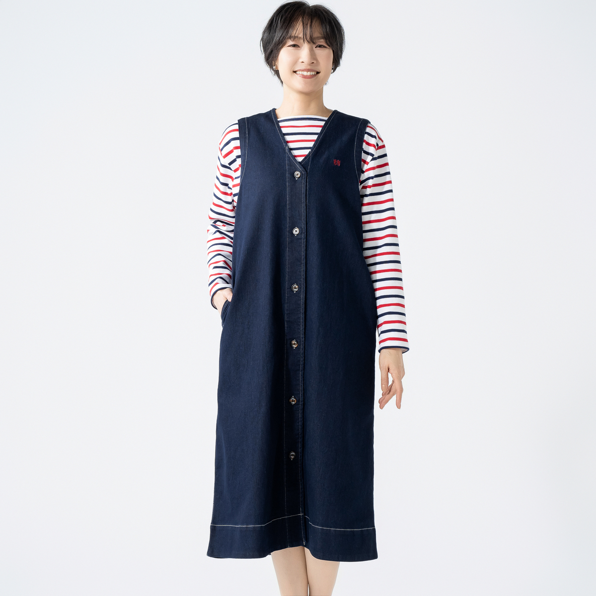 [商品寸法(ヌード)cm] サイズ バスト 着丈 S : 100(72〜80) 115 M : 104(79〜87) 115 L : 108(86〜94) 115 LL : 113(93〜101) 116 3L : 118(100〜108) 116 サイズ 肩幅 S : 35 M : 36 L : 37 LL : 38 3L : 39 [素材] ネイビー、ブルー: 綿 64% ポリエステル 25% レーヨン 9% ポリウレタン 2% グレー: 綿 63% ポリエステル 21% 再生繊維(セルロース) 12% レーヨン 2% ポリウレタン 2% [お手入れ] 洗濯機洗い可 [注意事項] ※商品寸法の誤差は多少発生します。ご了承下さい ※無蛍光洗剤使用 ※洗濯ネット使用 ※あて布使用 ※着用時の摩擦(特に雨や汗により湿った状態での摩擦)で他の衣料やバッグ、椅子やソファー、車のシート等に色が移る場合がありますのでご注意下さい。万が一移染した場合は、移染した衣類等の早めのお手入れをお願いします。また、濃色は水洗いで色落ちや色移りの恐れがありますので淡色との洗濯は避け、洗濯後は速やかに干して下さい。長時間のつけ置き洗いや濡れたままの重ね置きはお避け下さい ※この商品は長時間日光に当たり続けると色あせの恐れがありますご注意下さい。洗濯後は必ず陰干しして下さい淡色のものとの組み合わせは極力お避け下さい。デニムの色が移る可能性があります ※生地の特性上、過度の引っ張りを受けると縫い目が開いたり、破れたりすることがありますのでお取り扱いにはご注意下さい 【中国製】