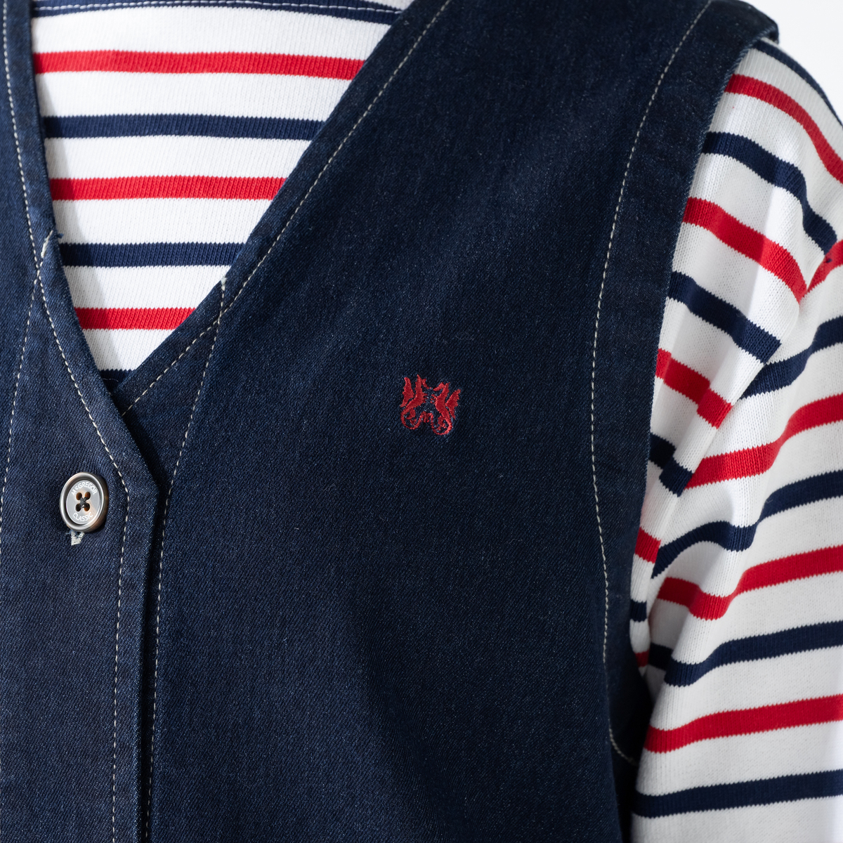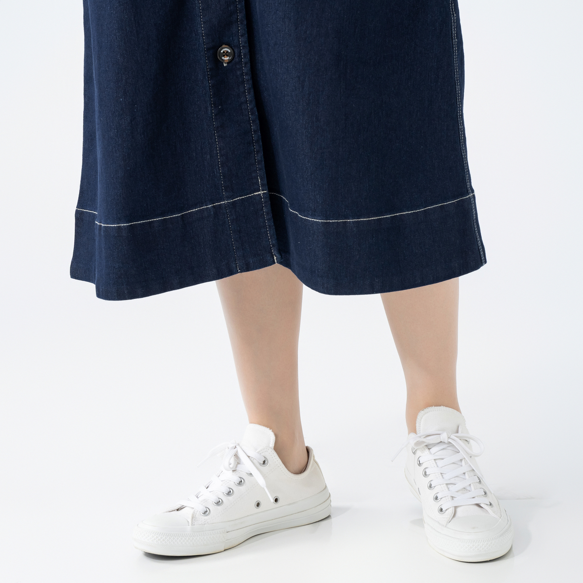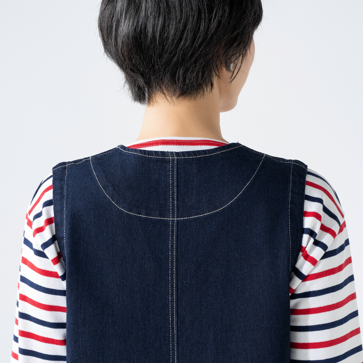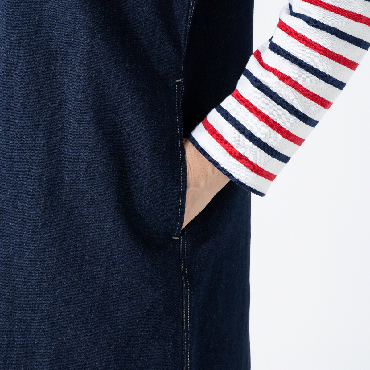 8.5ozのデニムのツイル素材を使用したジャンパードレス。コットン混の自然なぬくもりに、ポリウレタンをブレンドすることで、しなやかな伸びとふっくらした肉感を両立しています