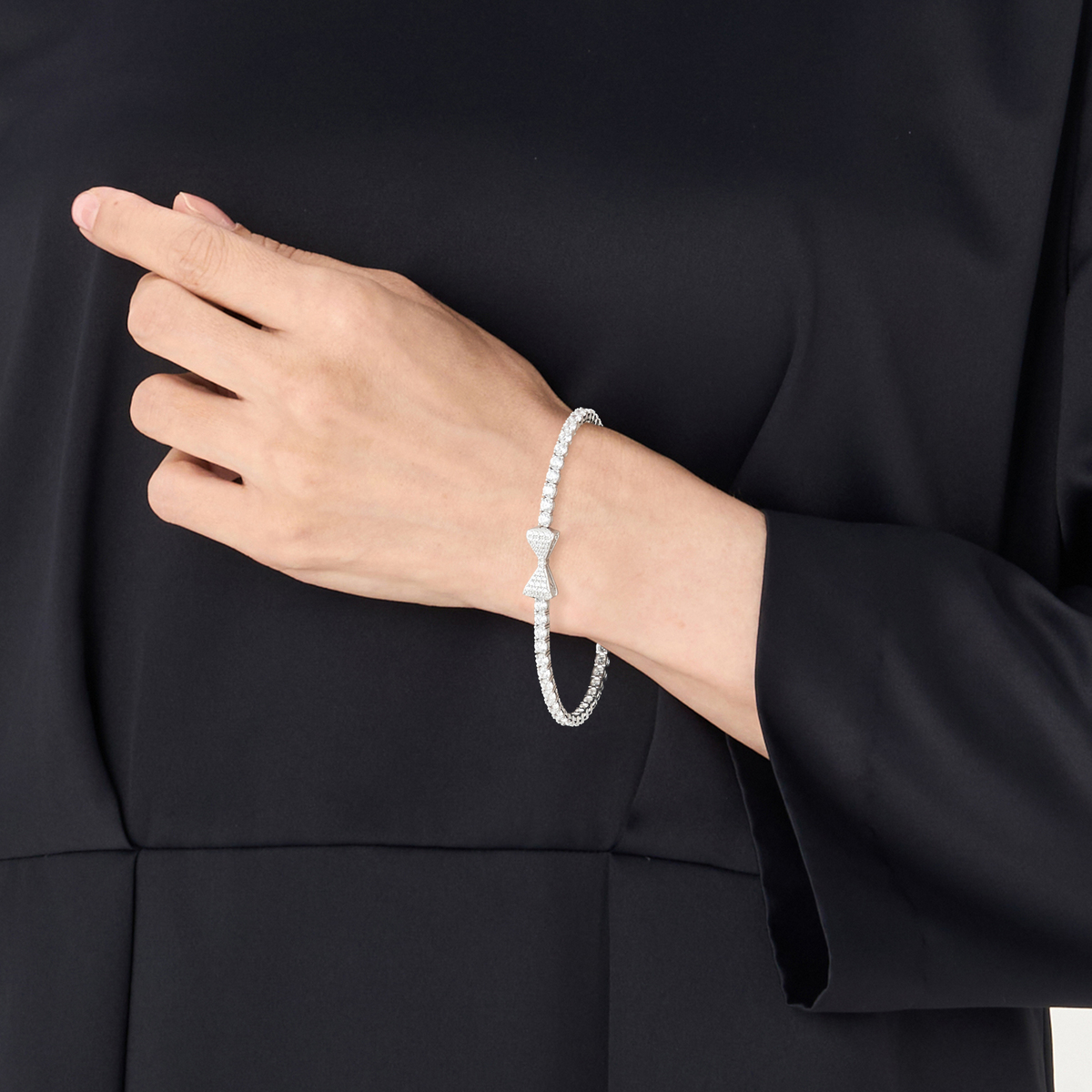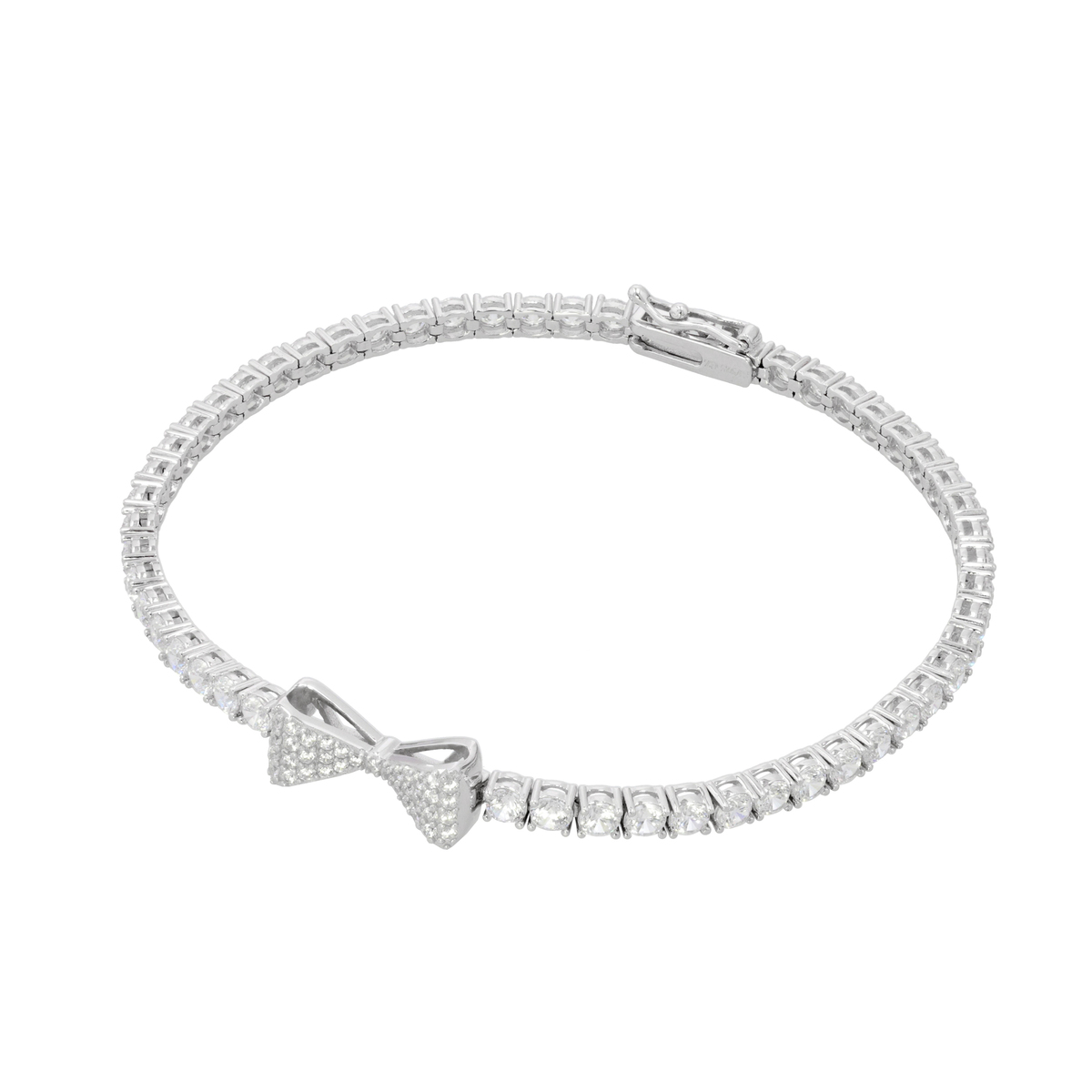リボンモチーフをあしらい、ダイヤモニークをふんだんに使用したブレスレットです。豪華な輝きと可愛らしさのあるデザインで、優美な印象を与えます