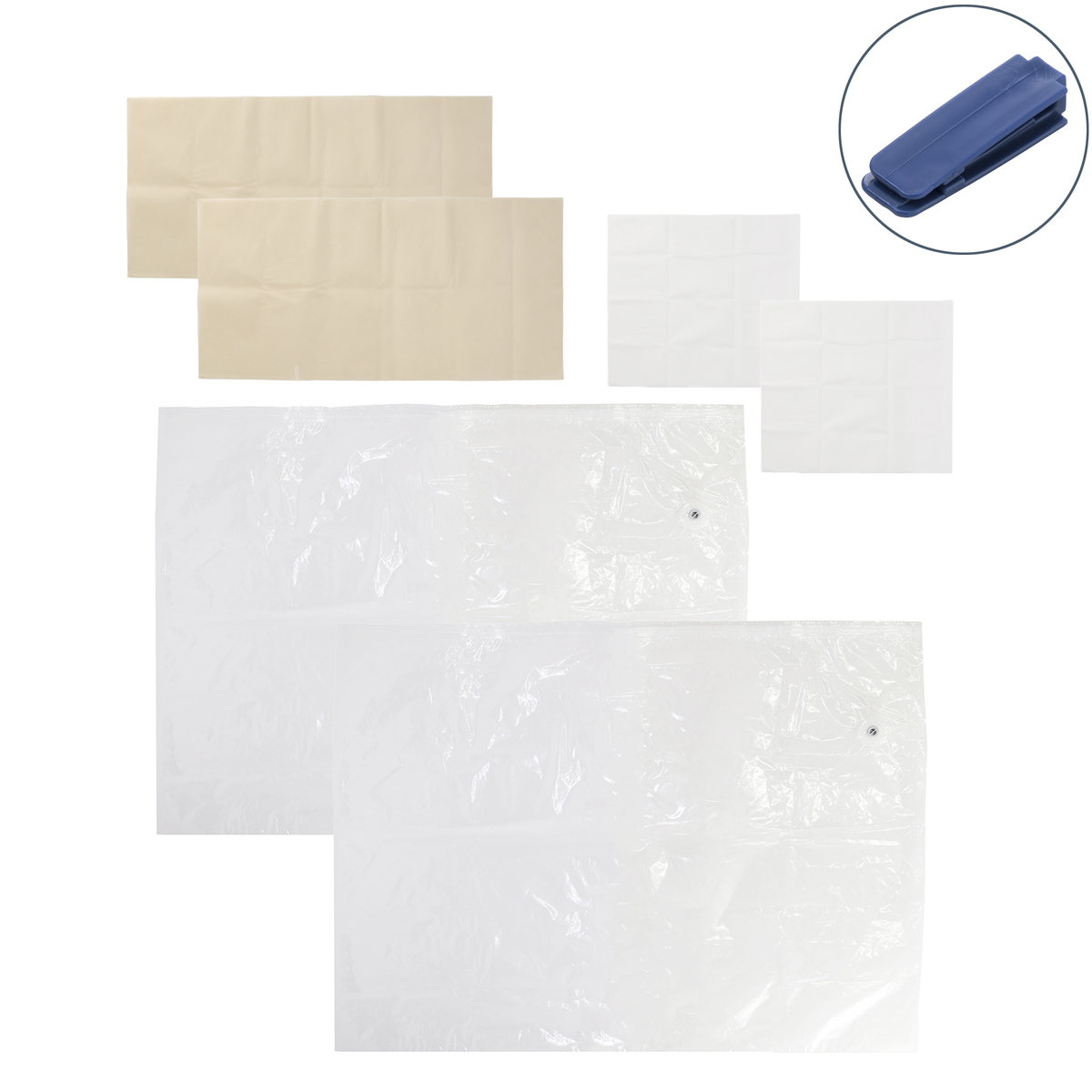 [商品内容] ・圧縮袋×2 ・保管チューブ×2 ・抗菌防臭・防ダニシート×2 ・スライダー×1個 [サイズ] 圧縮袋:120×92cm 保管チューブ:約直径30×長さ90cm(布団、圧縮袋封入時) 抗菌防臭・防ダニシート:約40×60cm [収納目安] シングルサイズ掛け布団1枚 ダブルサイズ掛け布団1枚 [使用方法] <圧縮方法> 羽毛ふとんを入れた圧縮袋の空気を電動吸引ポンプ(掃除機ノズル)で80%程度(目安は羽毛ふとんの厚みが10cm程度)抜いたら、吸出口のフタを閉じ、吸出口が表側になるようにファスナーの反対側からクルクルと巻き保管チューブに入れます。その後、吸出口のフタを持ち上げ空気を入れ、空気が入らなくなったらフタを押して閉じます <圧縮袋から取り出す時> 電動吸引ポンプ(掃除機のノズル)で吸出口から空気を吸い出し、保管チューブがゆるくなったら吸出口のフタをしてふとんを取り出します。取り出したふとんは、風通しの良い日陰で干してからご使用ください 【日本製】 [注意事項] ※ハンディータイプの掃除機では圧縮できません ※収納する際ファスナー部が二つに折れたり、ねじれたりしないようにしてください。クギなどで圧縮袋が傷付きますと空気が漏れますのでご注意ください。ペットのいるご家庭では、犬や猫の爪等で圧縮袋に傷が入り、空気侵入の原因となる恐れがありますのでご注意ください。ふとん収納時に圧縮袋を引きずったりしないで下さい。 ※ノズル直径が35mm以上の掃除機でも圧縮できます ※お手入れの不十分なものを収納しますと、圧縮袋のファスナー、吸出口部分、フィルム内面など密閉する為の主要部分にゴミほこり、髪の毛などが付着しこれらが密閉を阻害し空気が入ってしまう事が起こります。また臭いの発生する下人にもなりますので、圧縮収納する際は収納物を十分にお手入れしてから行って下さい ※抗菌防臭・防ダニシート「ボナレックス/R」の効果は透明袋からの取り出し後、約1年です ※圧縮袋に傷・穴をあけてしまった場合そこから空気が漏れることがあります。穴をセロテープなどでふさいでいただければ再度ご使用になれます ※ファスナーを閉じる時は必ずスライダーをご使用下さい。指だけの作業では空気が入ってしまいしっかり圧縮出来ません。また、ファスナーのかたよりが起こりやすく、ファスナー端部で片方のファスナーが余る可能性があります ※ふとん圧縮袋は本来の使用目的以外のご使用は絶対にしないでください ※圧縮袋を熱や火に近づけたり、刃物や突起物で傷つけないようにして下さい ※ノンダスト布団(ほこりの出ない布団)は、製品の機能上、中綿及び側生地の密度が高く空気抜けが悪い為、圧縮できません