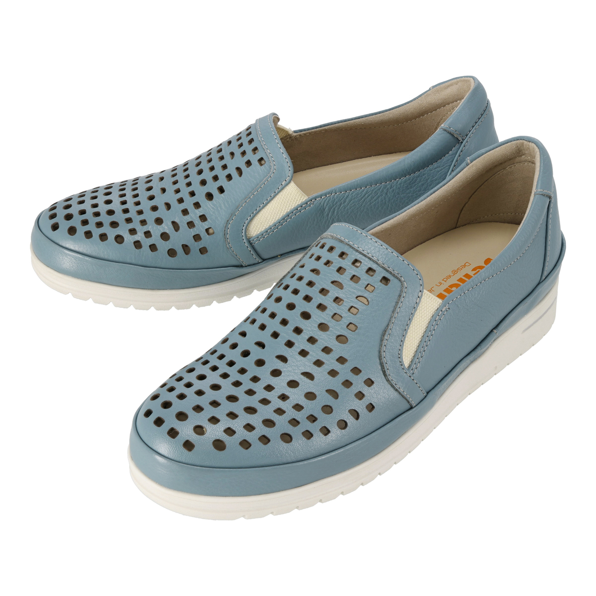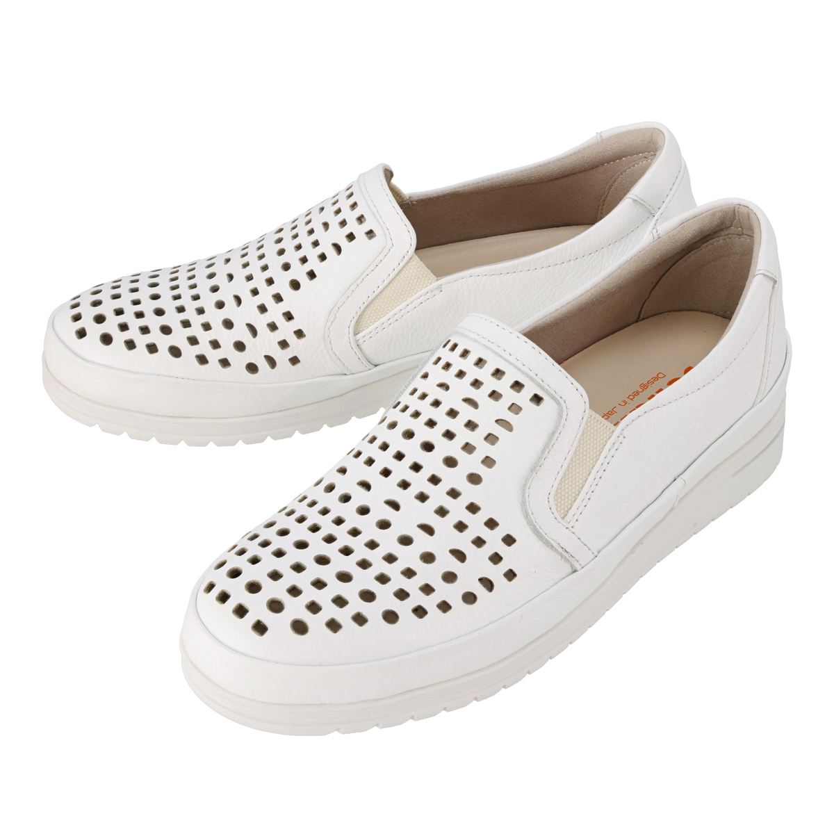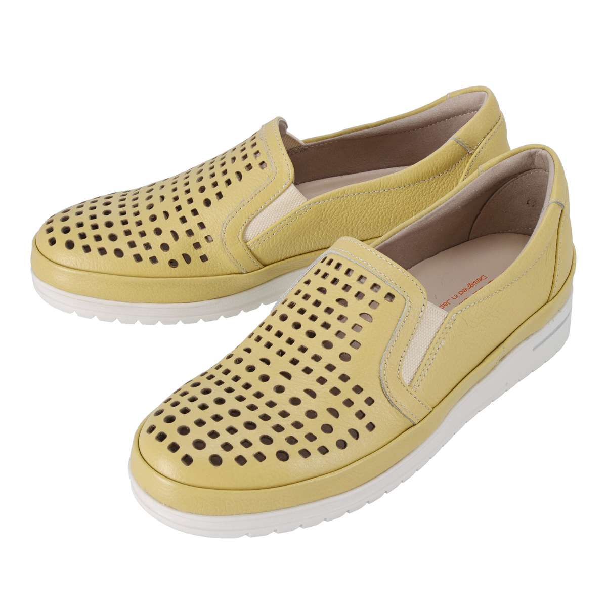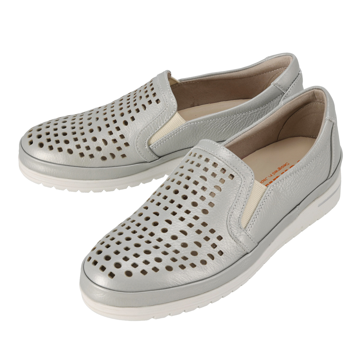 前面のパンチングで通気性があり、蒸れにくい仕様に。ゆとりのある設計にサイドのゴムパネルを組合せ、フィット感を支えます。柔らかなシボ感のあるパステル調牛革と白ソールの組合せで、爽やかで軽やかな印象に。踵部分にはメタリックカラーのアクセントを施しています