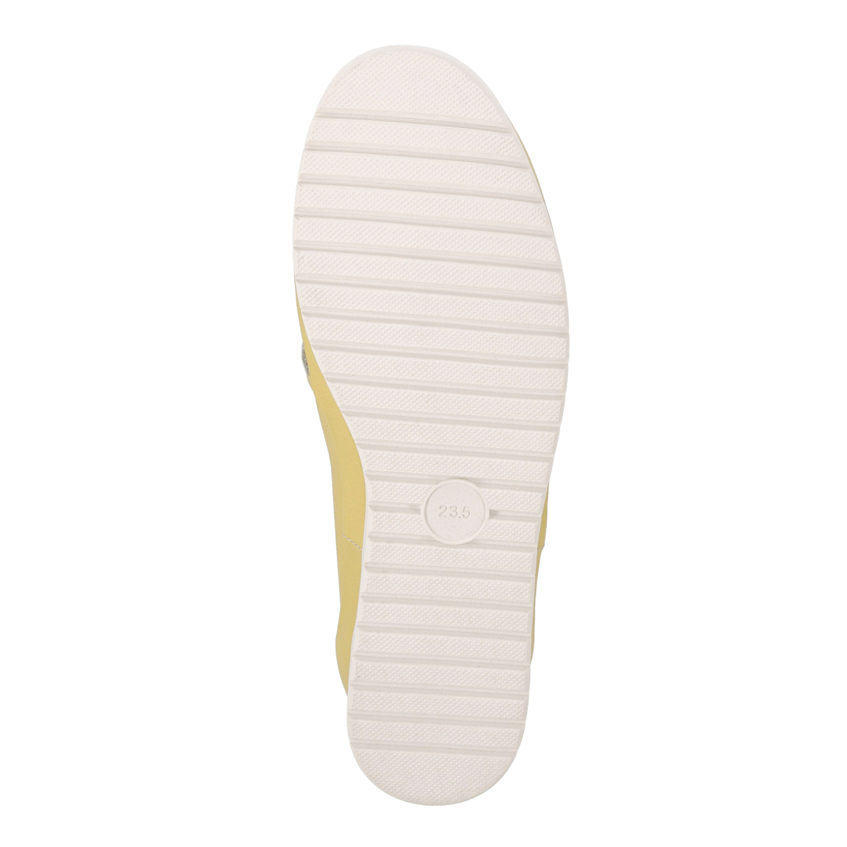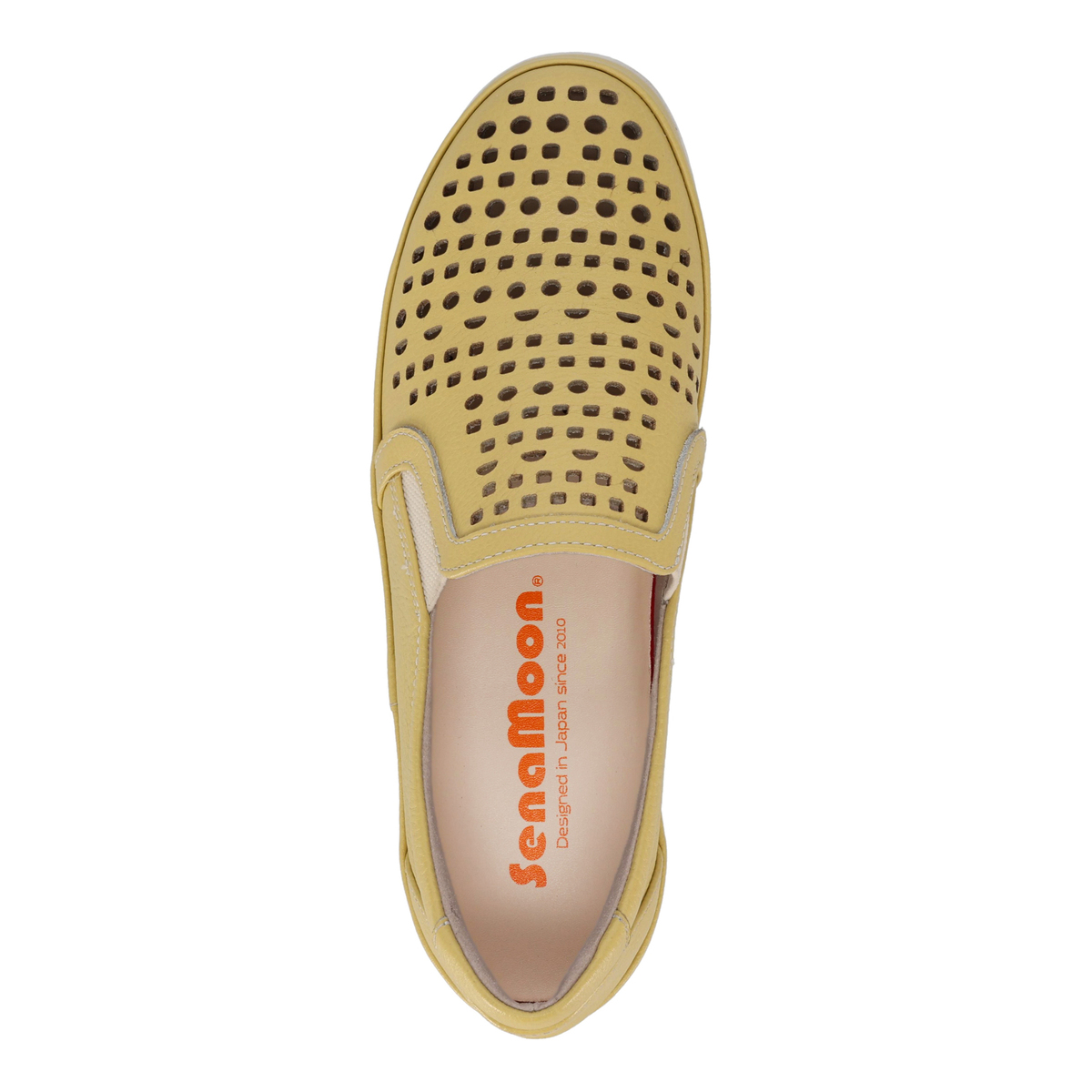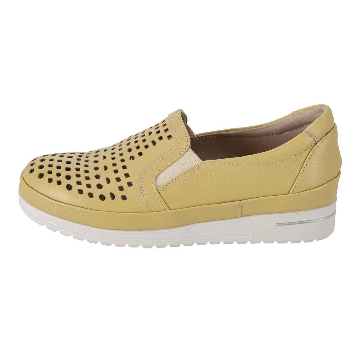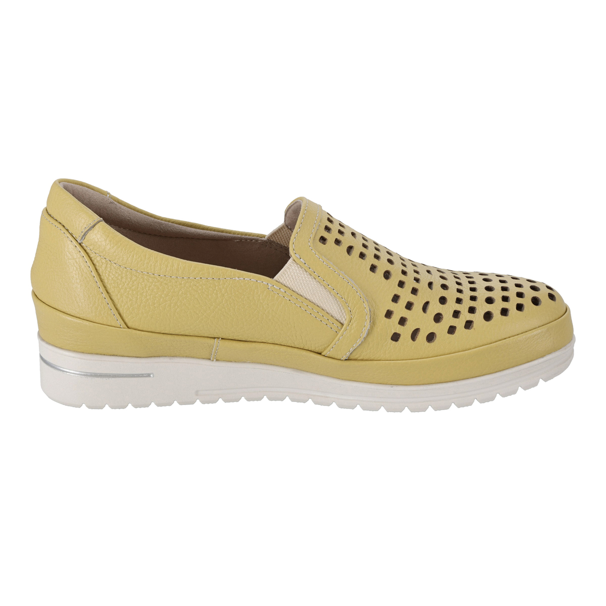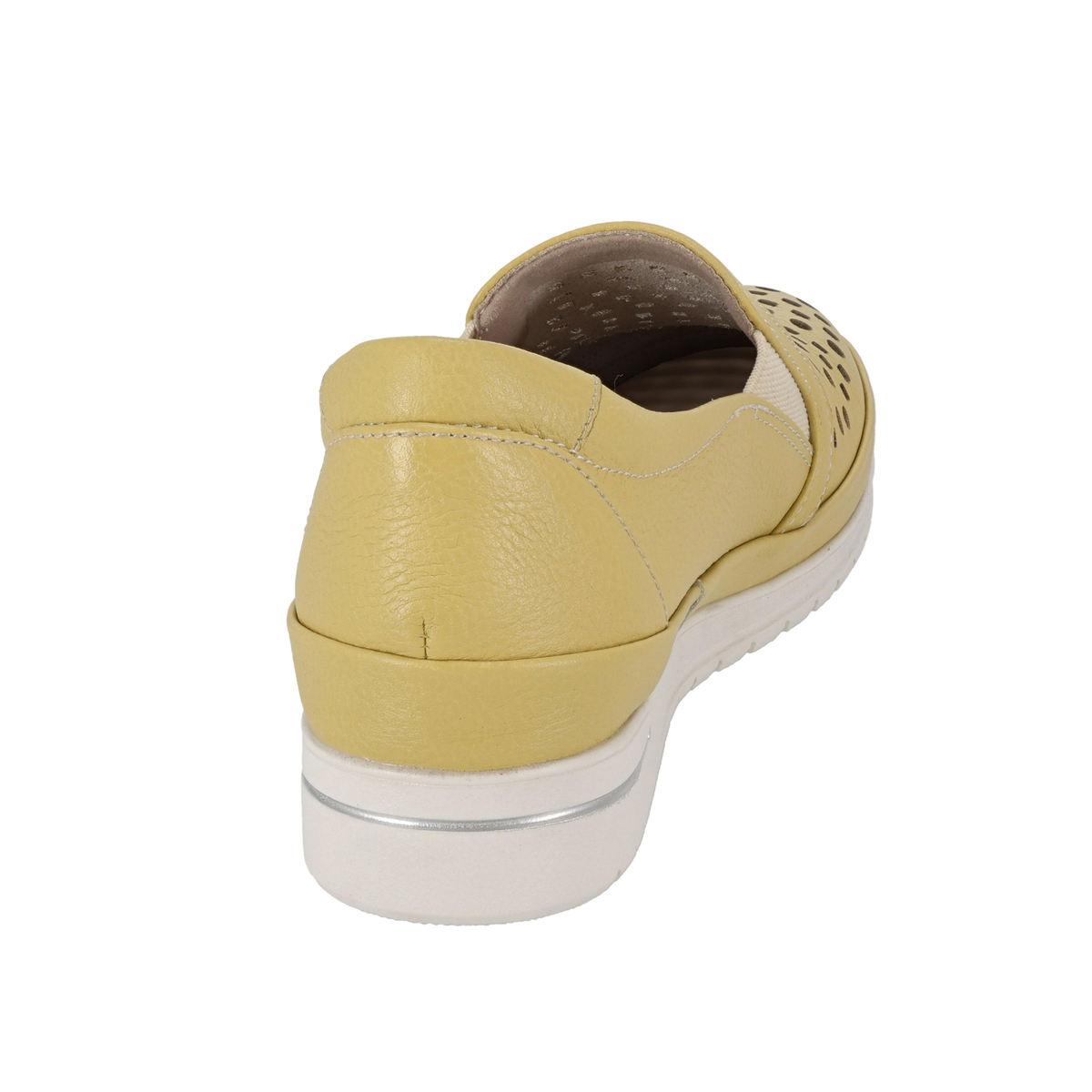 前面のパンチングで通気性があり、蒸れにくい仕様に。ゆとりのある設計にサイドのゴムパネルを組合せ、フィット感を支えます。柔らかなシボ感のあるパステル調牛革と白ソールの組合せで、爽やかで軽やかな印象に。踵部分にはメタリックカラーのアクセントを施しています