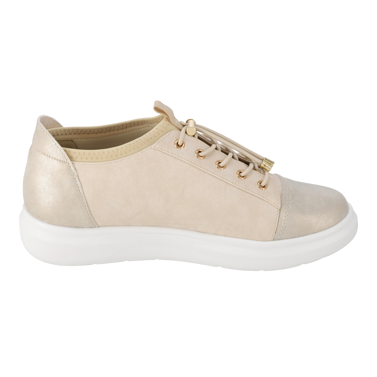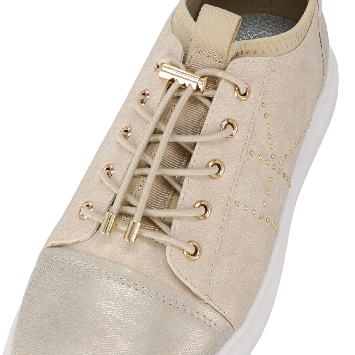 アッパーは撥水仕様で水を弾きます。中敷きは取り外して手洗いでき、清潔に使用可能。履き口はゴム仕様で足首にやさしくフィットし、甲の紐ゴムで脱ぎ履きも簡単です