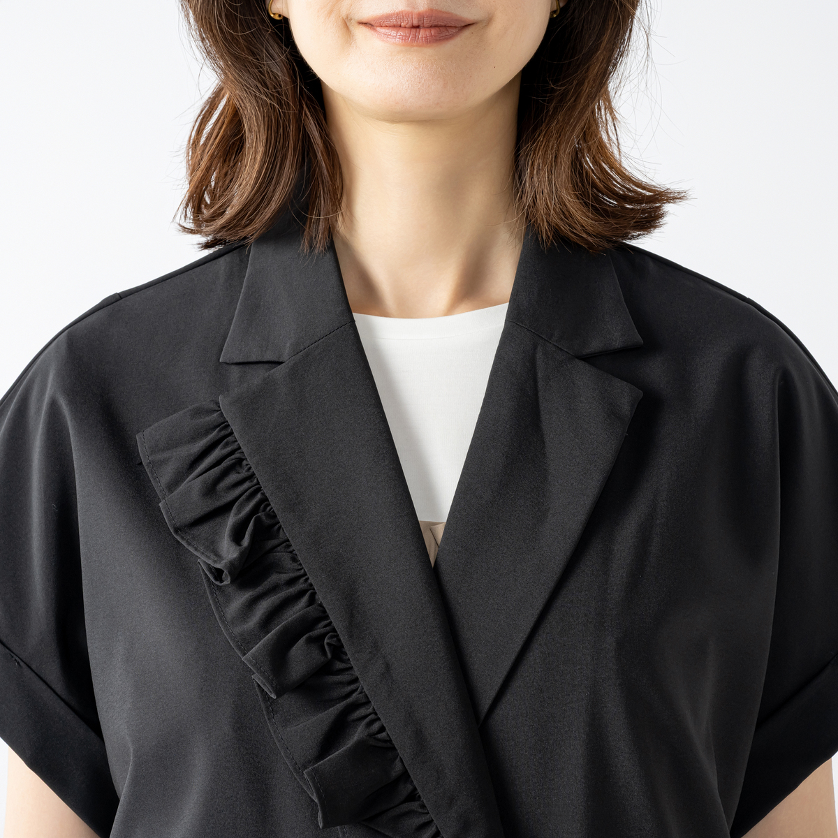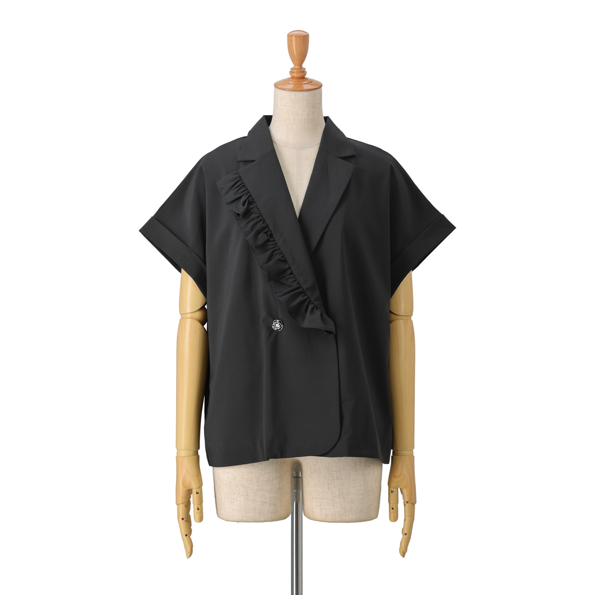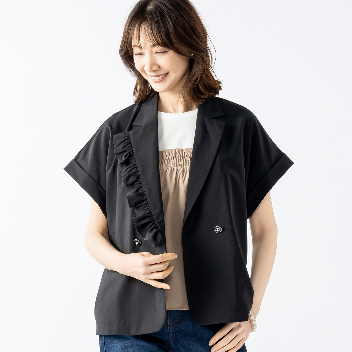 アシンメトリーなフリルをラペルに挟み込み、ほどよい存在感がフェミニンな雰囲気を添えるジャケットです。ダブルのカメリア型ボタンが上品さとモダンさを演出し、大人の華やかさが光ります