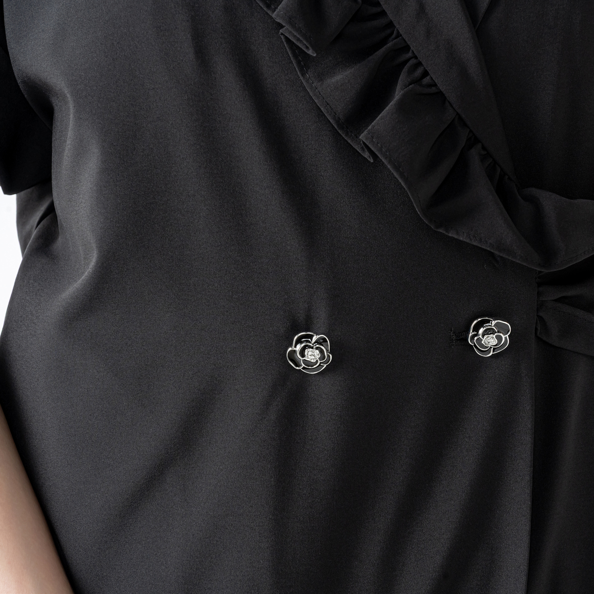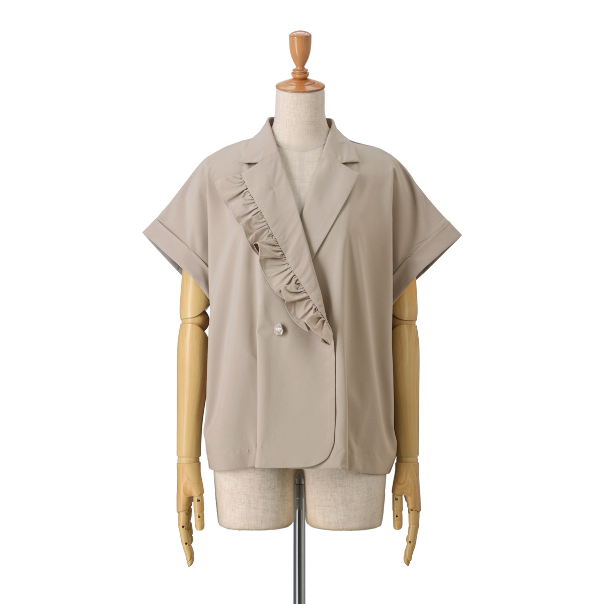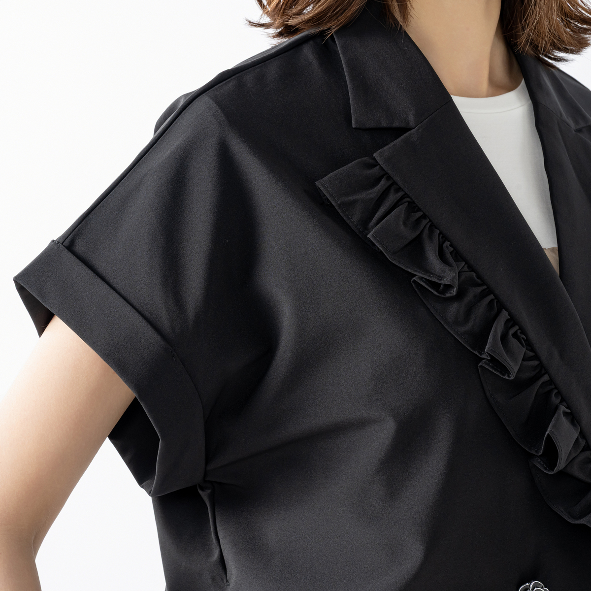 アシンメトリーなフリルをラペルに挟み込み、ほどよい存在感がフェミニンな雰囲気を添えるジャケットです。ダブルのカメリア型ボタンが上品さとモダンさを演出し、大人の華やかさが光ります
