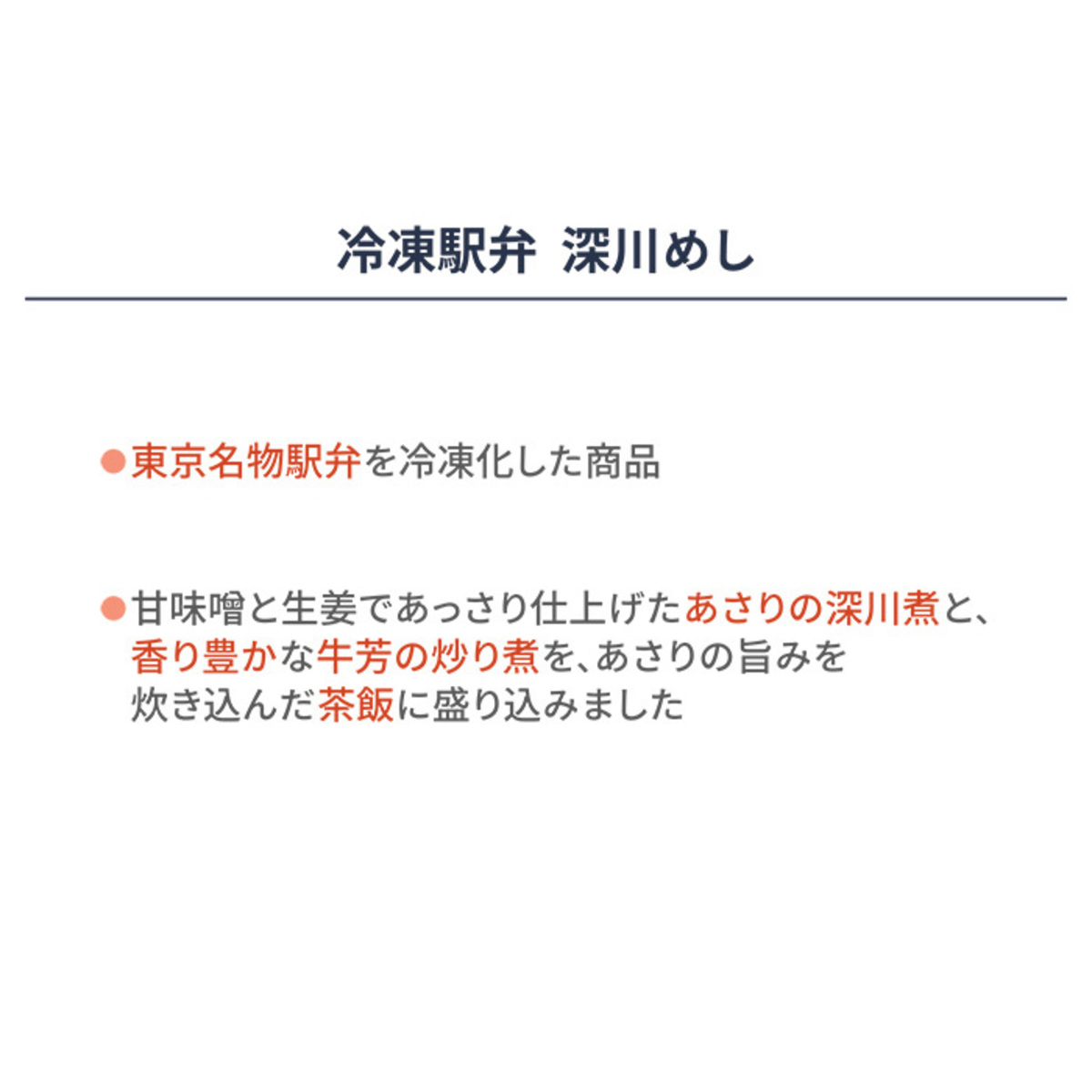 東京名物駅弁「深川めし」を冷凍化しました。甘味噌と生姜であっさり仕上げた「あさりの深川煮」と、香り豊かな「牛芳の炒り煮」をあさりの旨みを炊き込んだ茶飯に盛り込みました