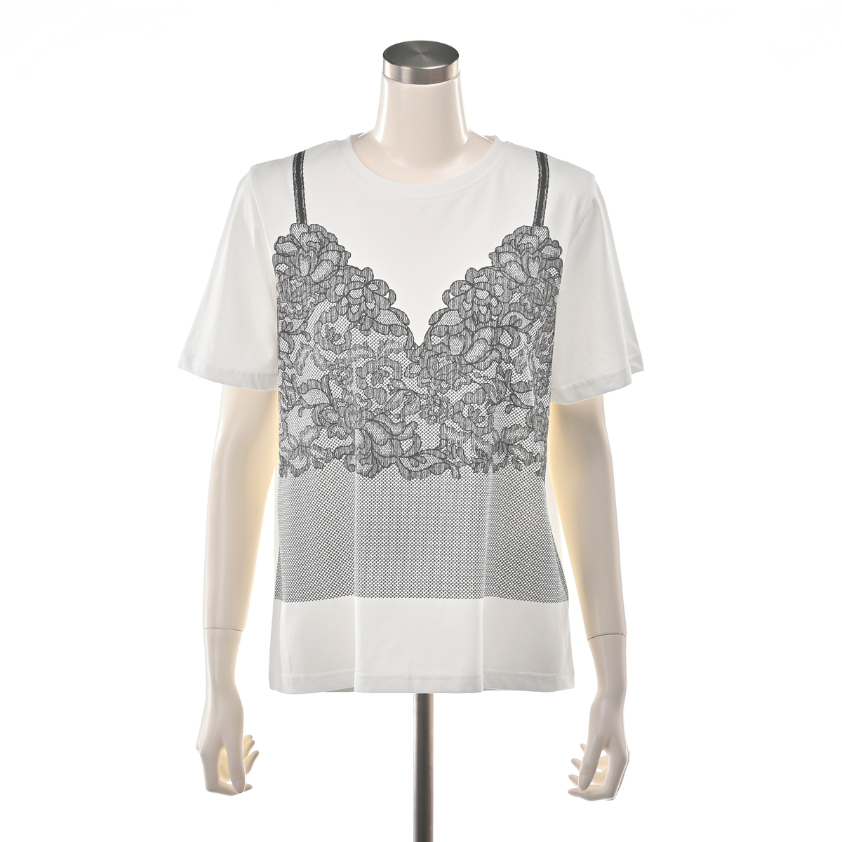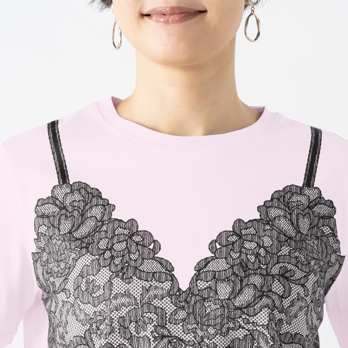 前身頃に繊細なレースのキャミソールを重ね着しているような、プリントを施してデザイン。ストラップから胸元のレースの透け感まで表現された、奥行きのある華やかなデザインです