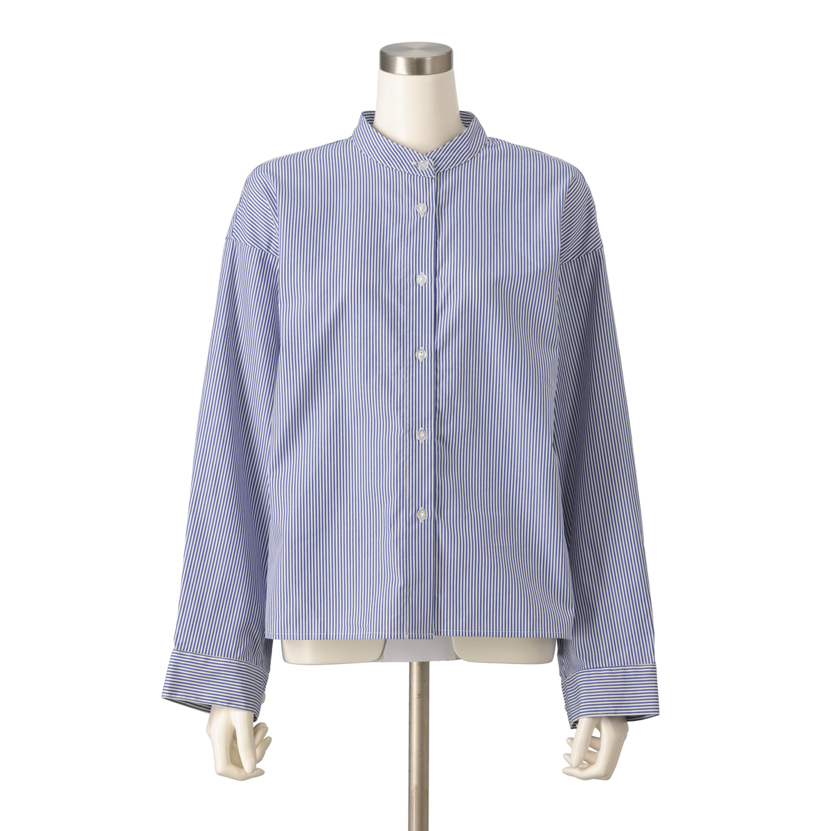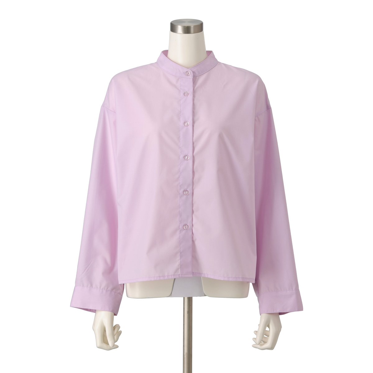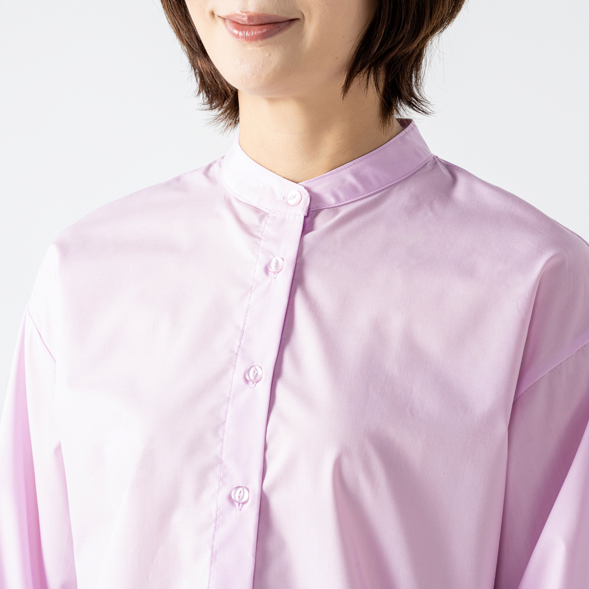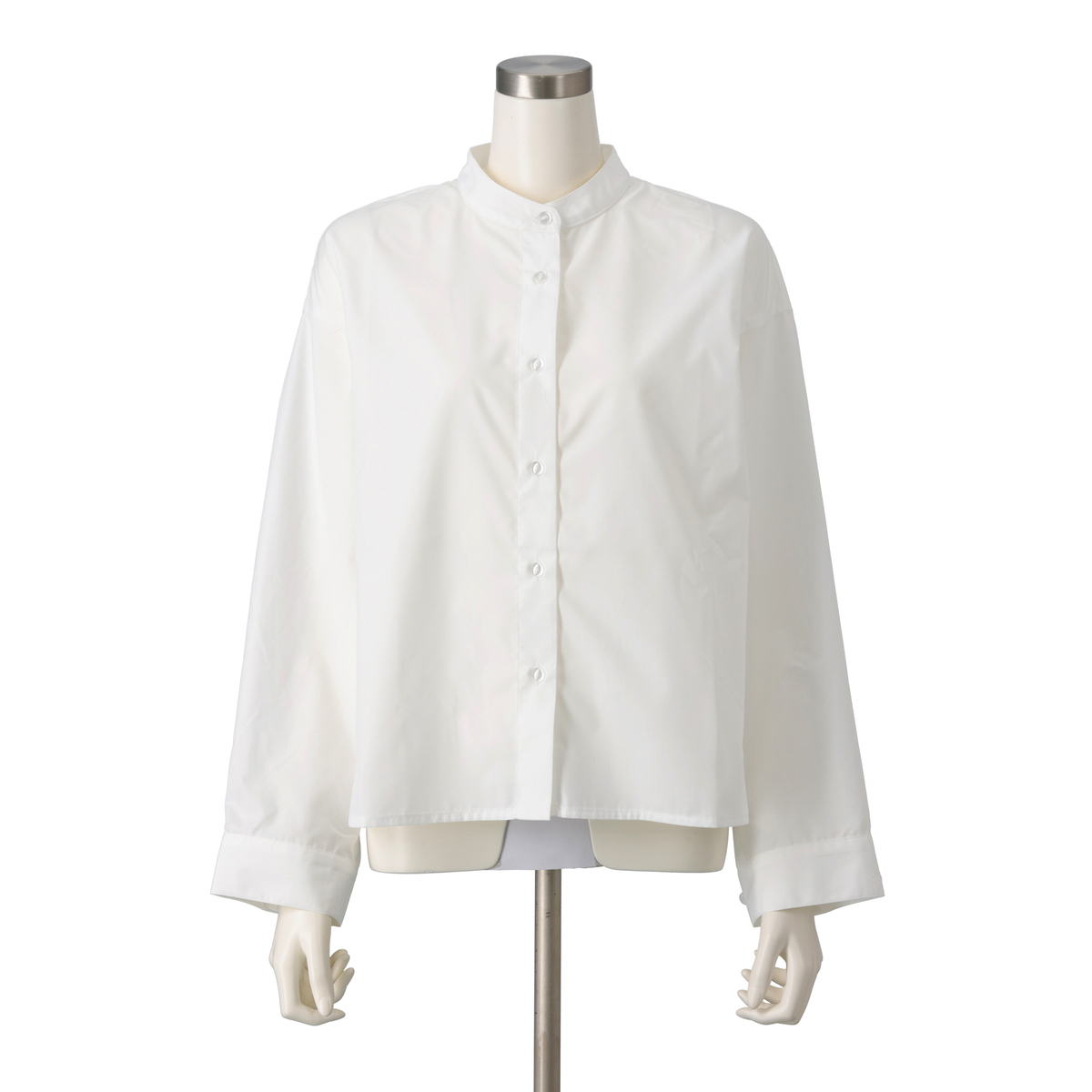 柔らかな丸みを持たせたコクーンシルエットのシャツ。スタンドカラーの衿が首元をすっきり見せてくれます