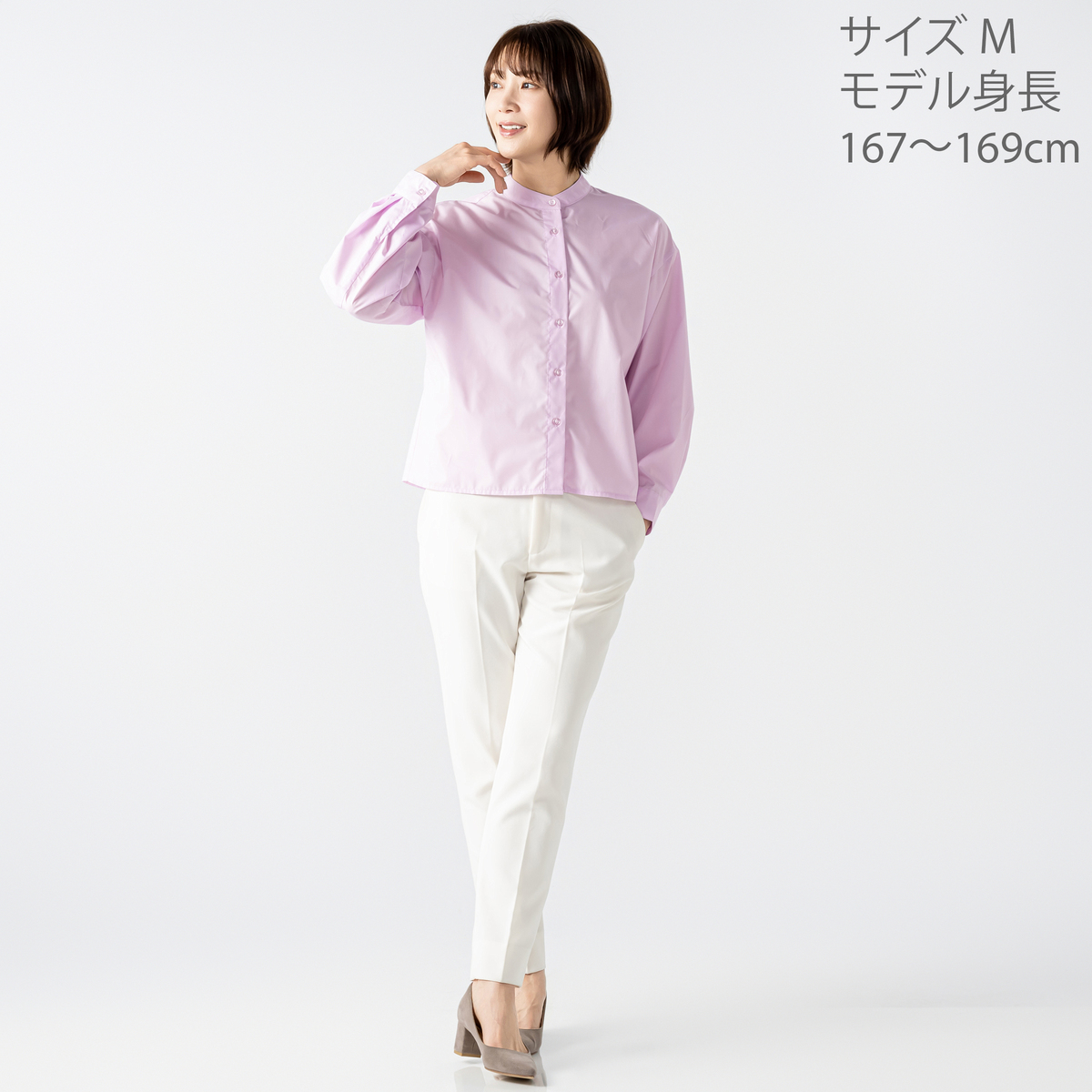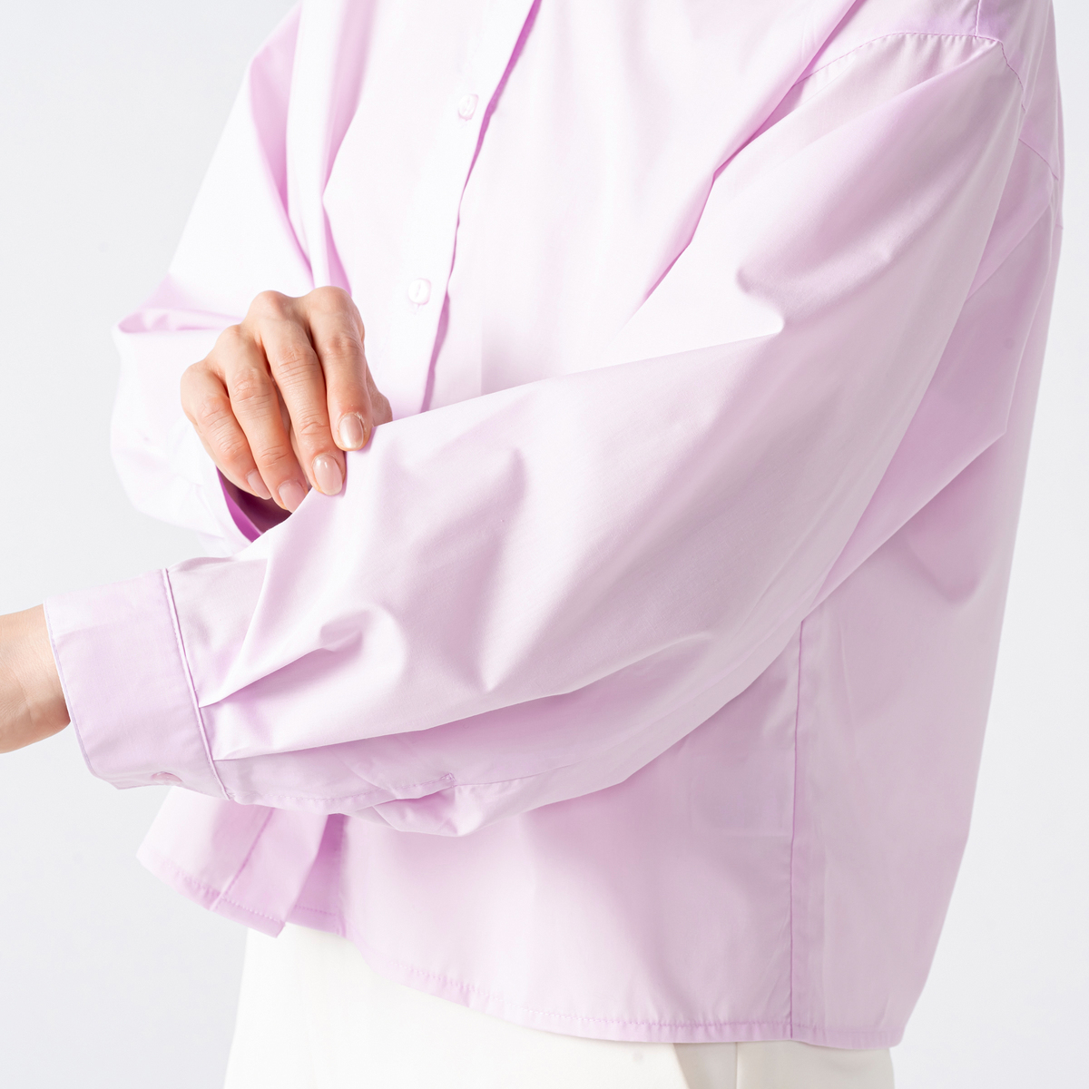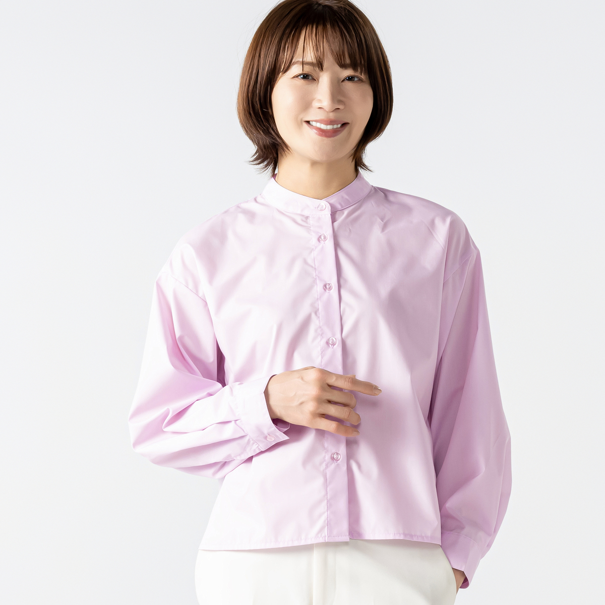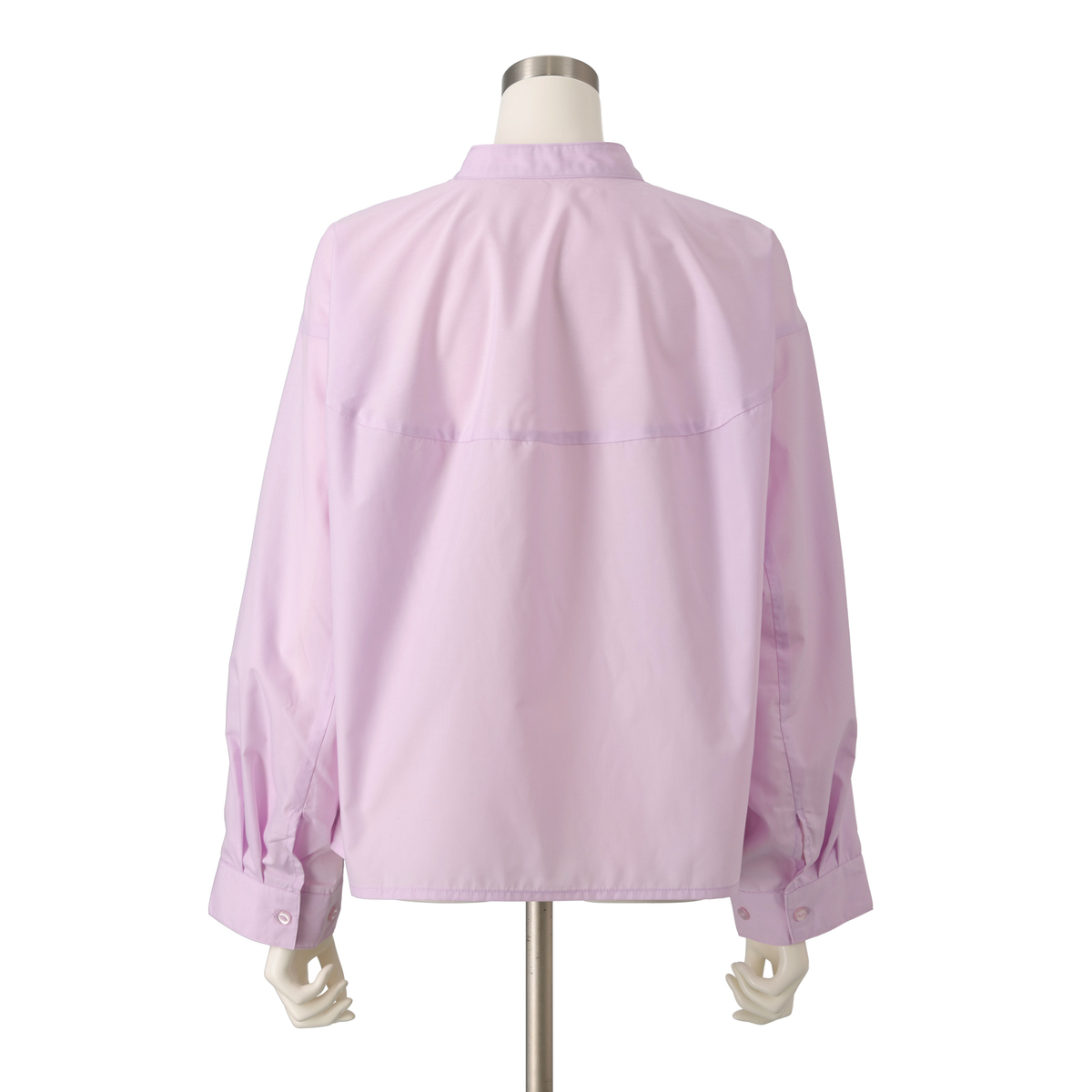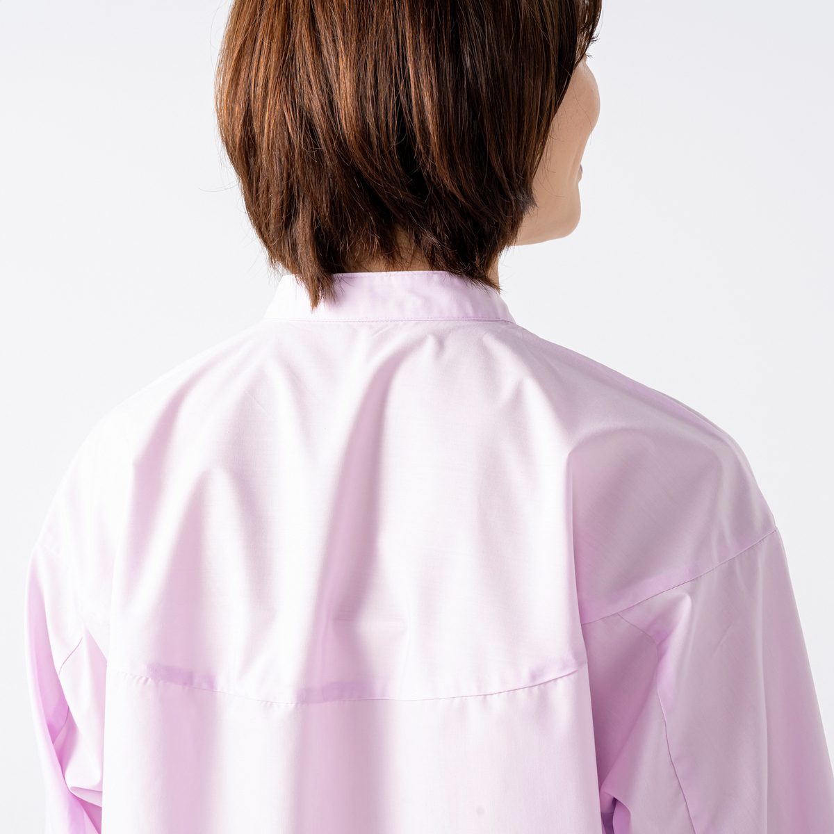 柔らかな丸みを持たせたコクーンシルエットのシャツ。スタンドカラーの衿が首元をすっきり見せてくれます