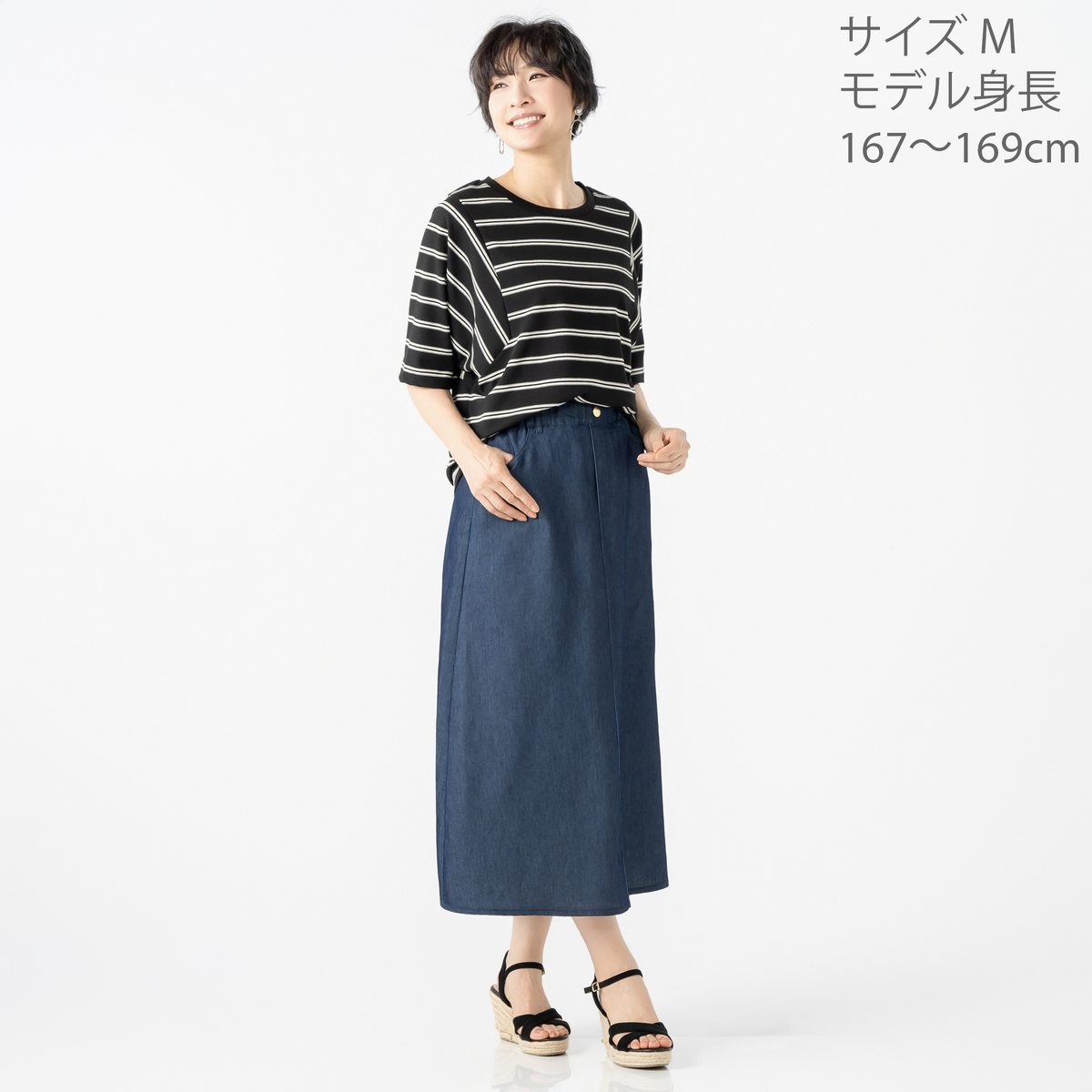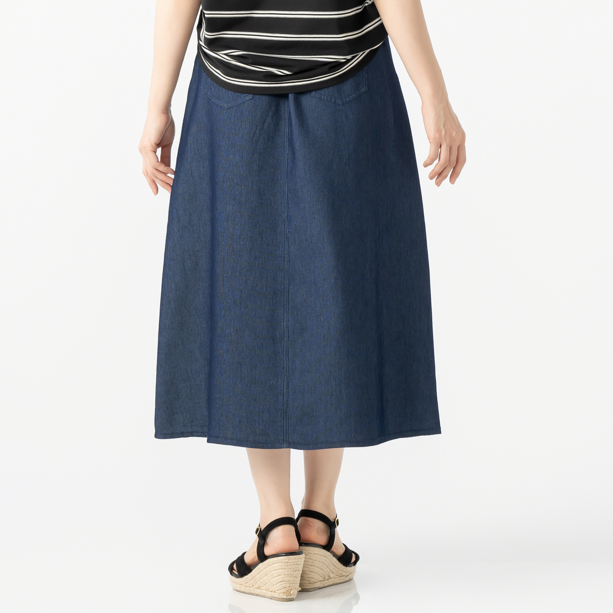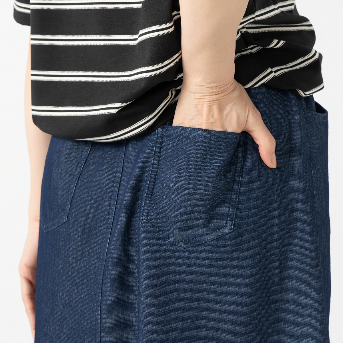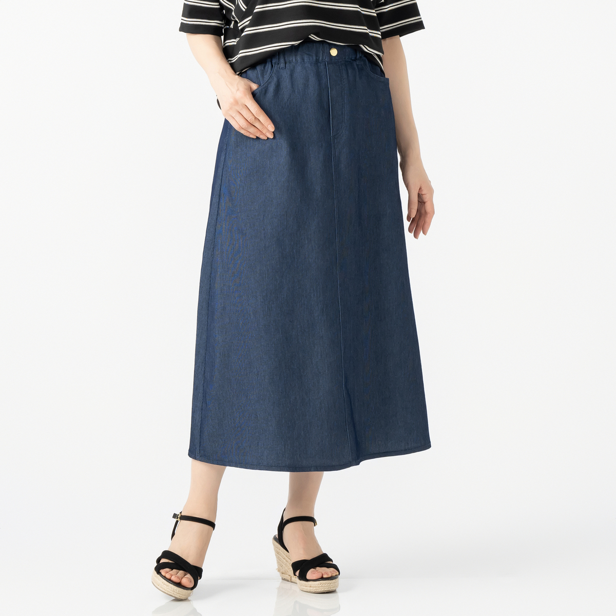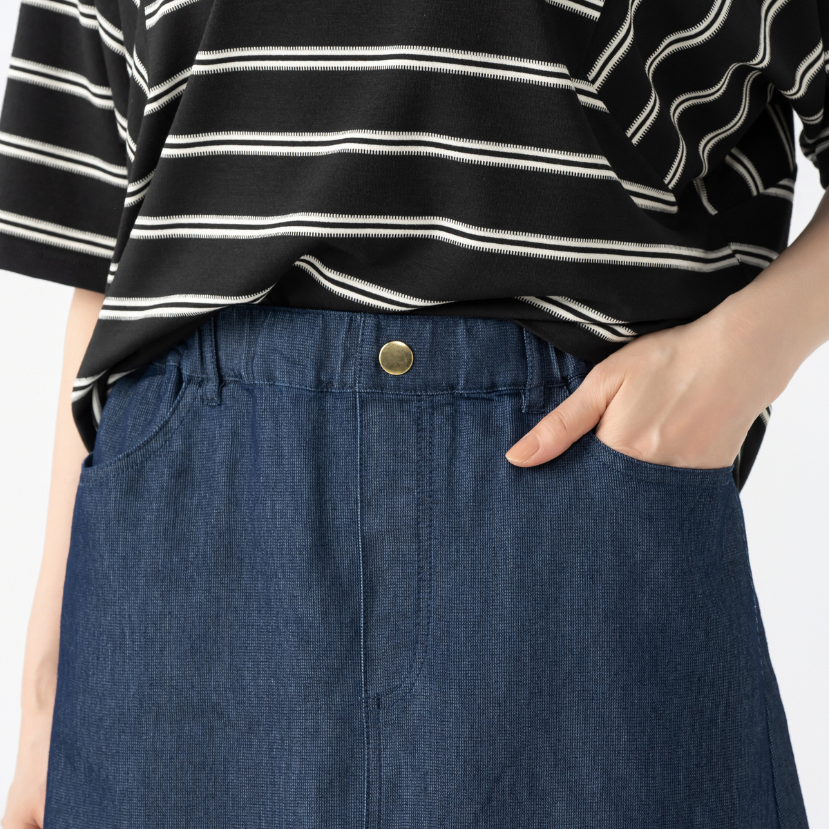 ライトオンスの裏メッシュデニム素材を使用したスカート。通気性があり軽やかで、メッシュ独特の凹凸感がある綿混素材により、肌離れも良くサラサラの着心地です。肌に触れる面がメッシュ構造になっているため、ガーゼタッチの爽やかな肌触りです