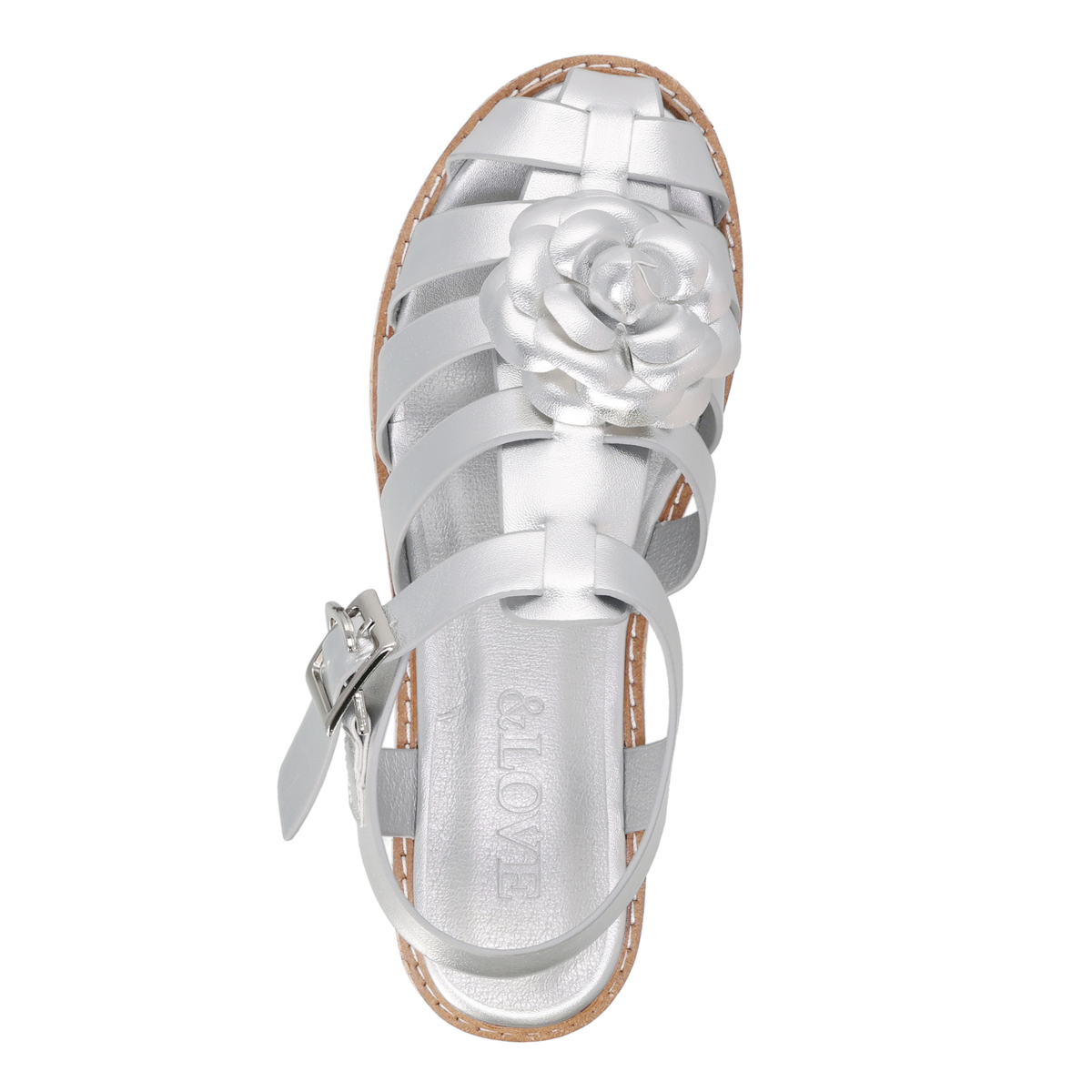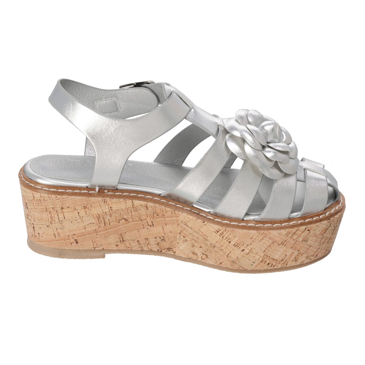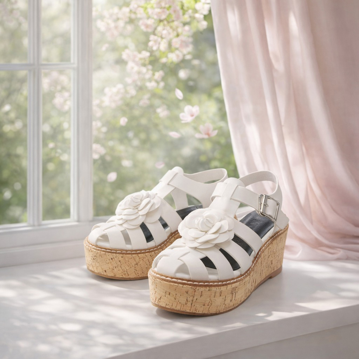 立体感のあるカメリアモチーフが華やかなグルカサンダル。編み込み風ストラップがやさしく足を包み込み、程良い高さのウェッジソールでスタイルアップを叶えます