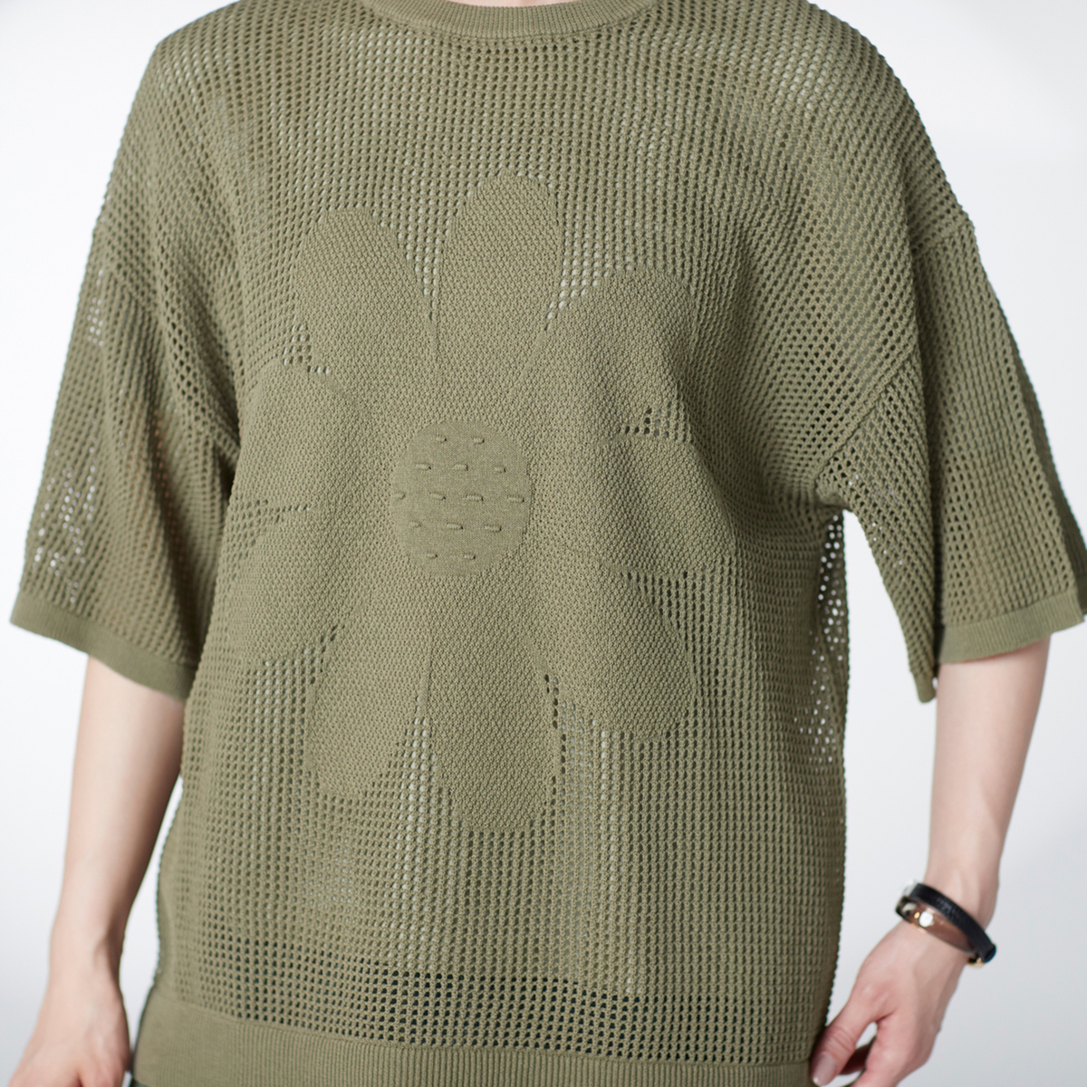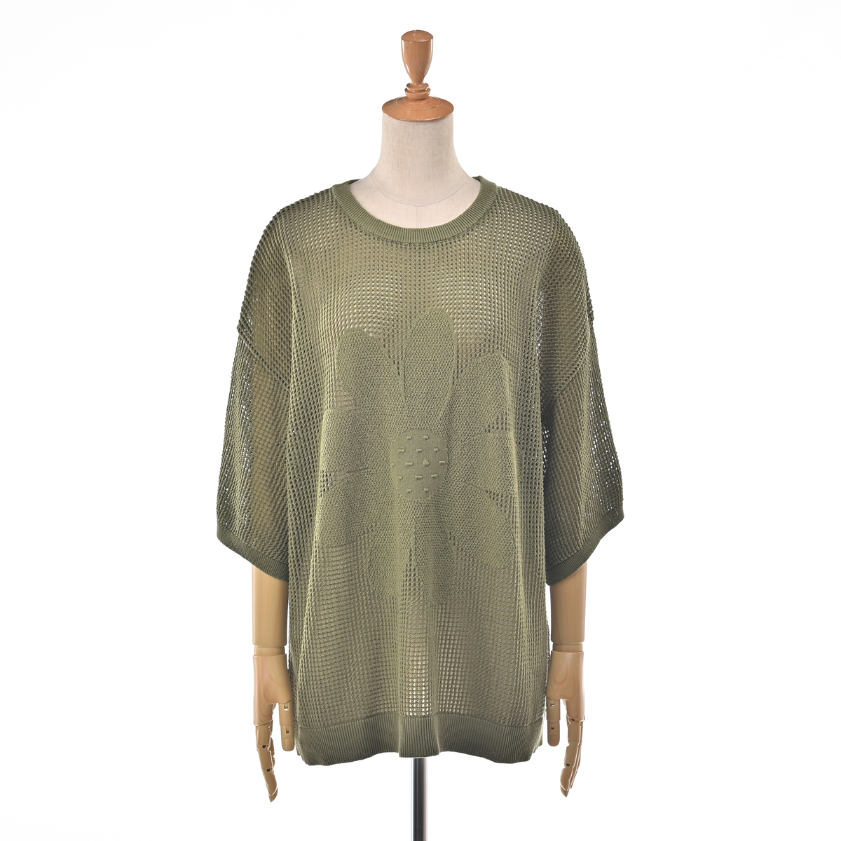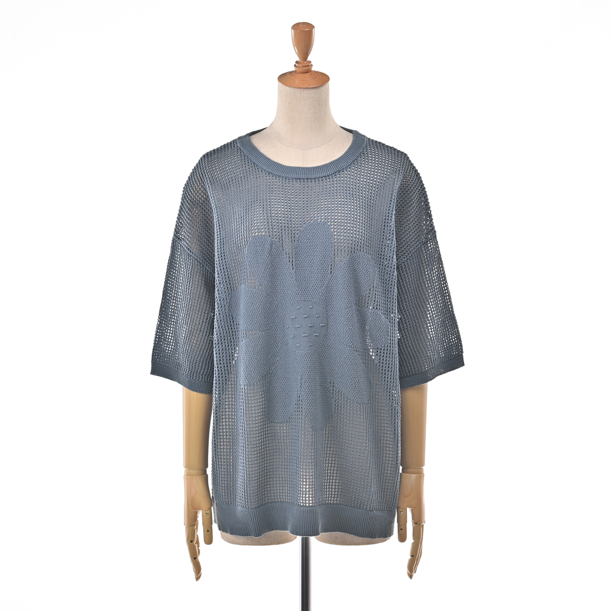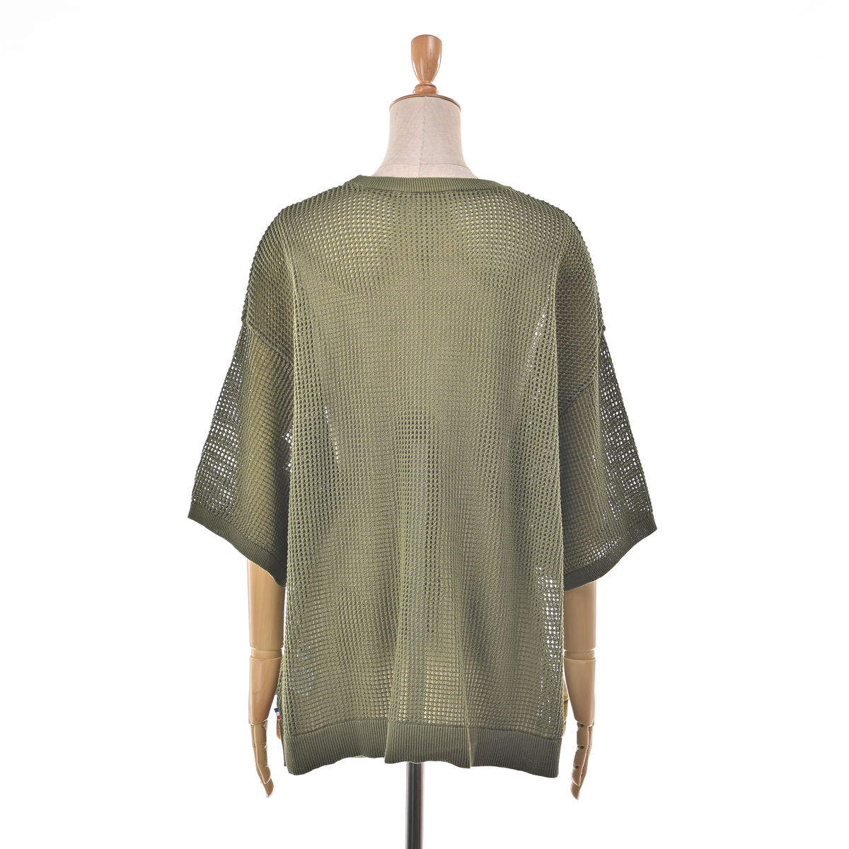 メッシュ素材の半袖ニットです。さらりとした肌触りで、晩夏まで活躍する軽やかな着用感。ゆったりと落ち感のあるシルエットでボディラインを拾いにくく、袖は肘まで隠れる長さです。透け感のある編み地で、様々なレイヤードコーデが映えます