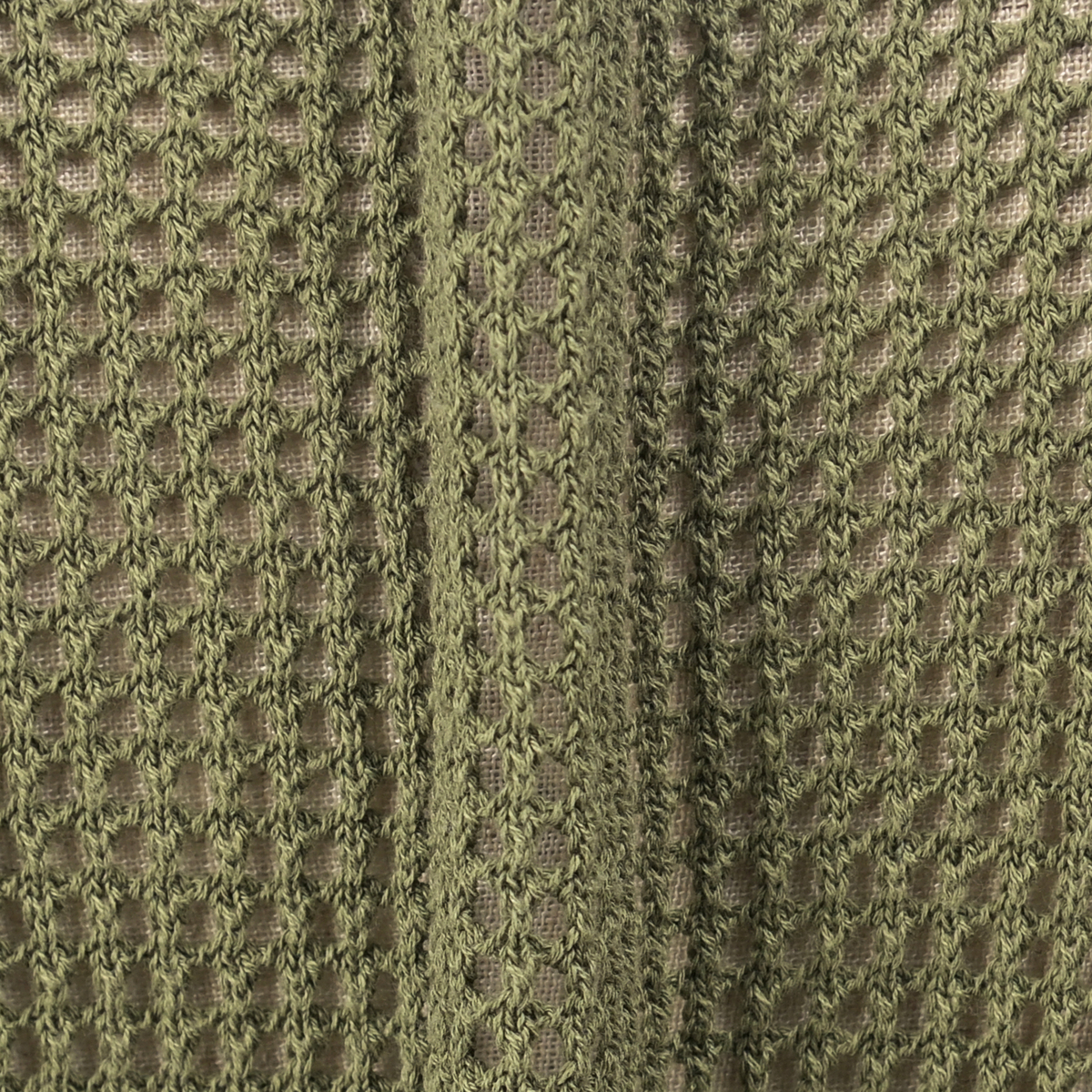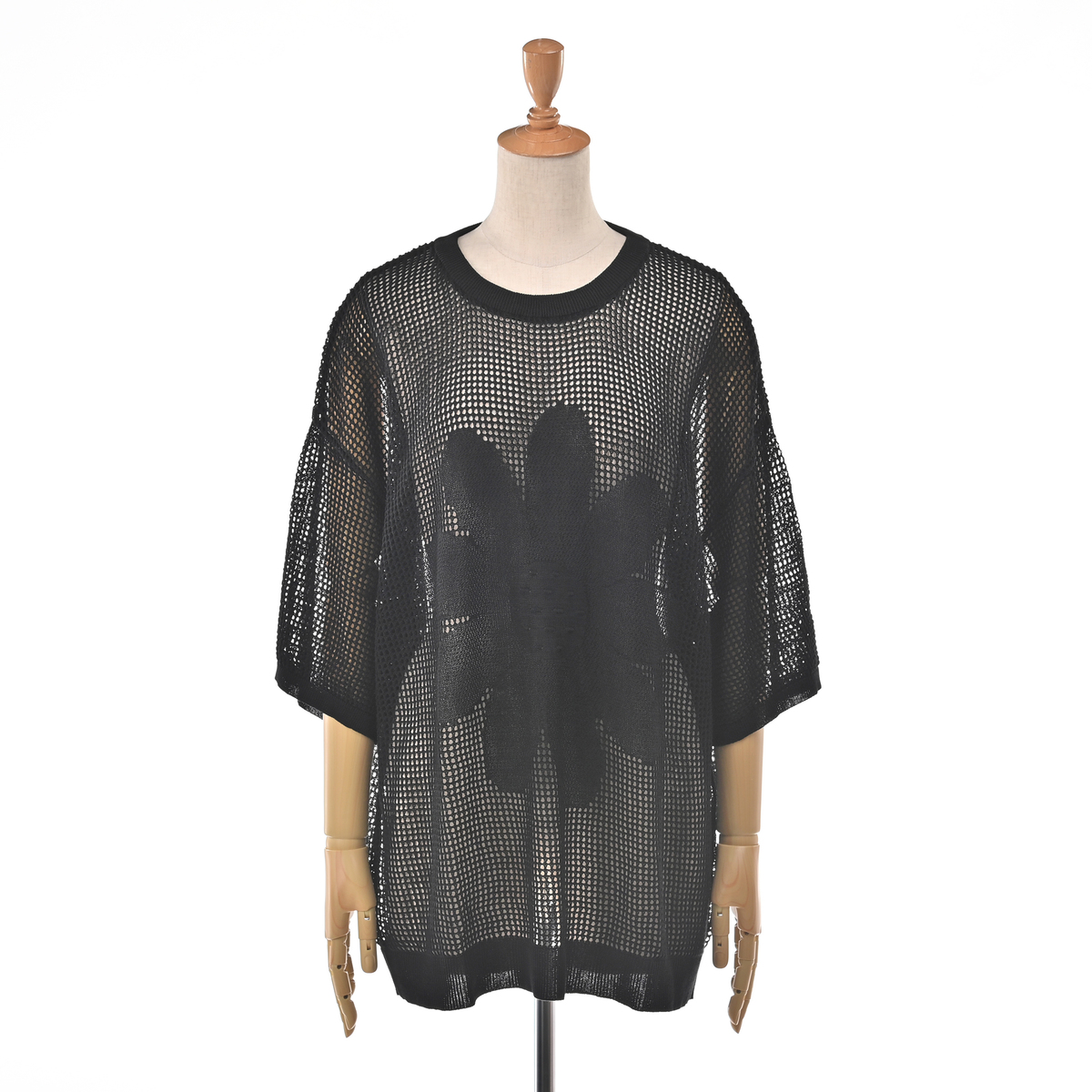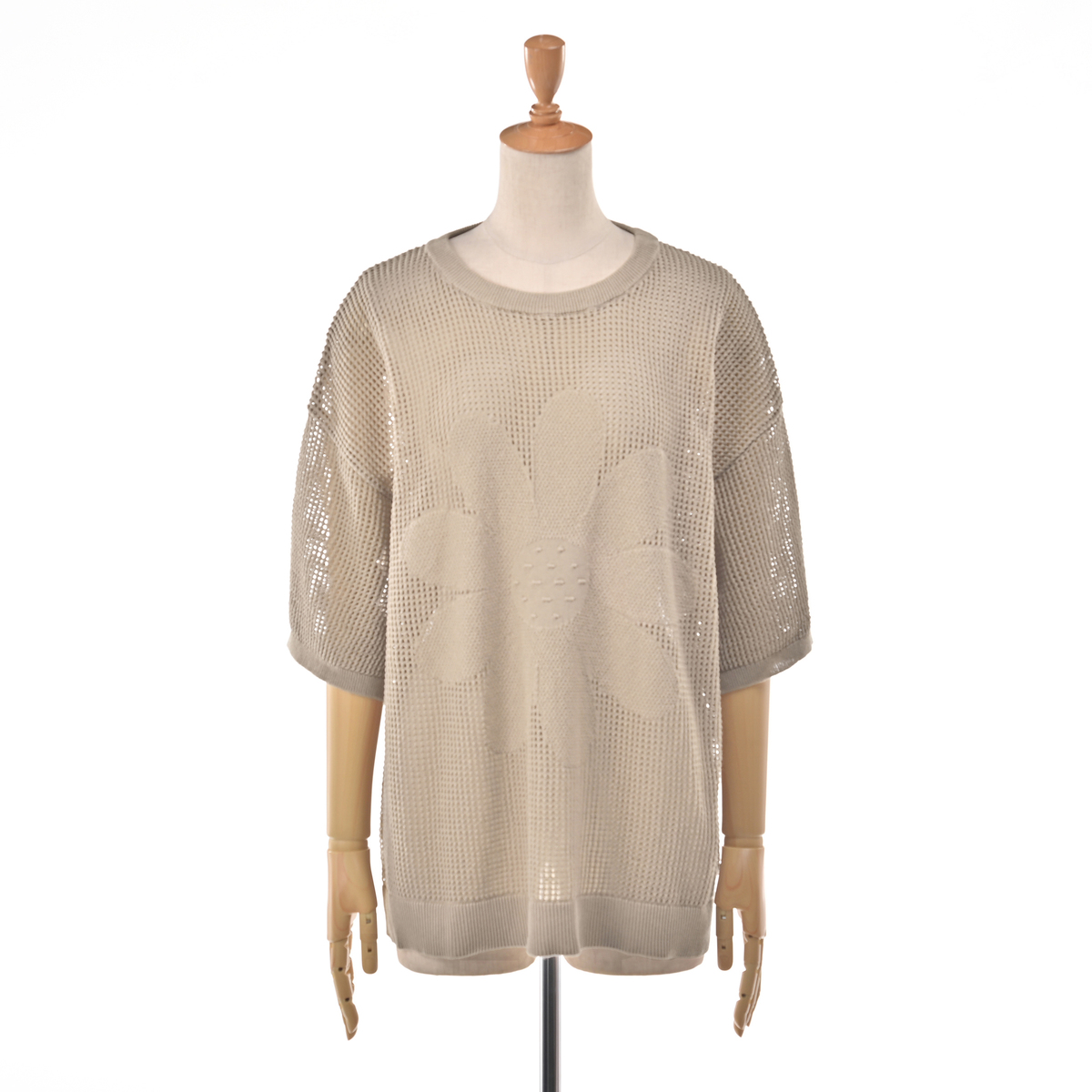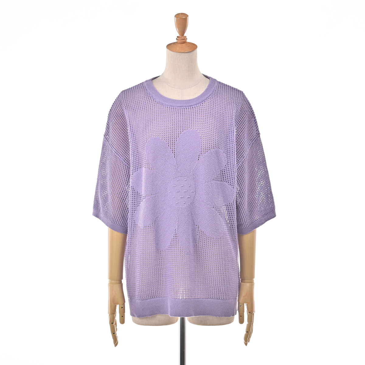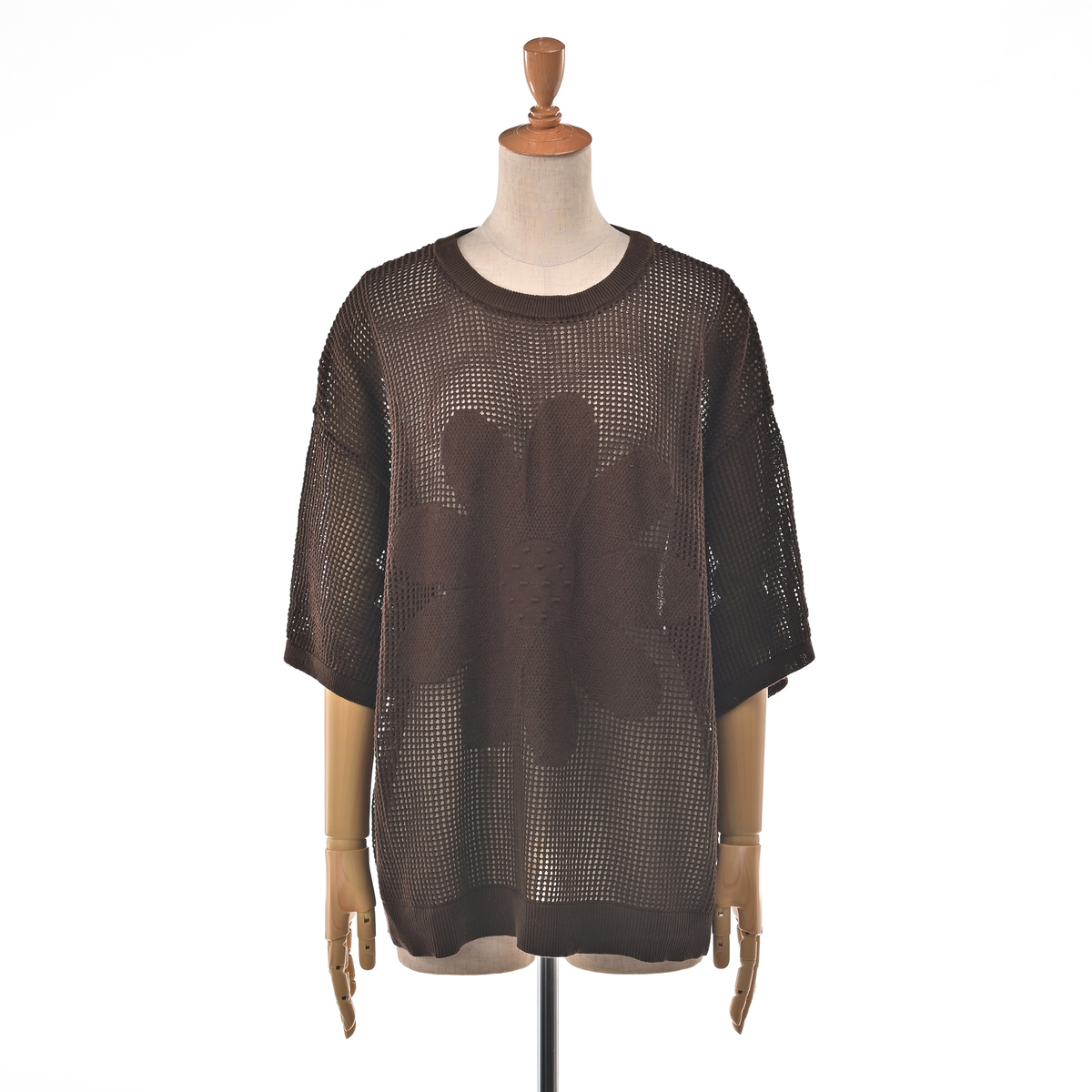 メッシュ素材の半袖ニットです。さらりとした肌触りで、晩夏まで活躍する軽やかな着用感。ゆったりと落ち感のあるシルエットでボディラインを拾いにくく、袖は肘まで隠れる長さです。透け感のある編み地で、様々なレイヤードコーデが映えます