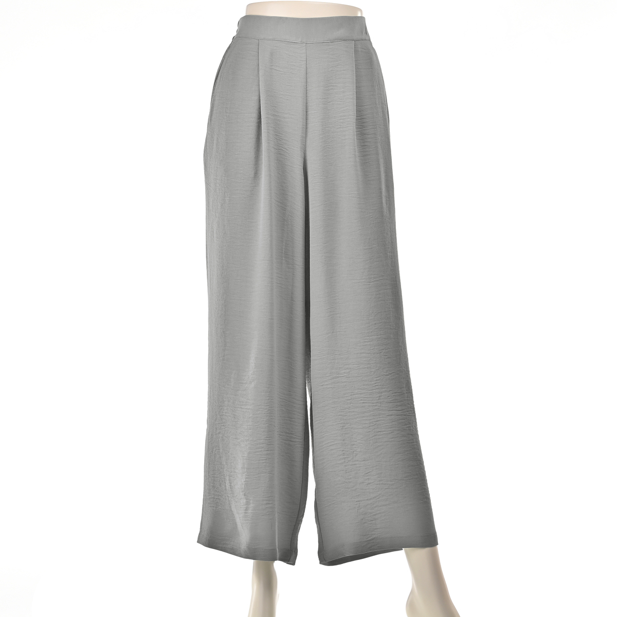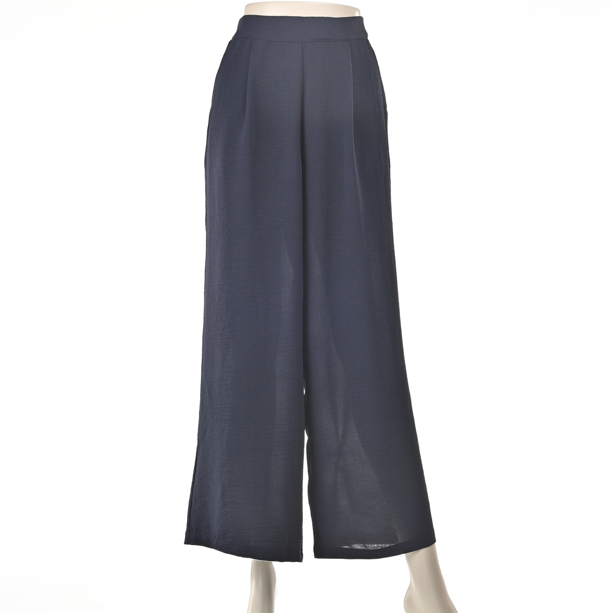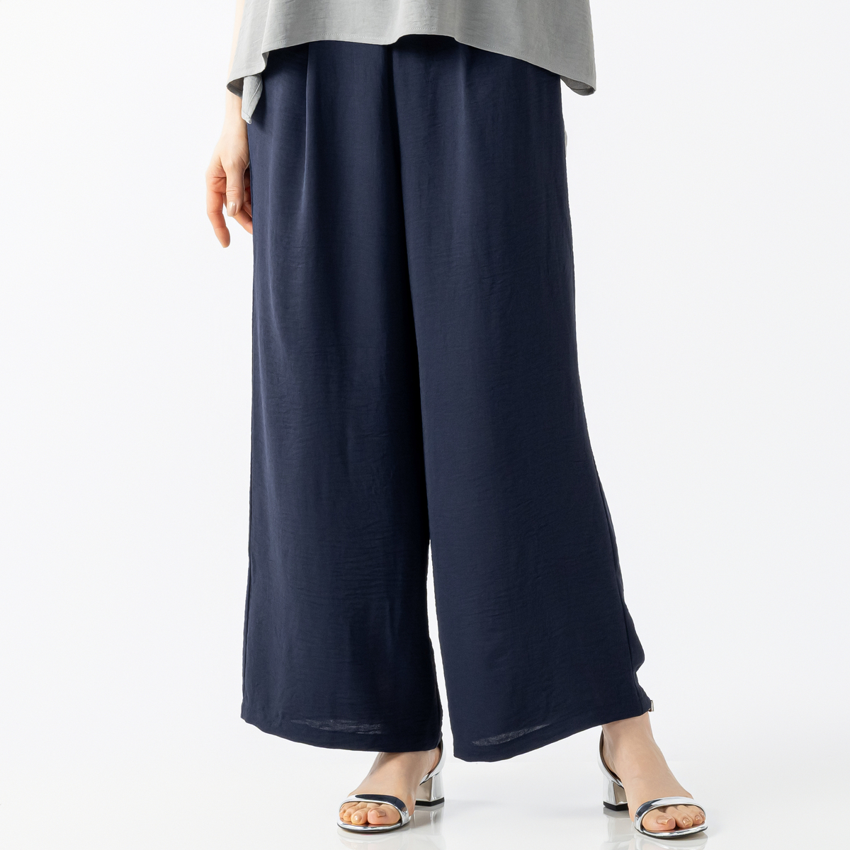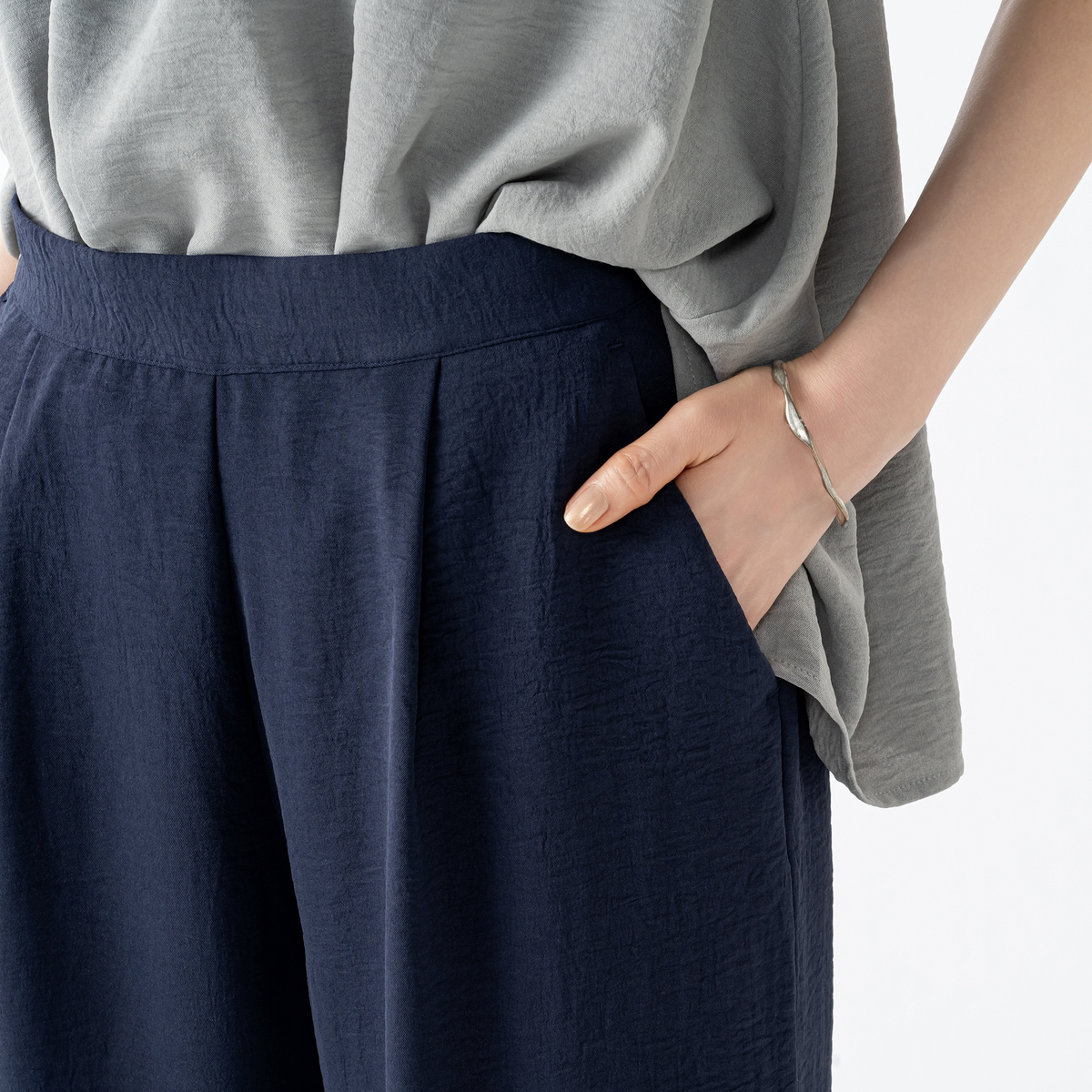 生地の落ち感を生かし、腰まわりの立体感にこだわったワイドパンツ。前ウエストにタック、後ろにギャザーを入れて横広がりを抑えた構造です。ヒップから裾は落ち感を計算したワイドパターンで、脚が入ることで奥行が生まれ、全体のラインが整います