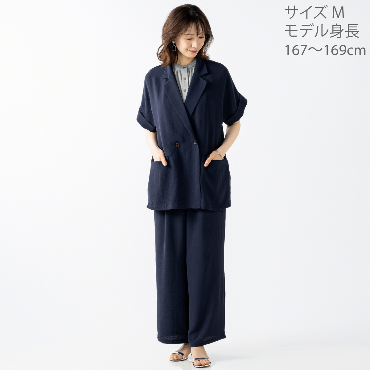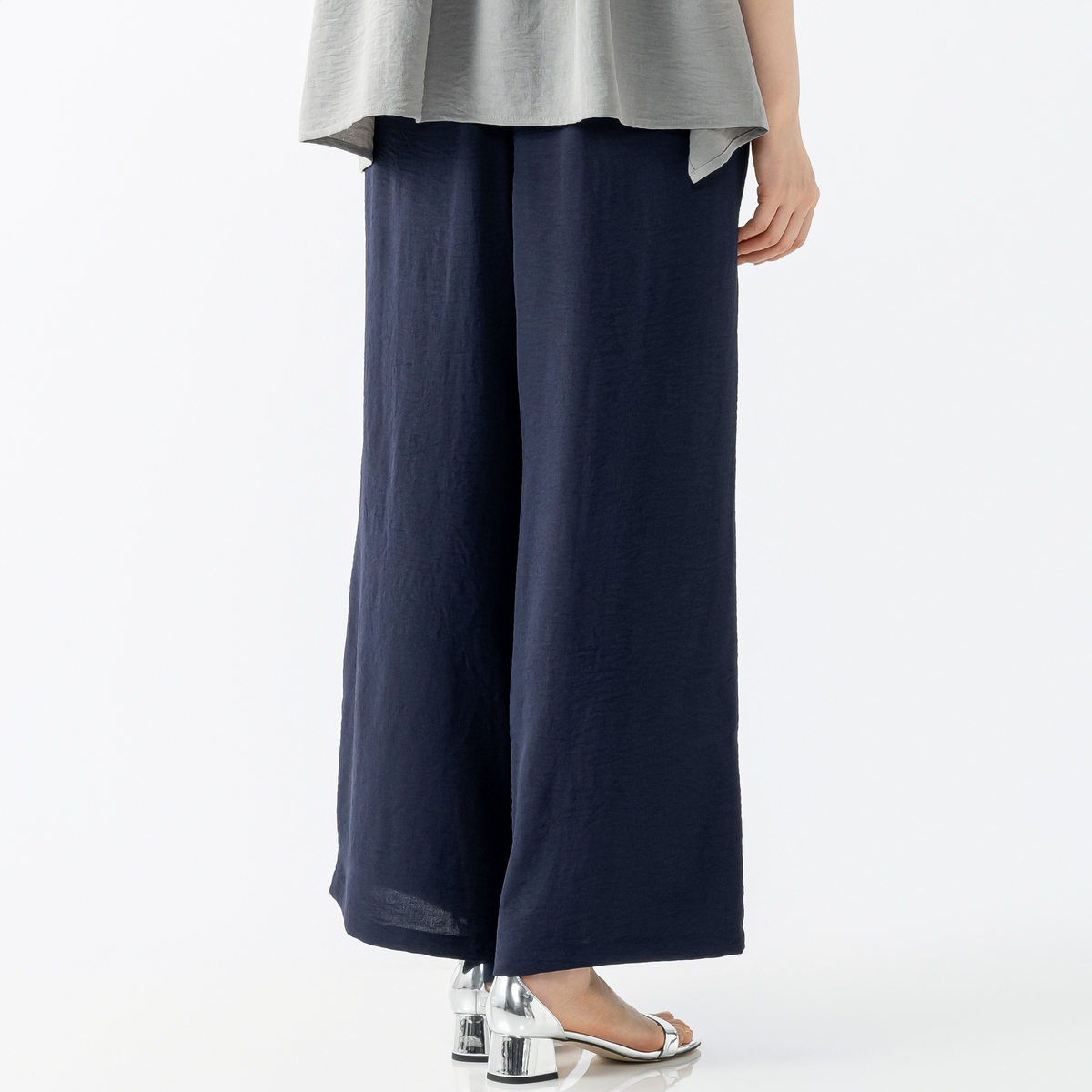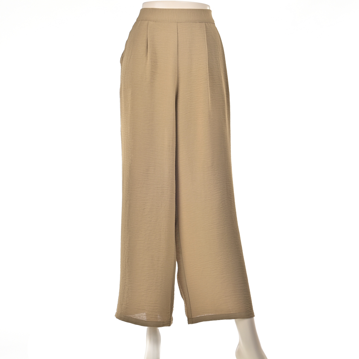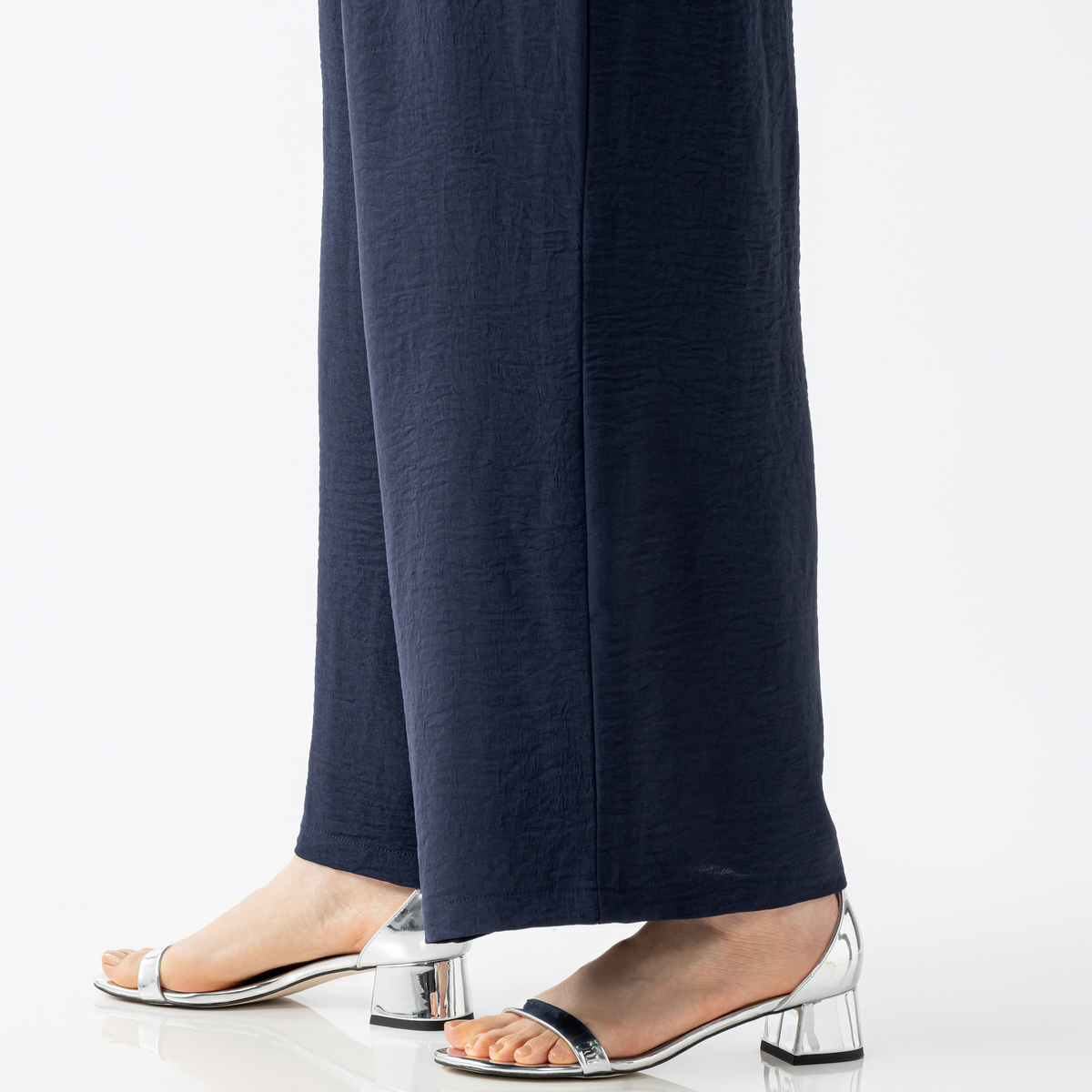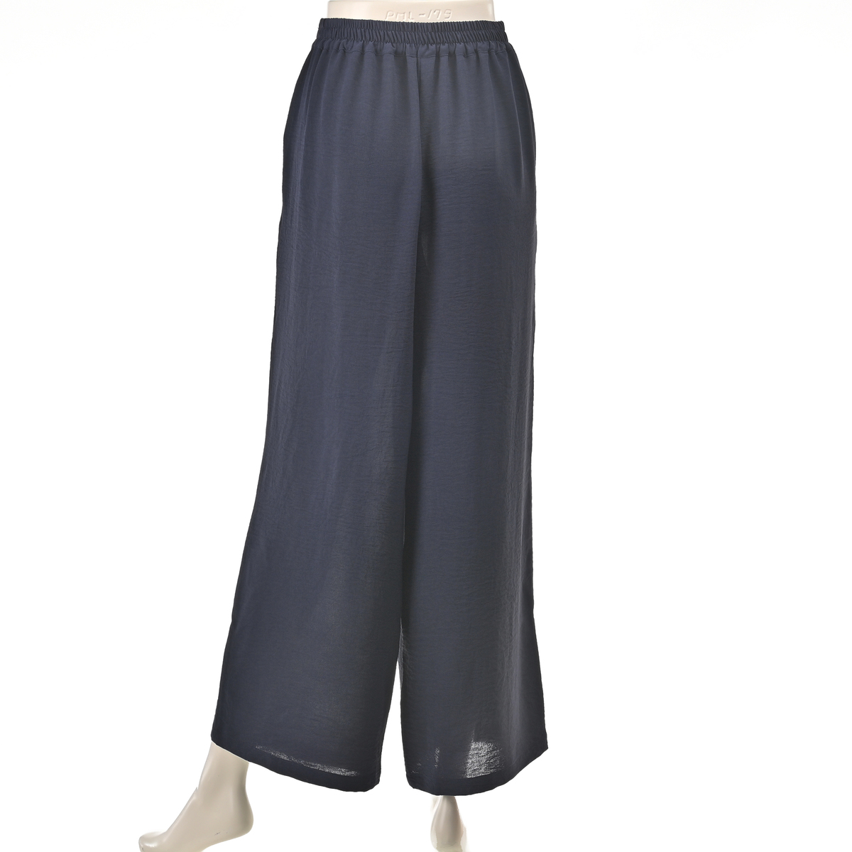 生地の落ち感を生かし、腰まわりの立体感にこだわったワイドパンツ。前ウエストにタック、後ろにギャザーを入れて横広がりを抑えた構造です。ヒップから裾は落ち感を計算したワイドパターンで、脚が入ることで奥行が生まれ、全体のラインが整います