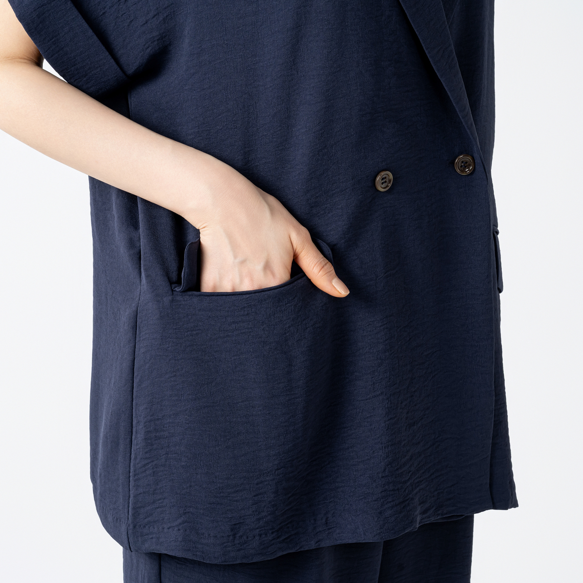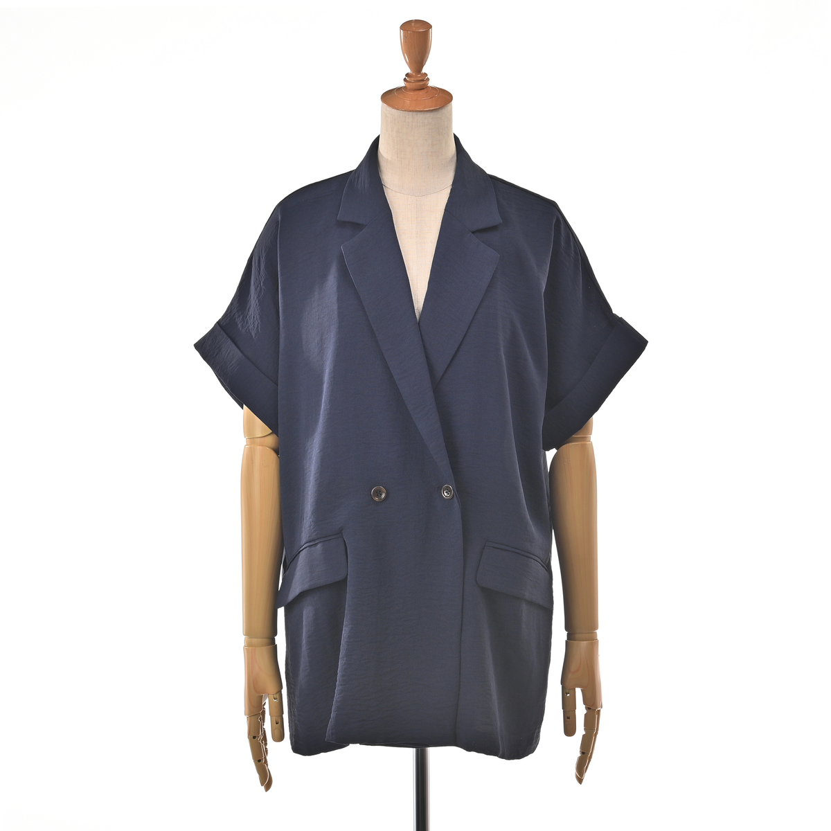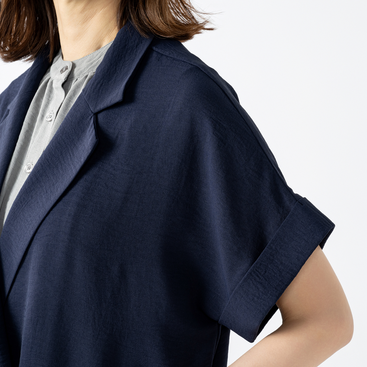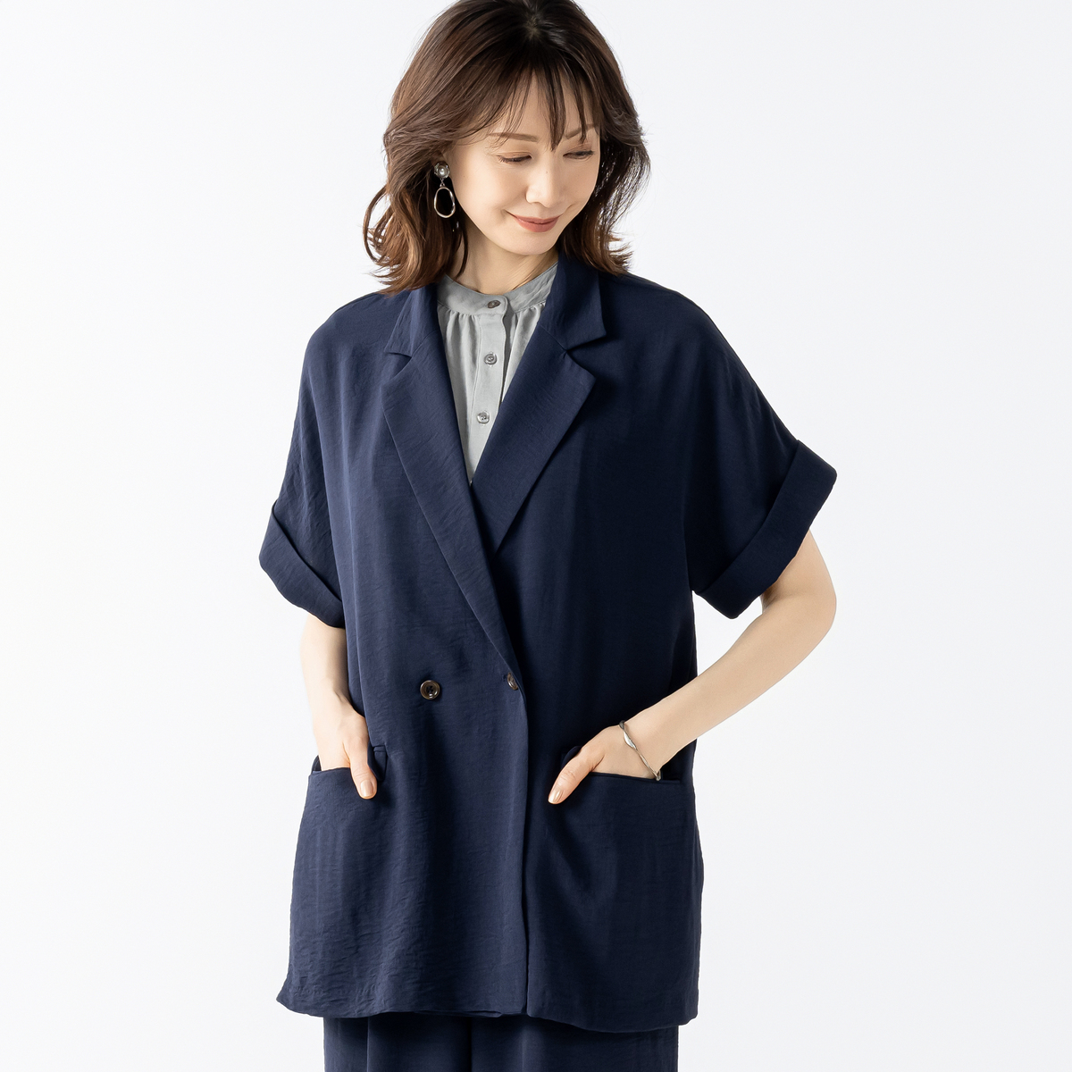 半袖ジャケットとしてトレンド感を取り入れ、ブラウンのボタンやフラップポケットがメリハリをプラス。カーディガン感覚で羽織れて、冷房対策やお出かけにも活躍します