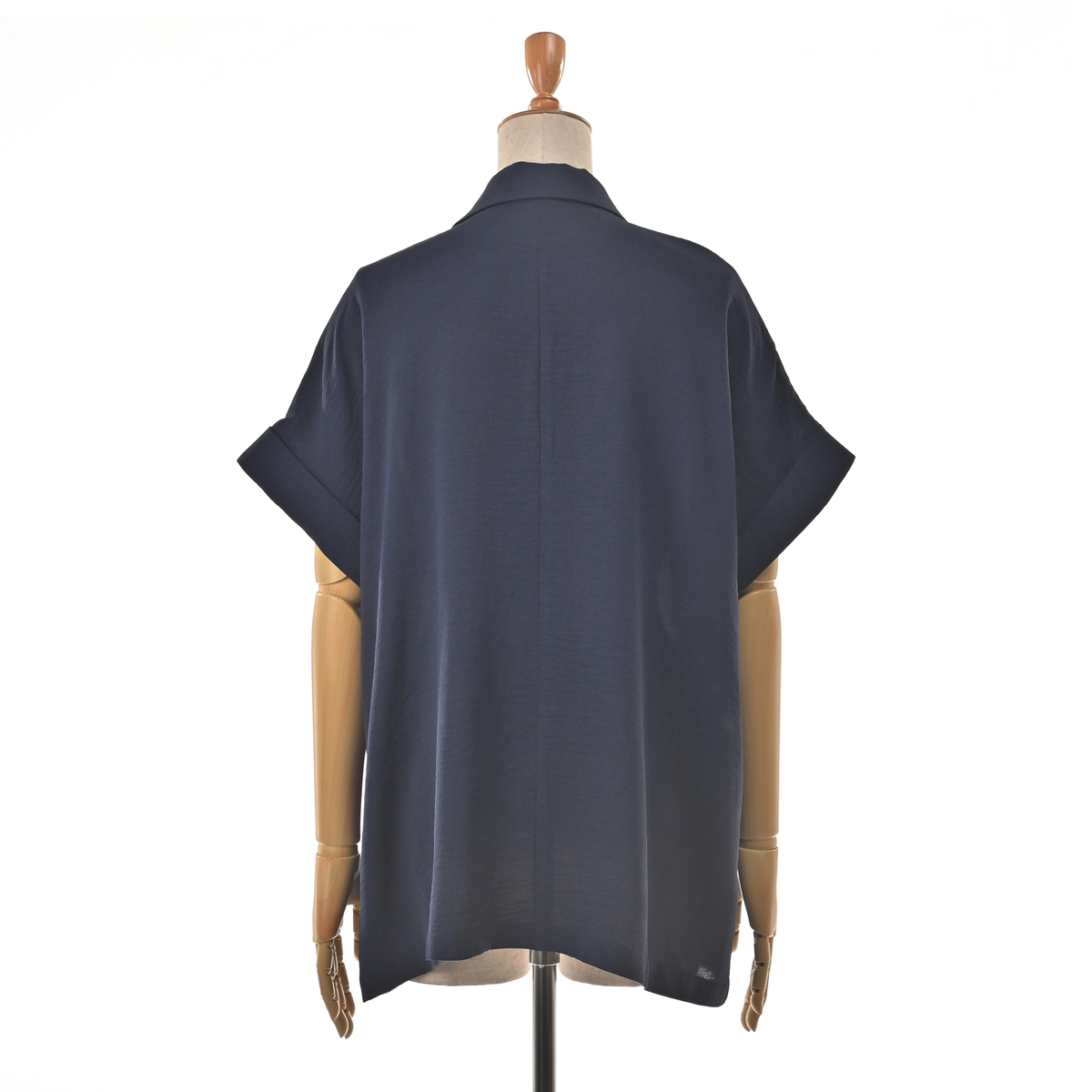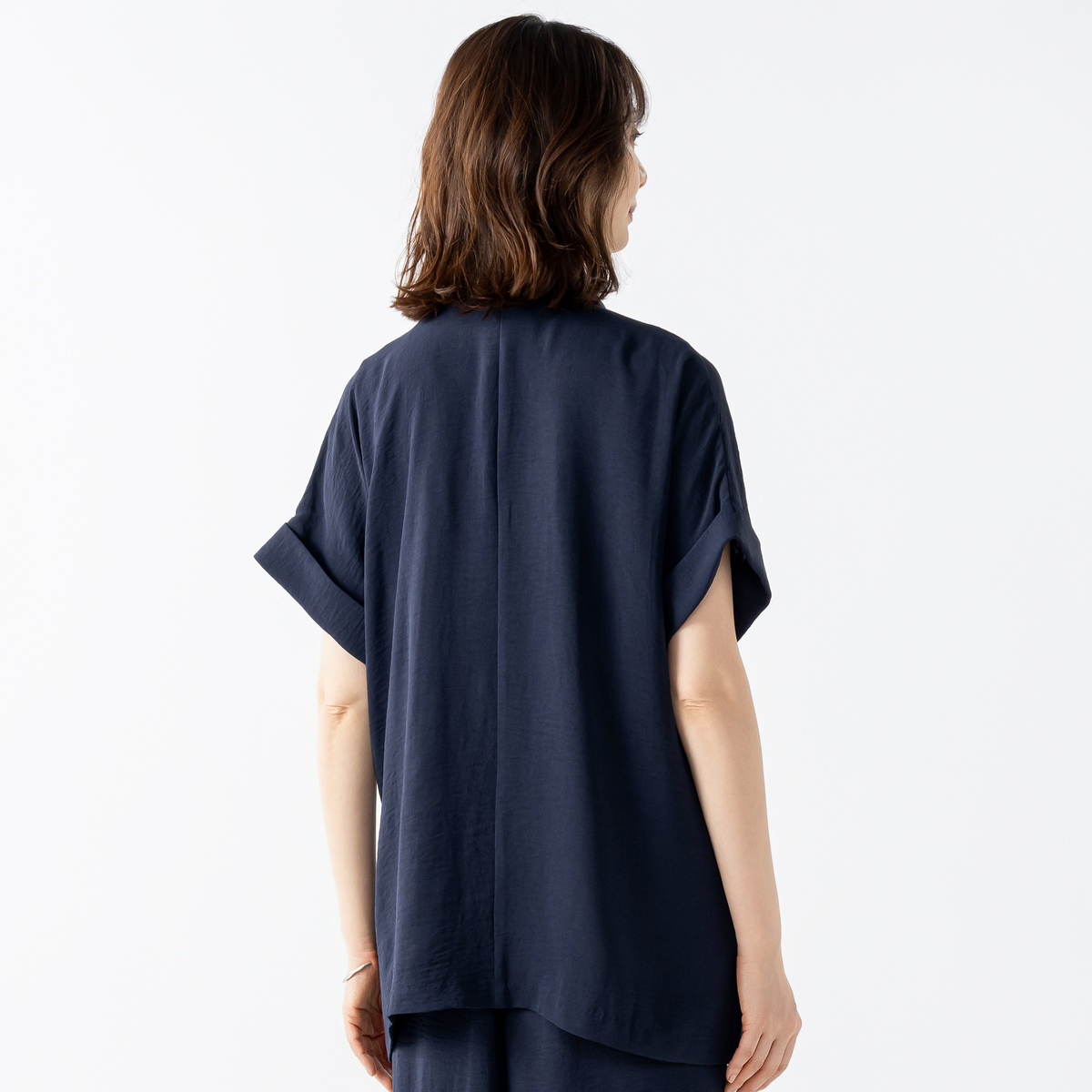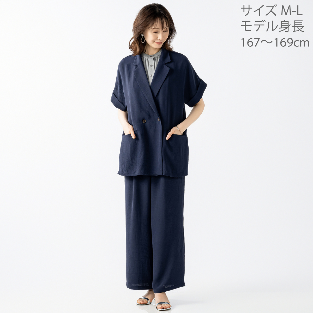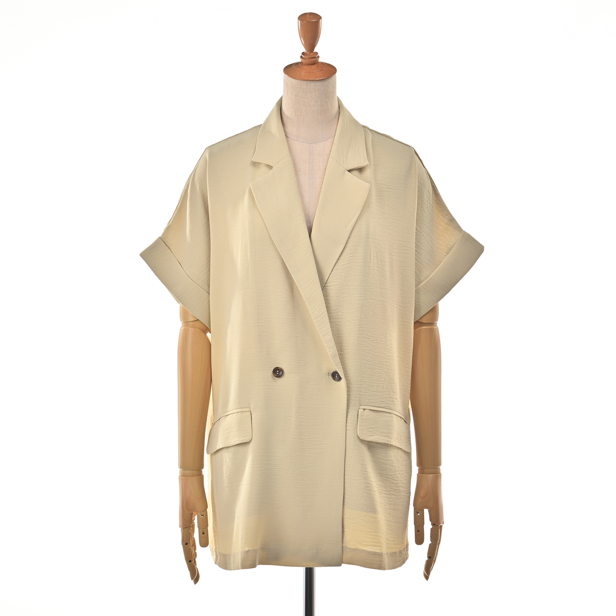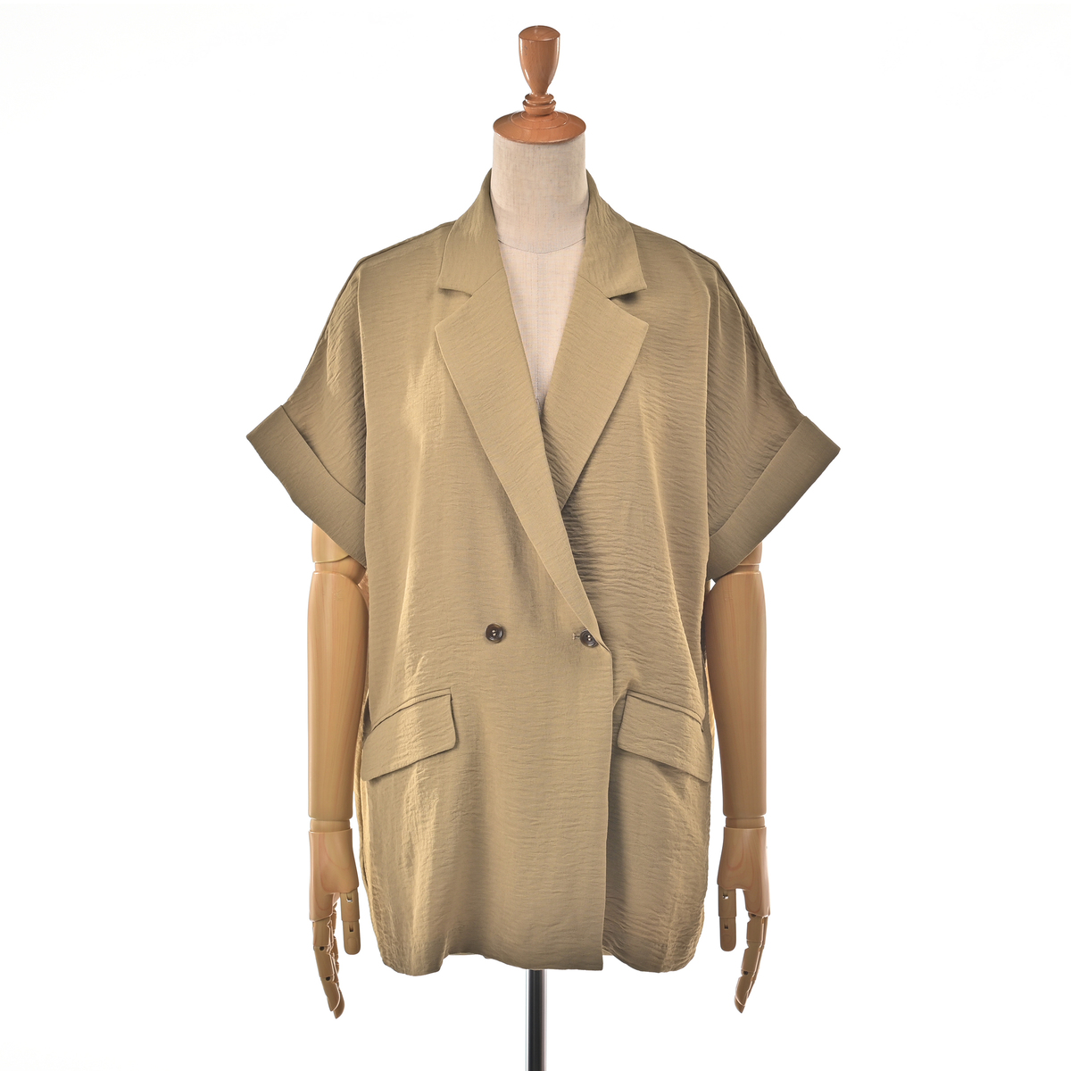 半袖ジャケットとしてトレンド感を取り入れ、ブラウンのボタンやフラップポケットがメリハリをプラス。カーディガン感覚で羽織れて、冷房対策やお出かけにも活躍します
