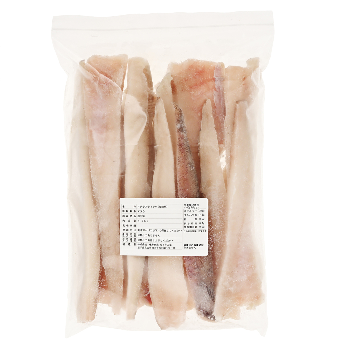 [アレルギー物質特定原材料8品目] なし [内容量] 1.2kg [賞味期限] 出荷時点で賞味期限まで180日以上ある商品をお届けします [保存方法] 要冷凍(ー18℃以下)で保存してください [お召し上がり方] 加熱してお召し上がりください [注意事項] ※生食は避けてください [原料原産地] マダラ(岩手県) [原産国] 日本 [原材料] マダラ 原産地名:岩手県