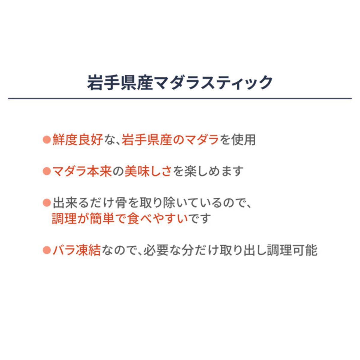 岩手県で水揚げされたマダラを岩手県で加工したマダラスティック。匂いが出やすいマタラですが鮮度が良いので、マダラ本来の美味しさを楽しめます
