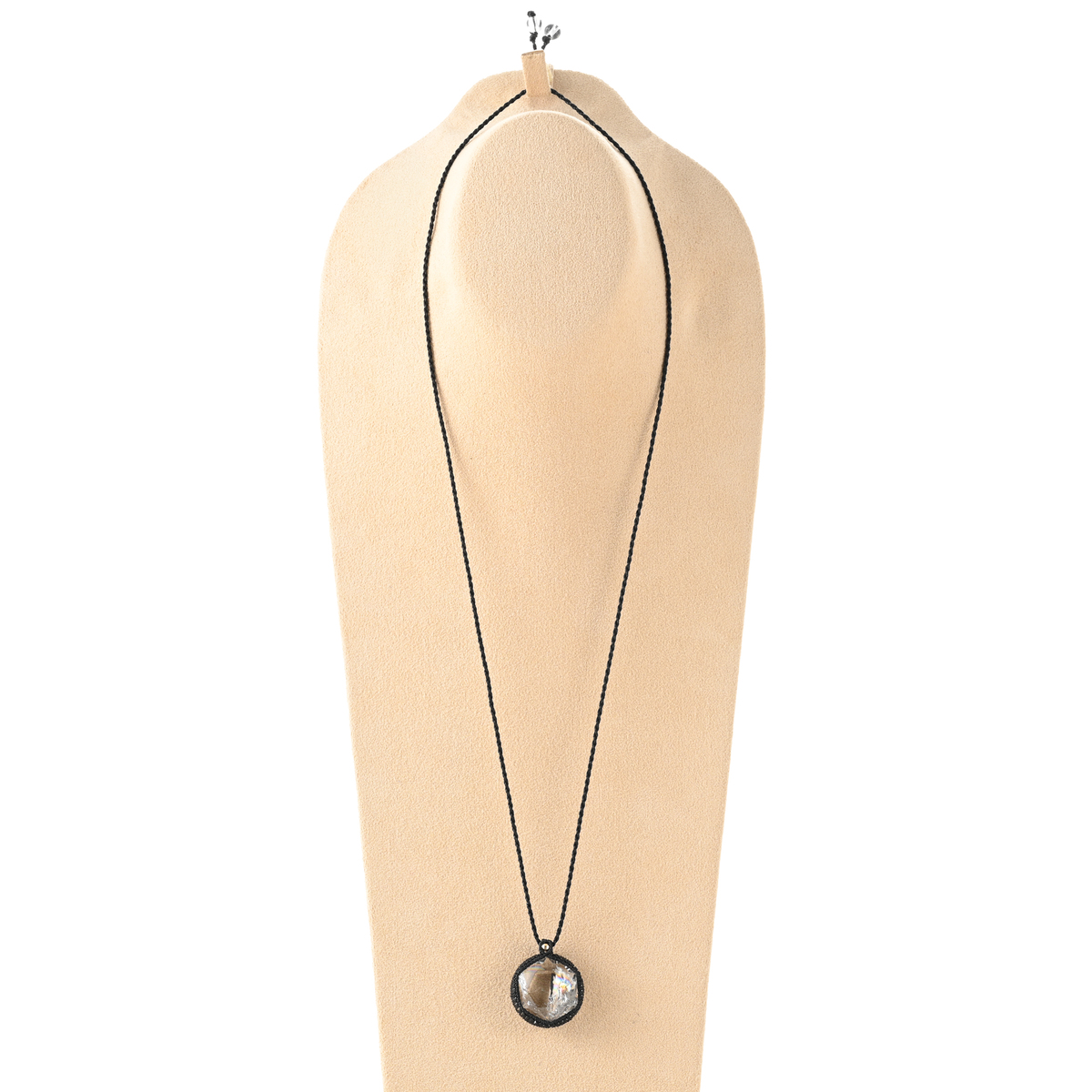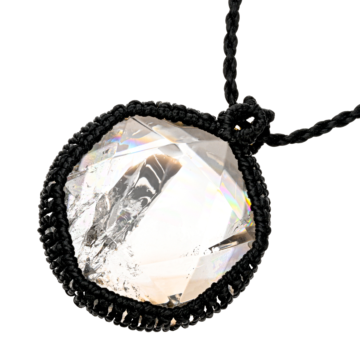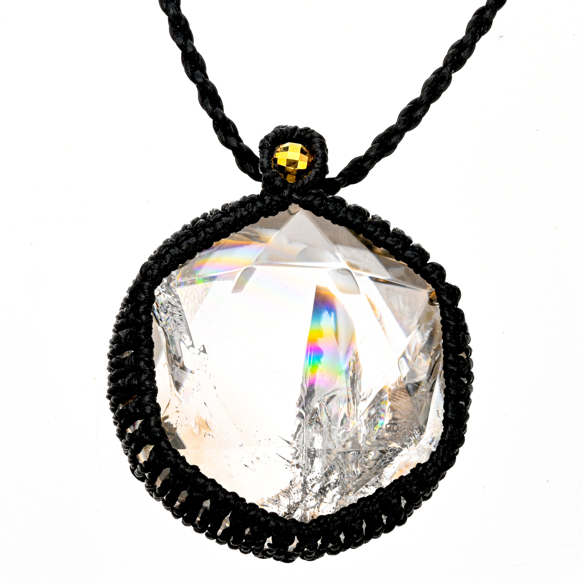 クラック(内部のヒビ)によって、内部に虹色のイリデッセンスが見えるクォーツを使用した、マクラメ編みのネックレスです