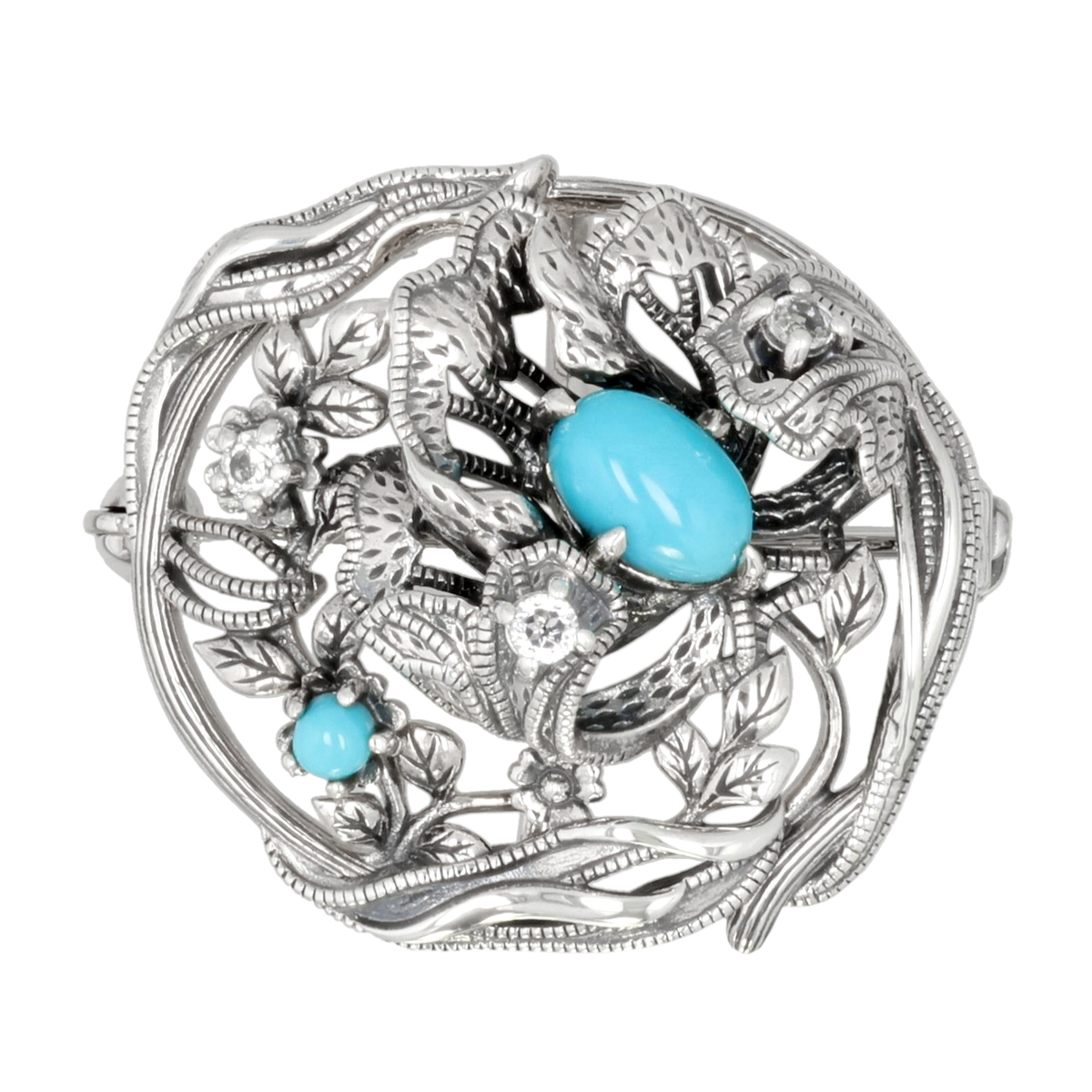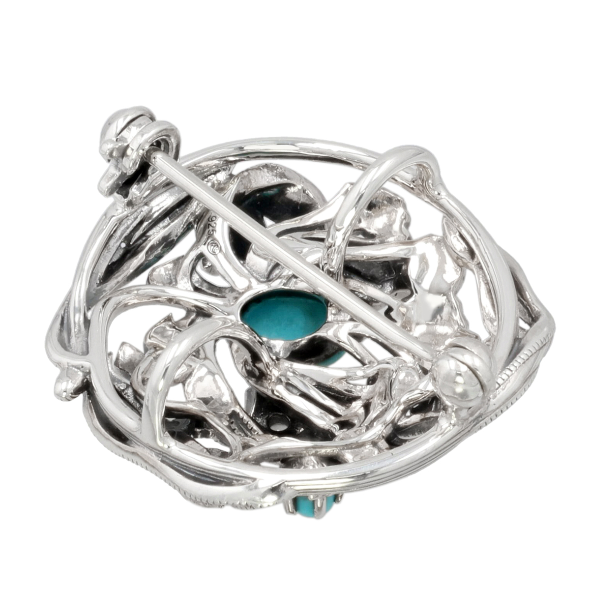 素材: [トルコ石] オーバルシェイプ・カボションカット 爪留め/接着 1石、ラウンドシェイプ・カボションカット 爪留め/接着 1石 [ホワイトトパーズ] ラウンドカット 爪留め/接着 3石 [地金] シルバー925、シルバー [仕上げ] アンティーク仕上げ 総重量(約) 4.2g バチカンの内径(約) 5.0×4.6mm ヘッドの縦×横(約) 20.5×22.0mm(金具含まず) ■風車式ブローチピン付 ■素材の大きさ・形・色合い、製品のサイズは1点1点多少異なります ■専用ケース付 【タイ製】